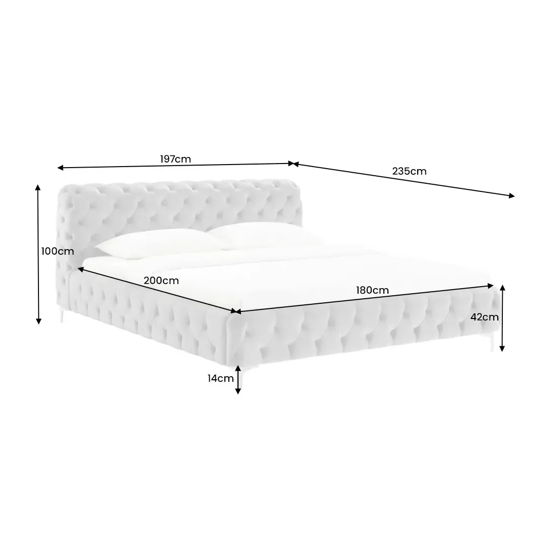La tête de lit imposante et les finitions Chesterfield accentuent son caractère luxueux, tandis que le revêtement en velours doux au toucher crée une atmosphère chaleureuse et confortable.