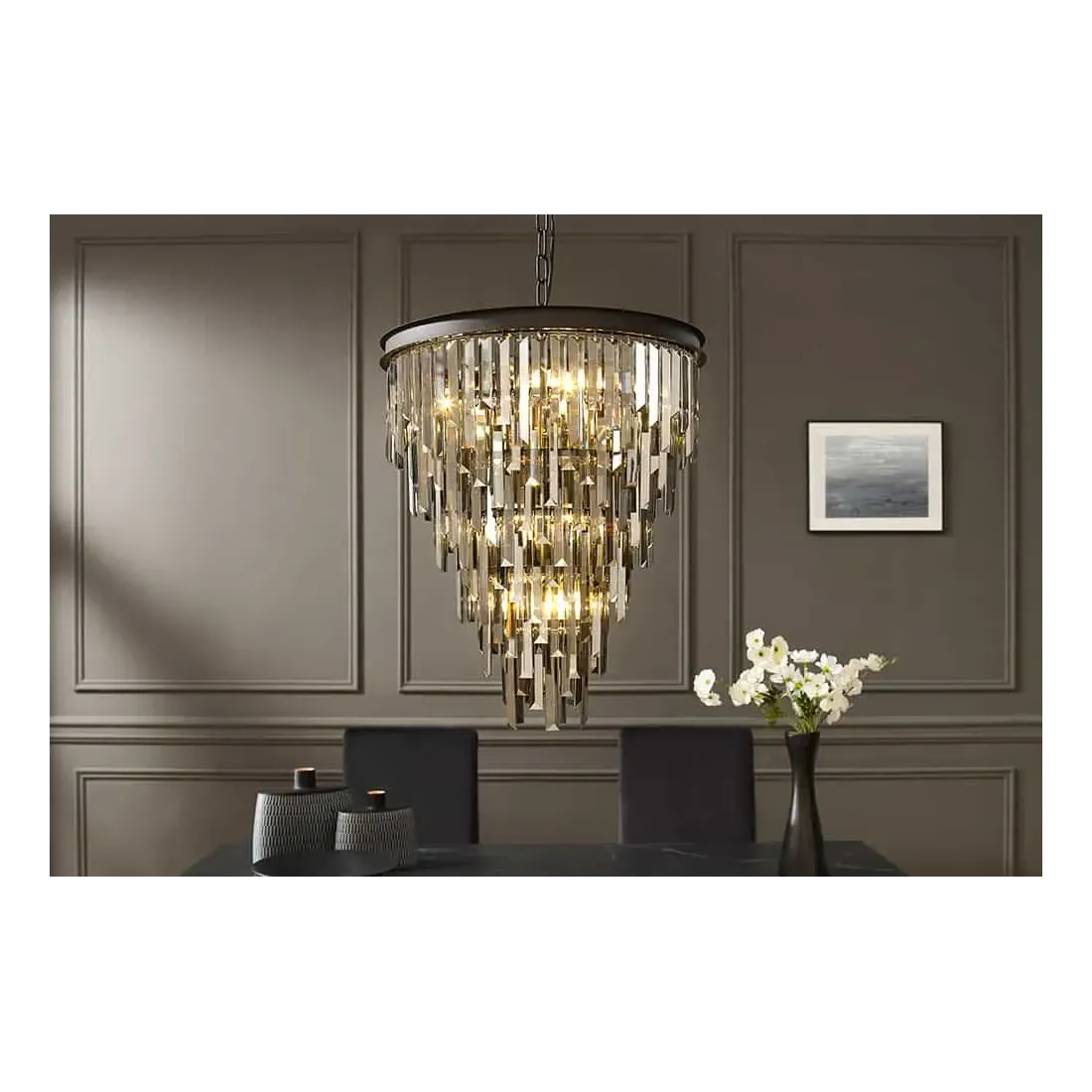 Illuminez votre pièce avec style et sophistication grâce au Kronleuchter KRISTALL 50cm. Chaque prisme en verre fumé capte la lumière pour créer un effet scintillant unique, transformant votre salon, salle à manger ou hall d’entrée en un espace chic et accueillant.