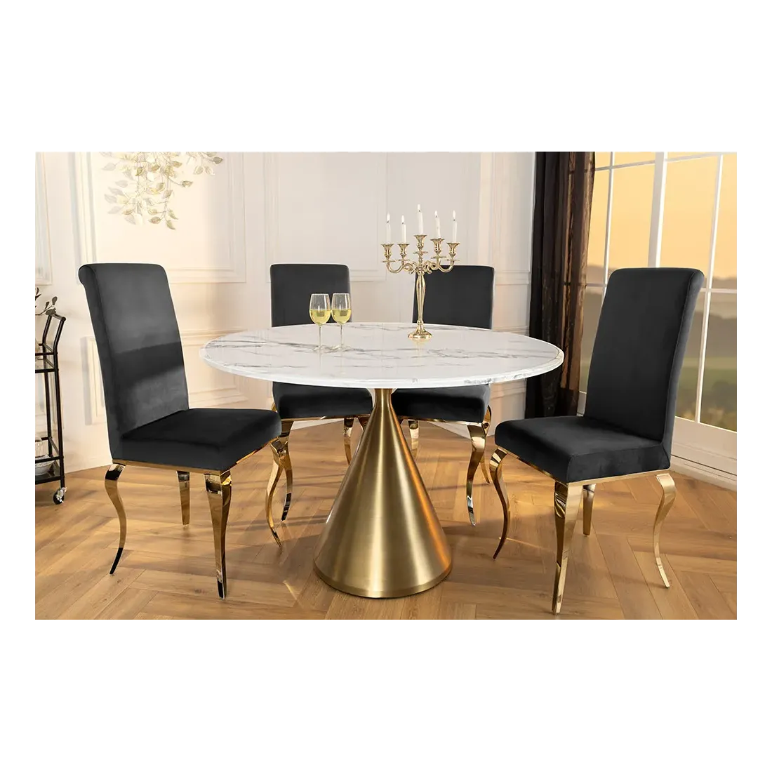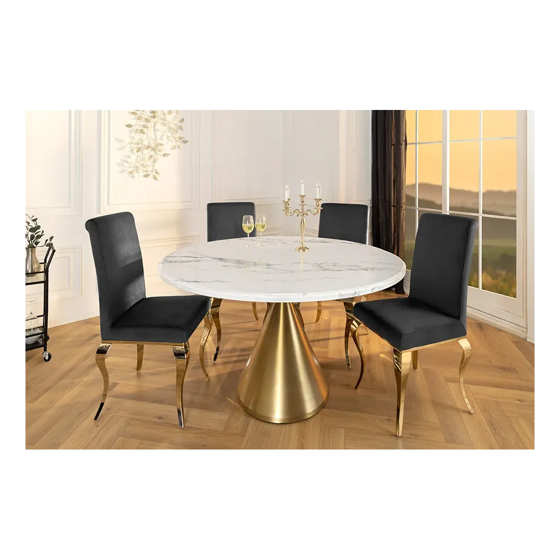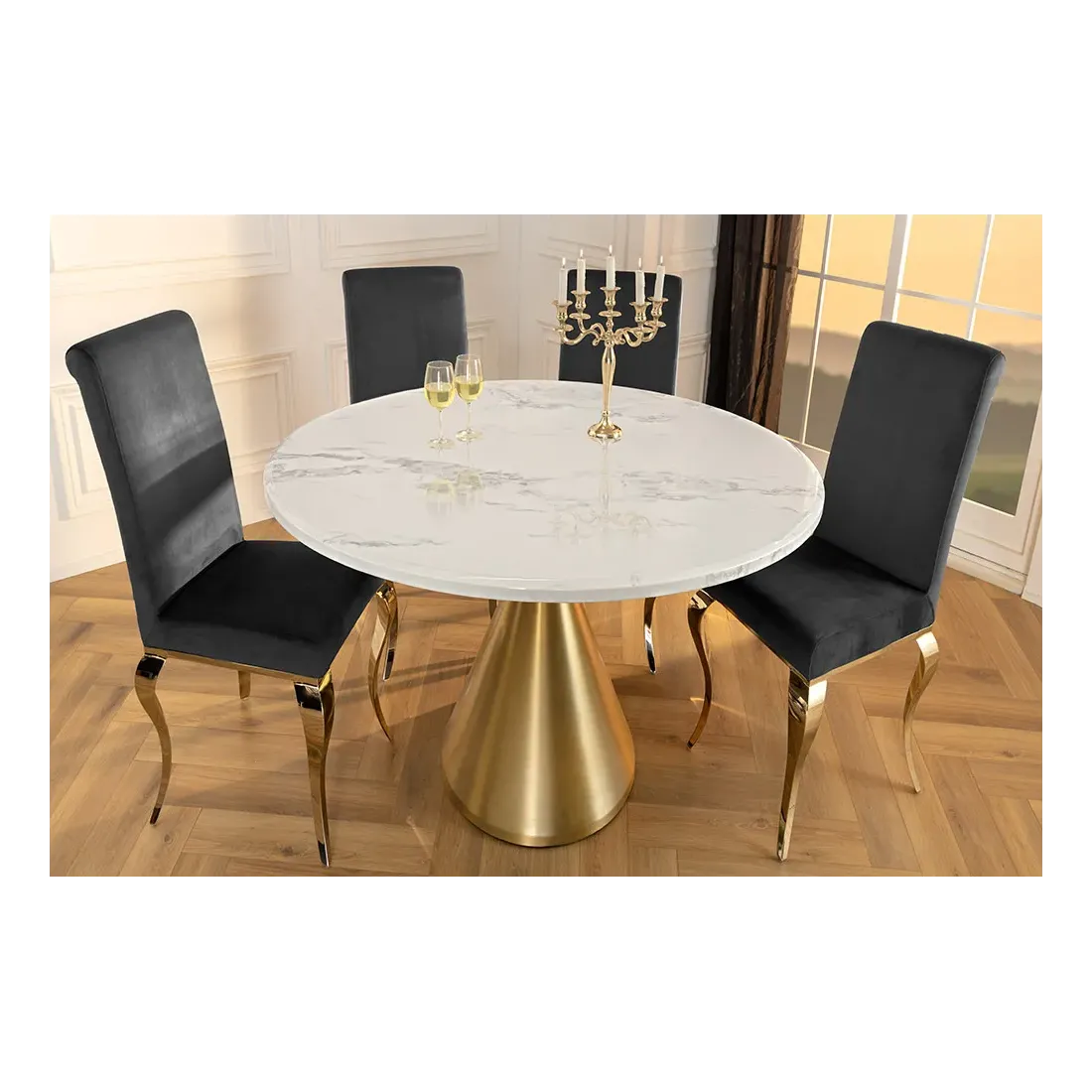 La table ronde ELEGANCIA allie stabilité, esthétisme et praticité. Idéale pour les repas en famille ou entre amis, elle séduit par son plateau en marbre facile à entretenir et son pied colonne métal doré qui ajoute une touche de glamour.