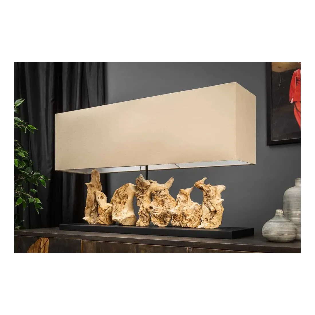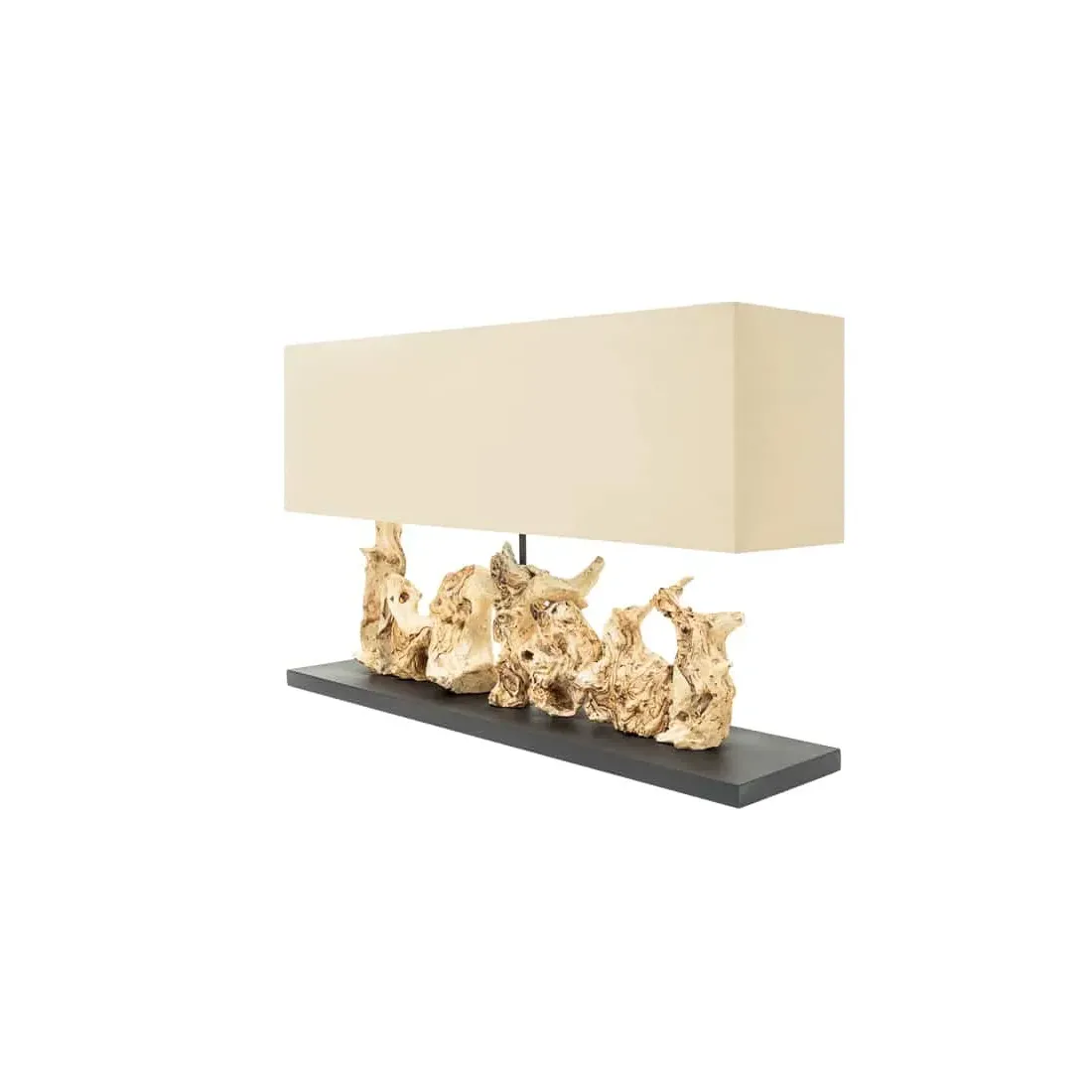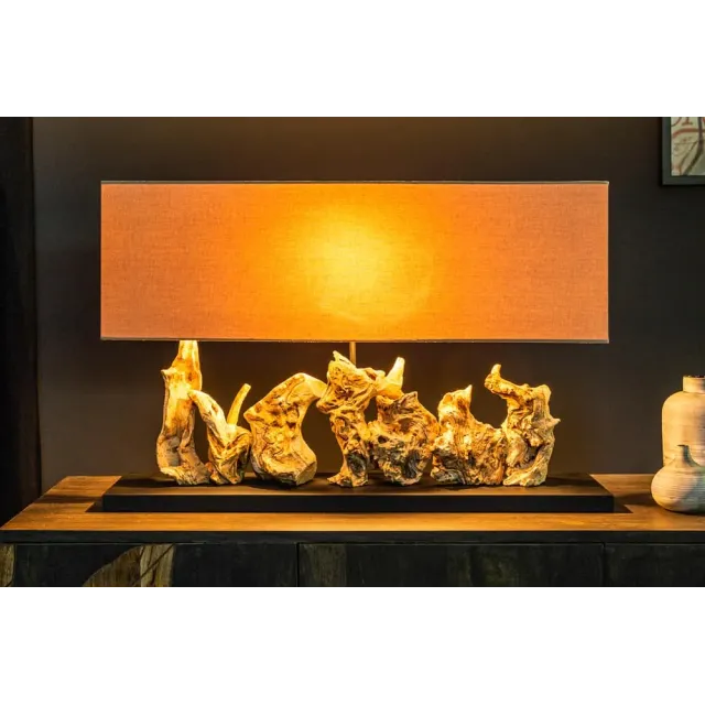 Lampe de table design PURE UNIQUE 80 cm – Bois flotté naturel et abat-jour en lin beige