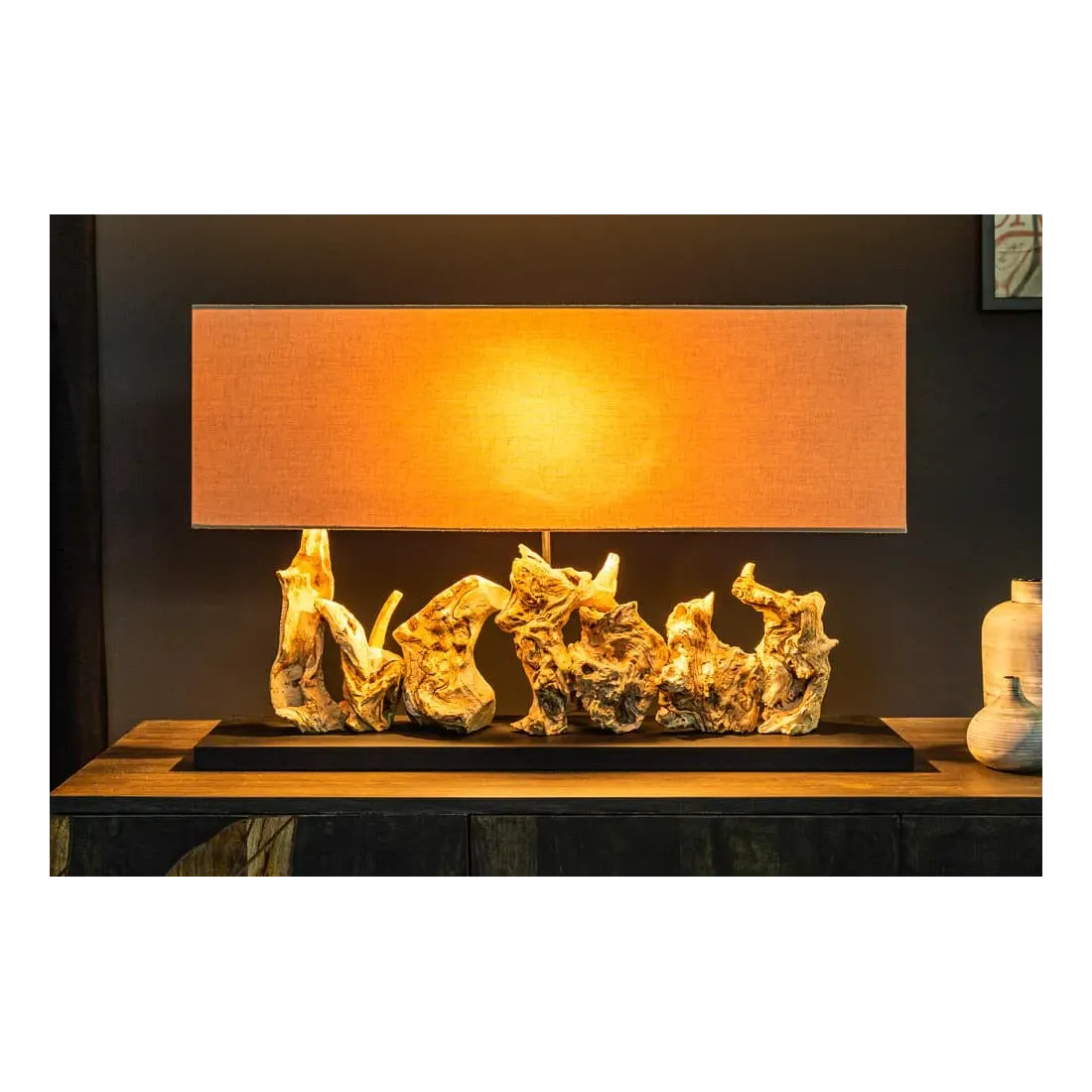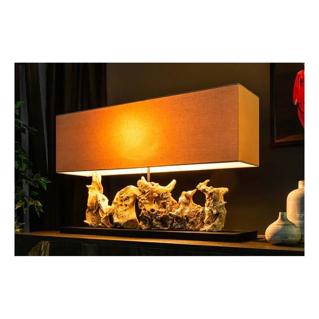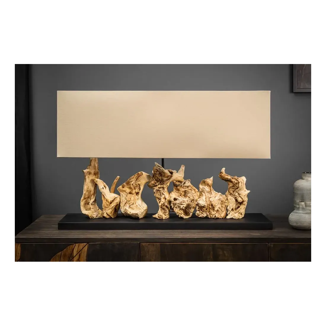 Lampe de table design PURE UNIQUE 80 cm – Bois flotté naturel et abat-jour en lin beige