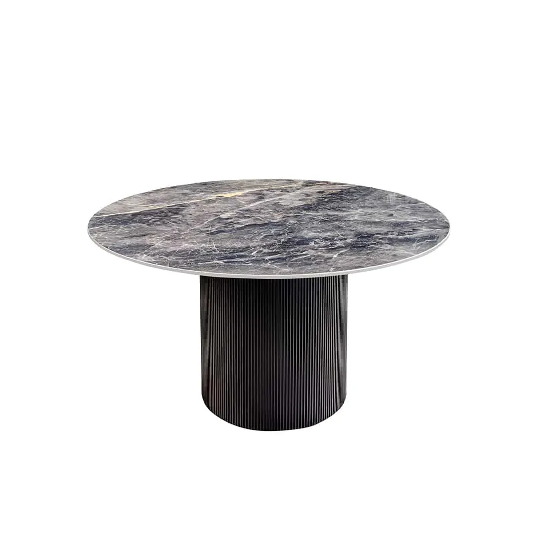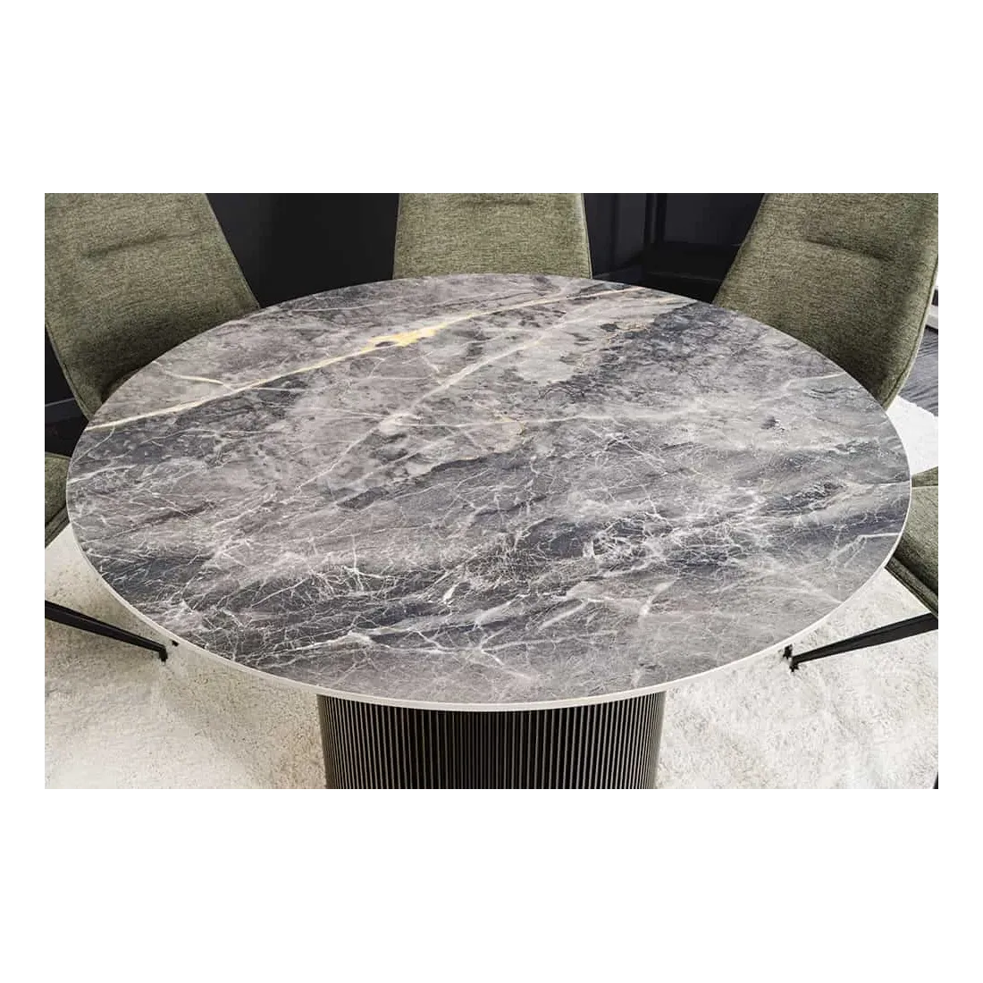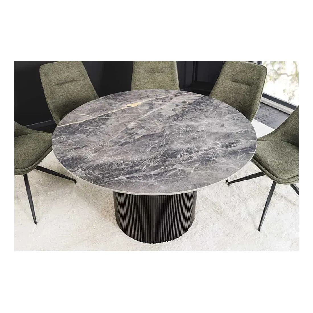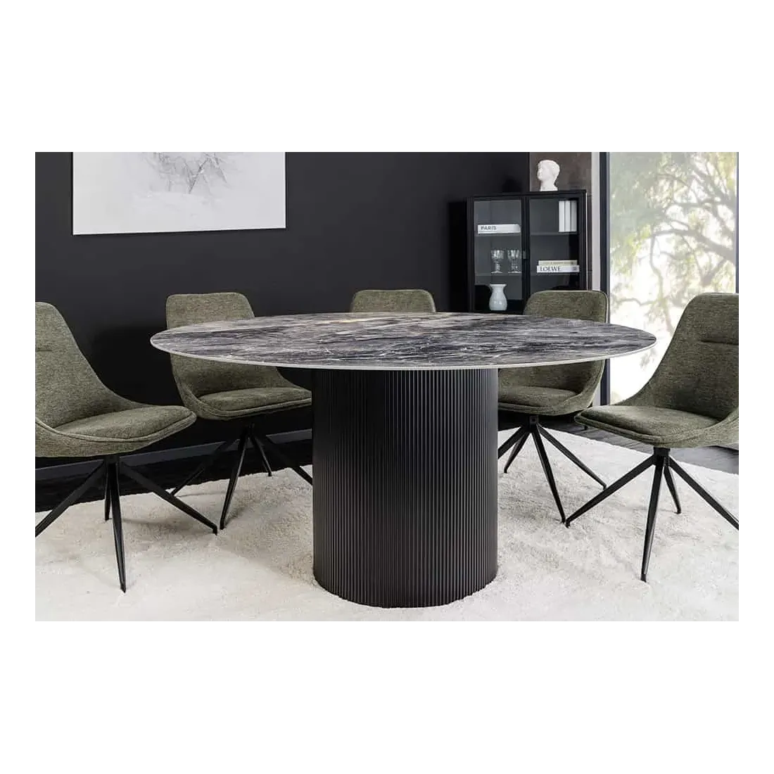 La table ronde UNIQUE (Ø120 cm) est idéale pour les repas conviviaux. Son plateau en céramique noir effet marbre est à la fois élégant, résistant aux rayures et facile à entretenir, tandis que son pied colonne central assure stabilité et confort d’assise.