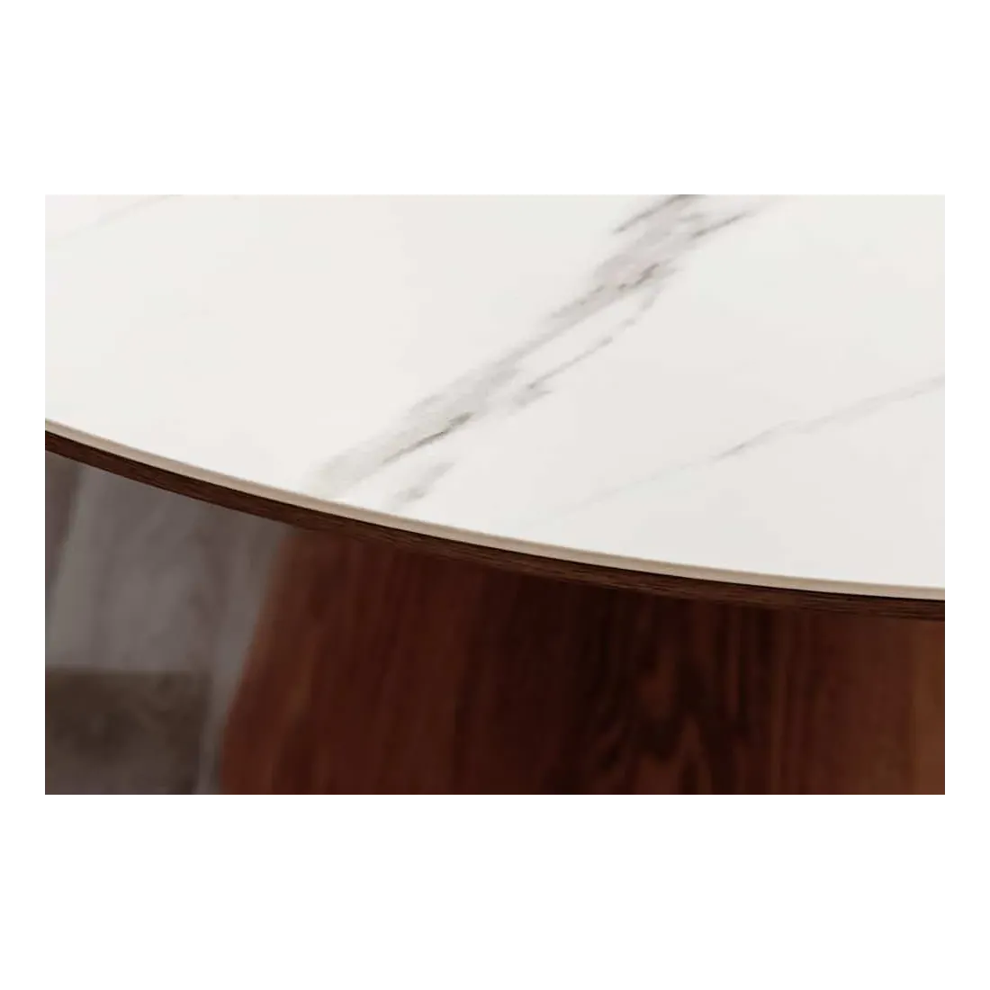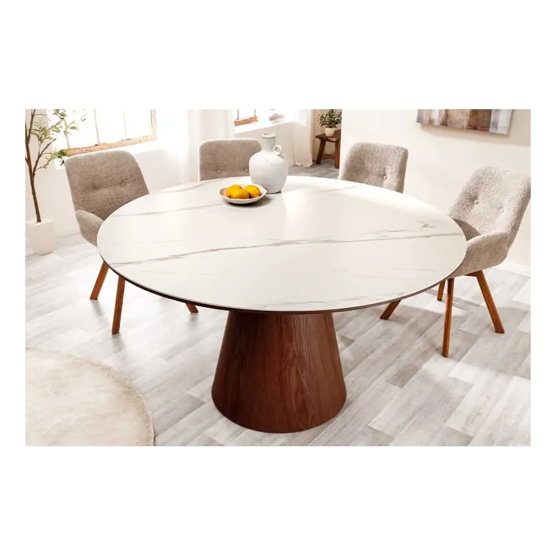 Table à manger ronde UNIQUE 120 cm – Plateau céramique blanc effet marbre & pied colonne noyer
