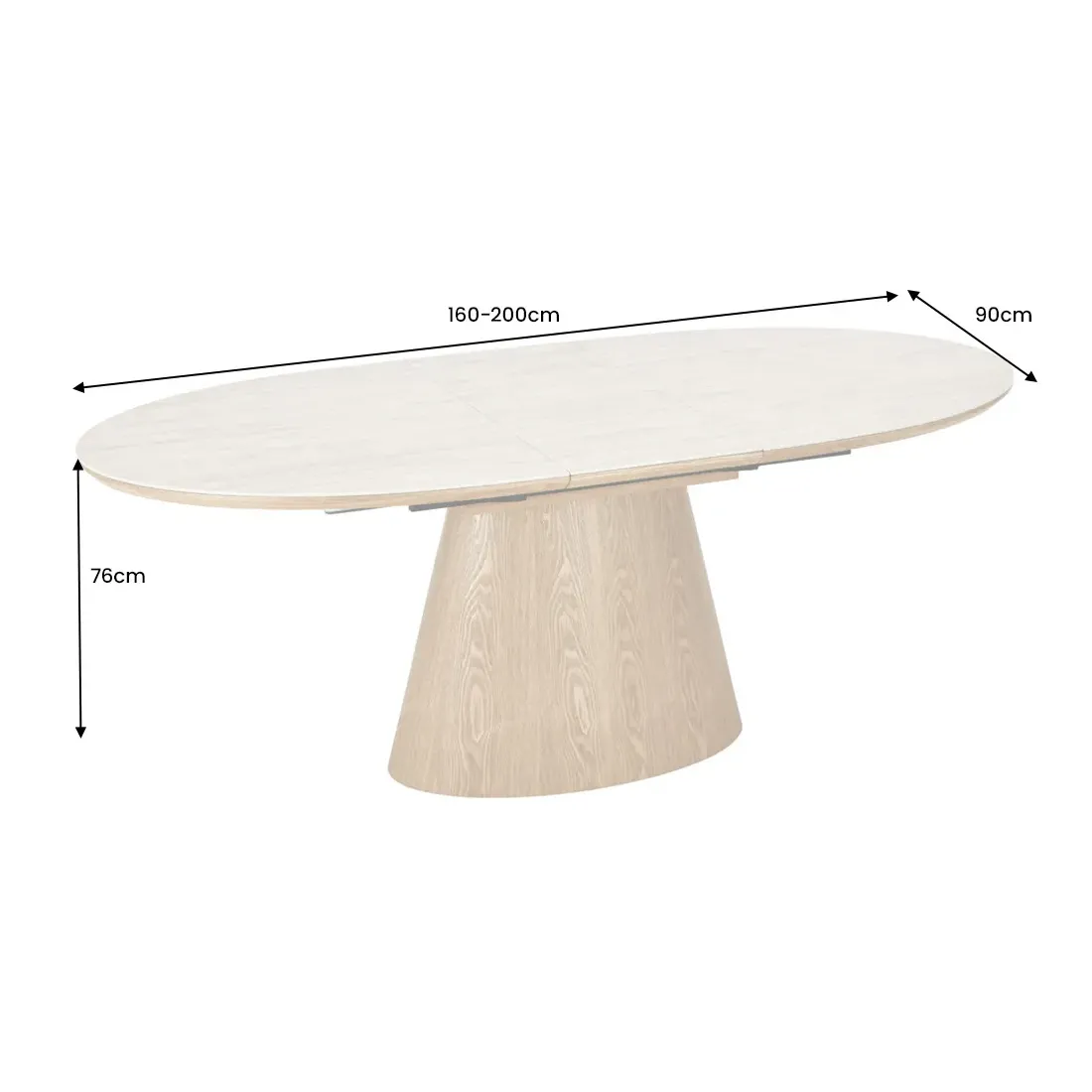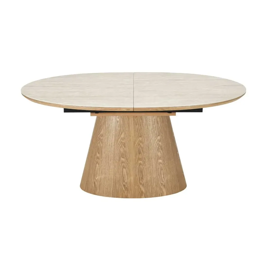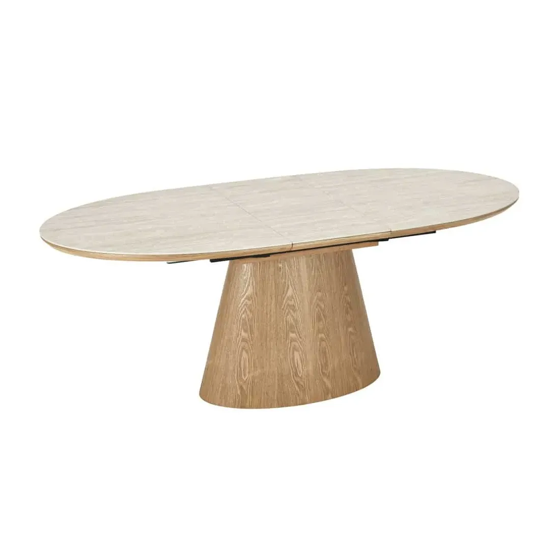 Table à manger extensible UNIQUE 160–200 cm – Plateau en céramique travertin & pied colonne en chêne naturel