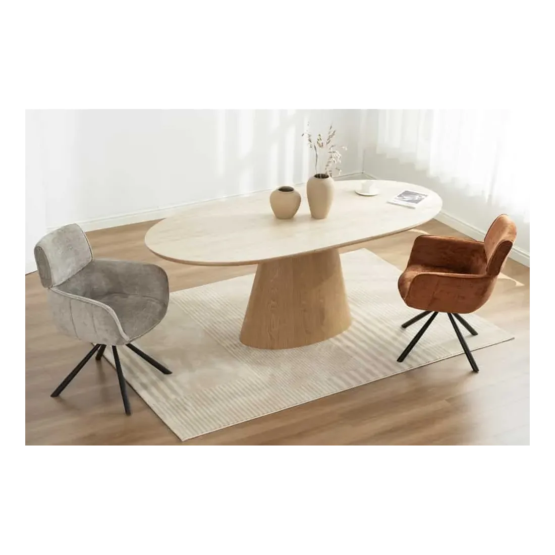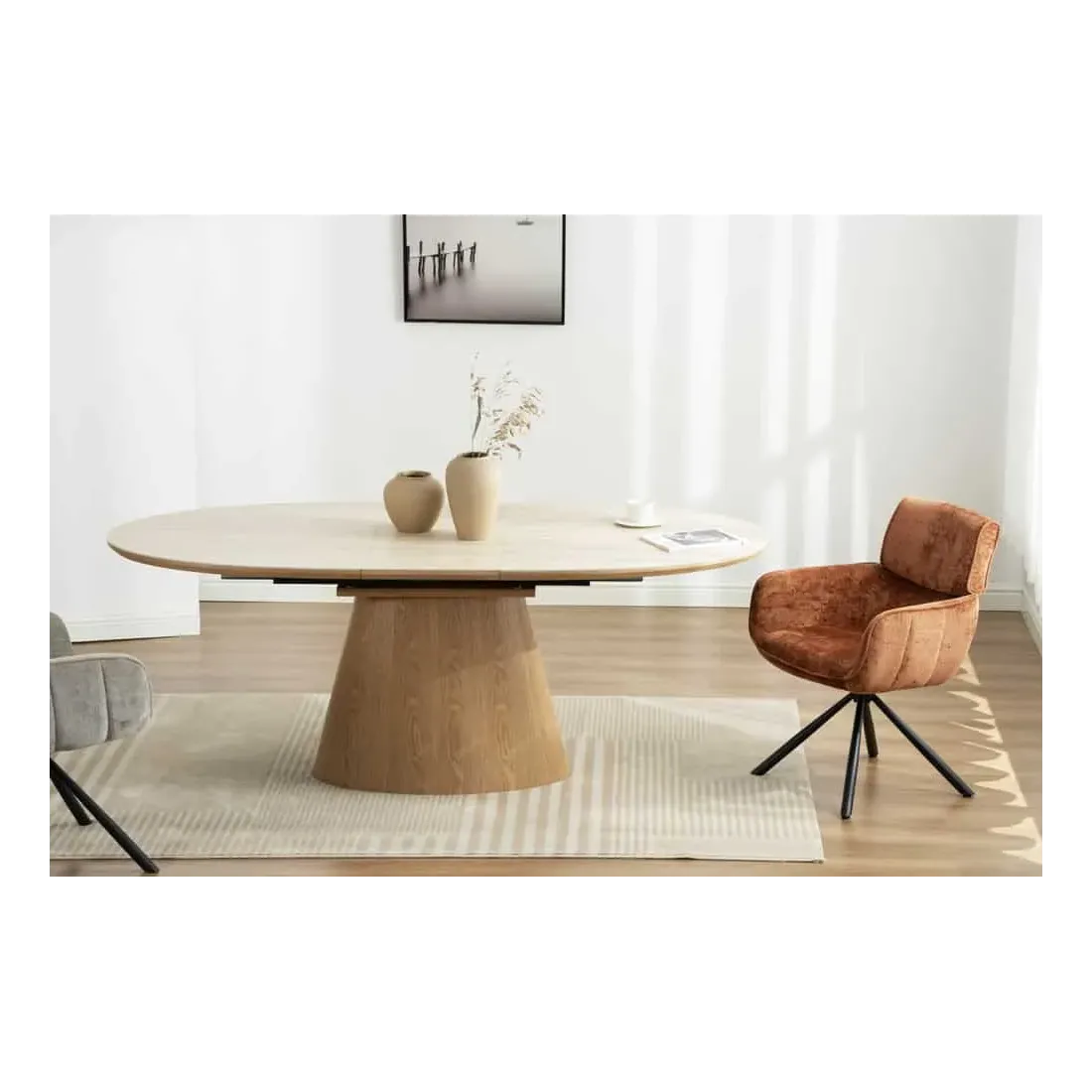 Son piètement colonne en chêne véritable met en valeur les veines et la couleur claire du bois, offrant à la fois stabilité et chaleur visuelle.