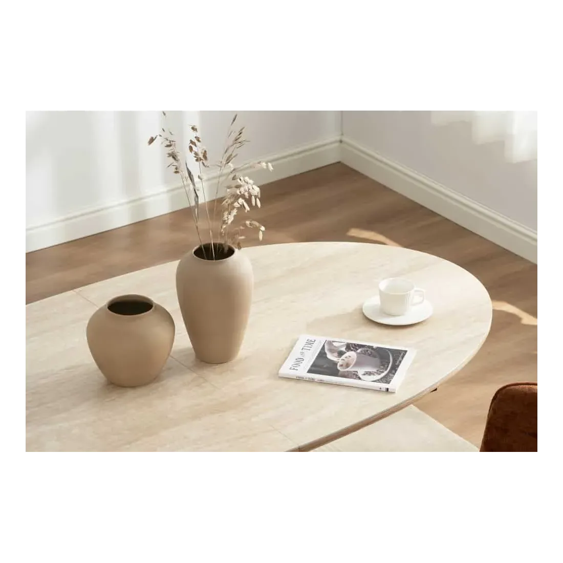 Le plateau en céramique effet travertin séduit par son charme naturel et sa praticité : une surface anti-rayures, résistante et simple à nettoyer, qui conserve son élégance au fil du temps.