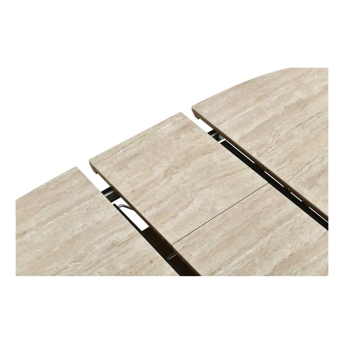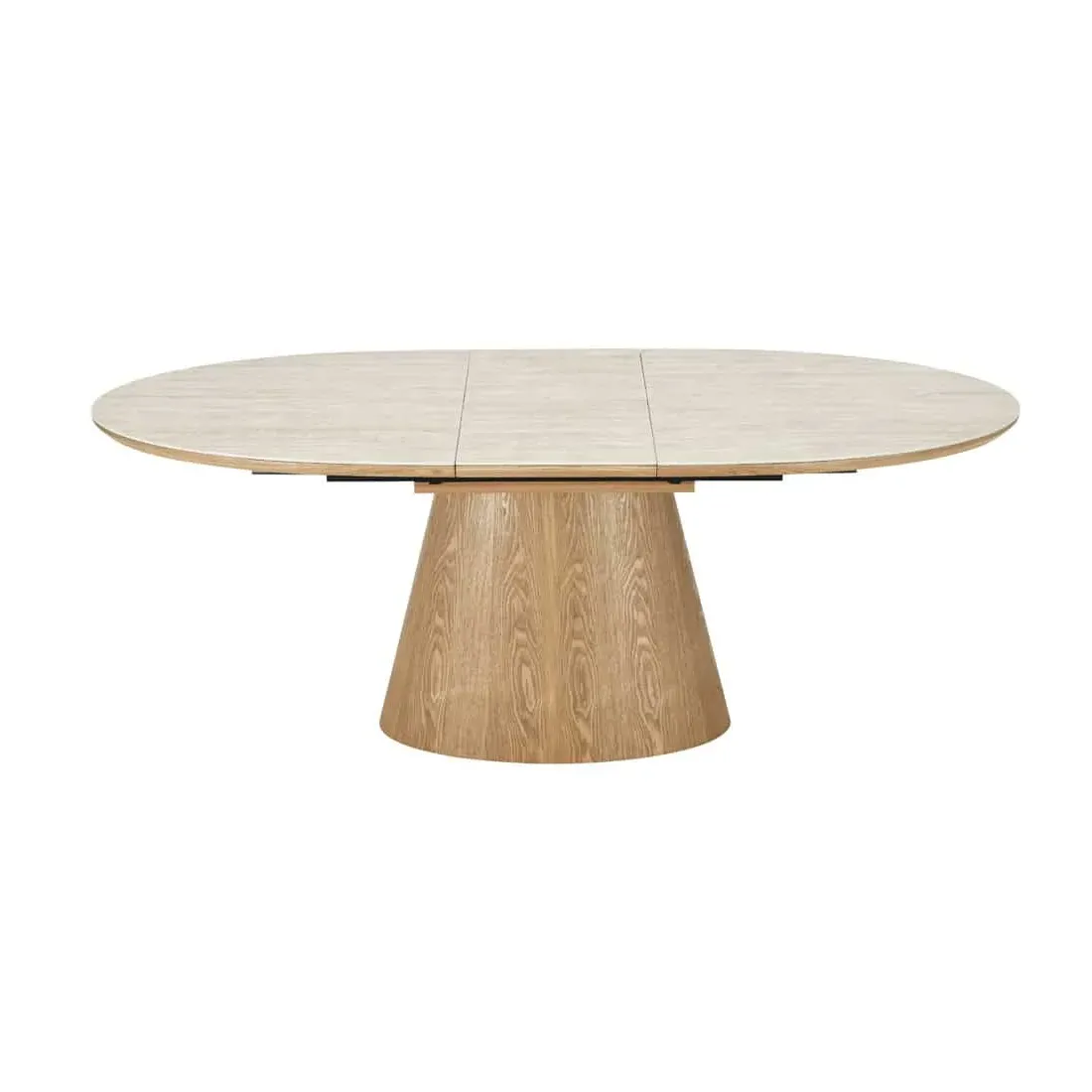 La table extensible UNIQUE passe de 160 cm à 200 cm en un geste, grâce à sa rallonge intégrée directement dans la structure. Son plateau en céramique effet travertin est à la fois résistant et facile d’entretien, tandis que son piètement colonne en chêne sublime la beauté naturelle du bois. Idéale pour 6 à 8 convives, elle allie design, robustesse et praticité.