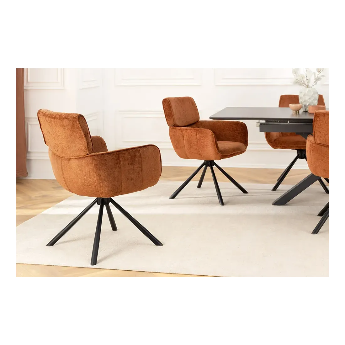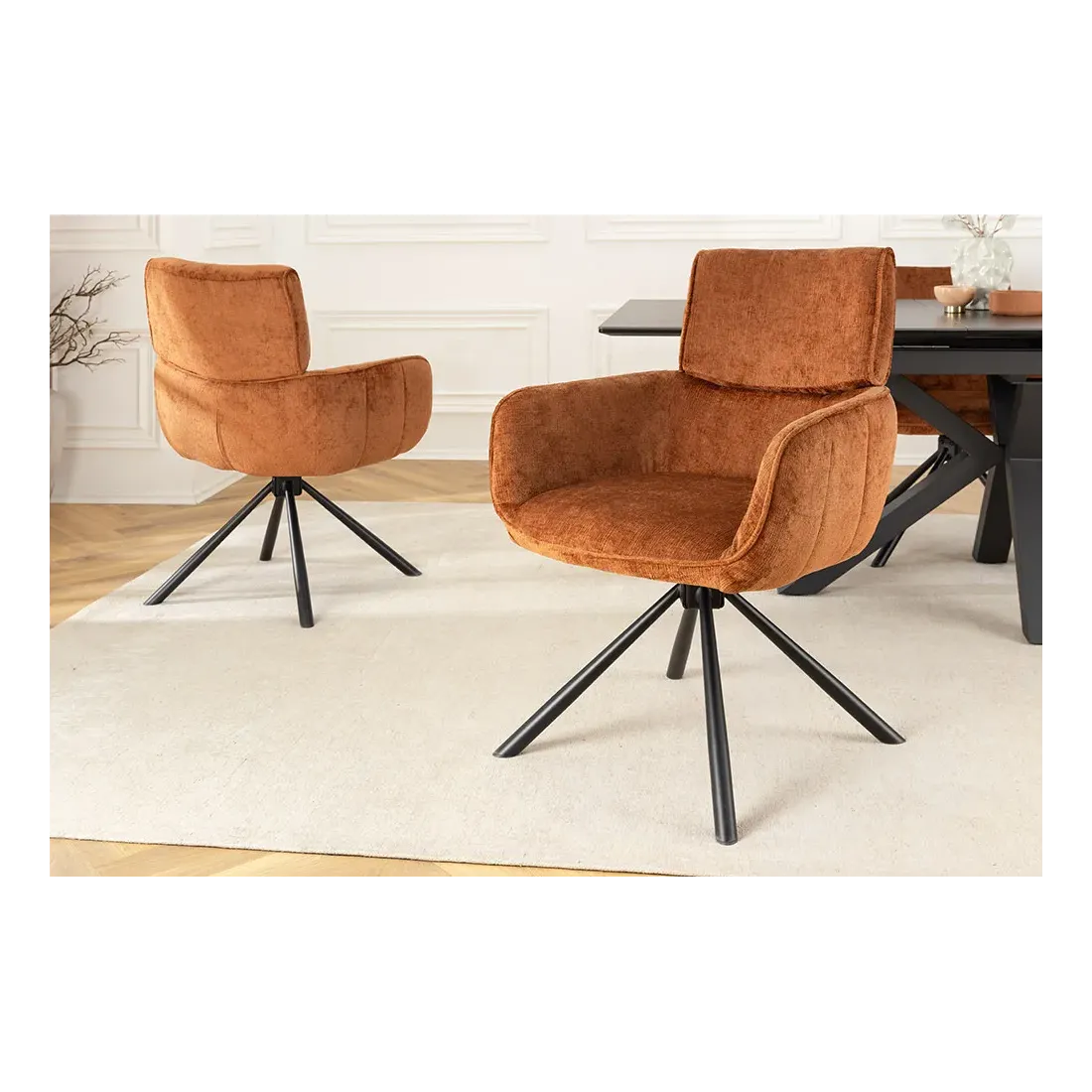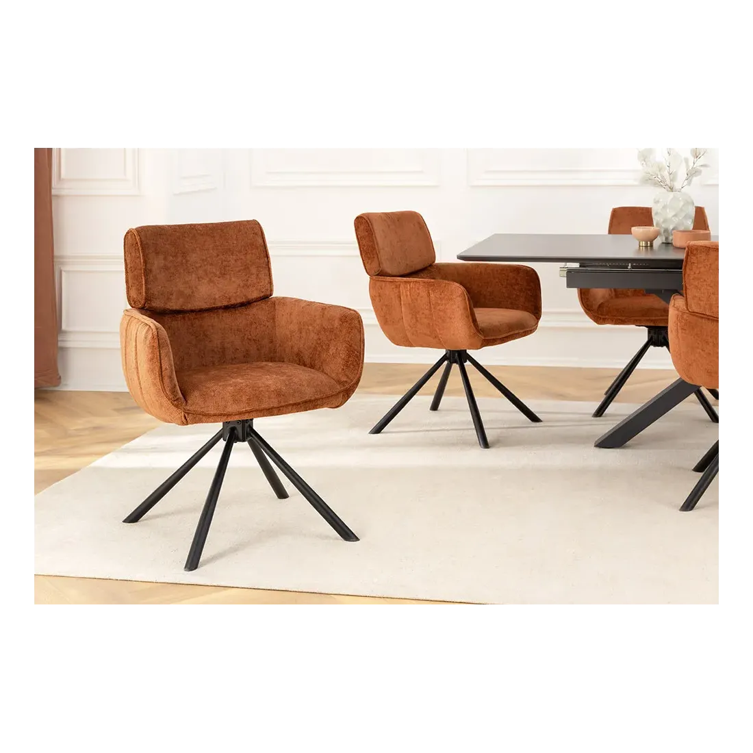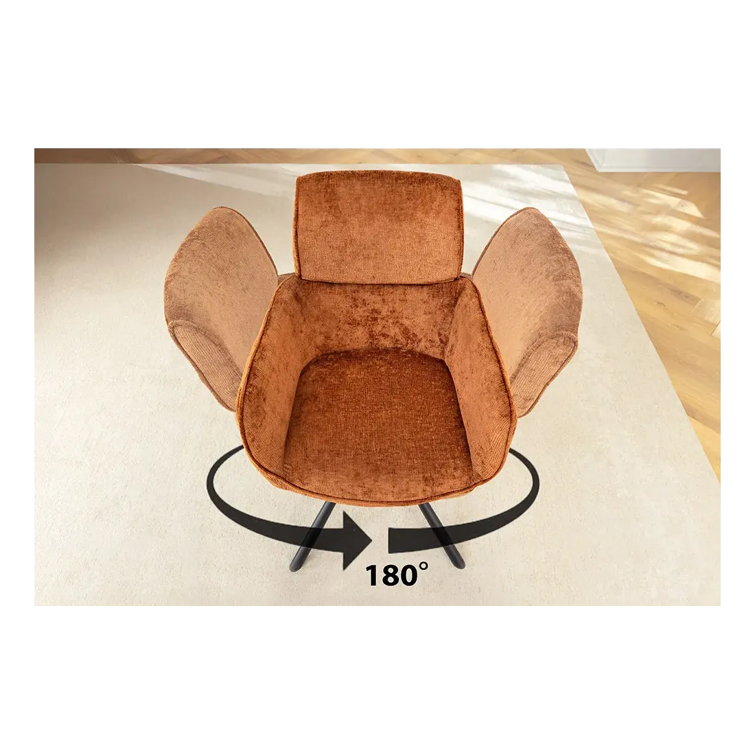 La chaise UNIQUE séduit par son style rétro chic et son revêtement en chenille douce couleur rouille/brun. Dotée d’un piètement en métal noir robuste et d’accoudoirs intégrés, elle offre confort et stabilité. Sa fonction pivotante à 180° avec retour automatique en fait une assise pratique et raffinée, idéale pour la salle à manger comme pour un bureau.