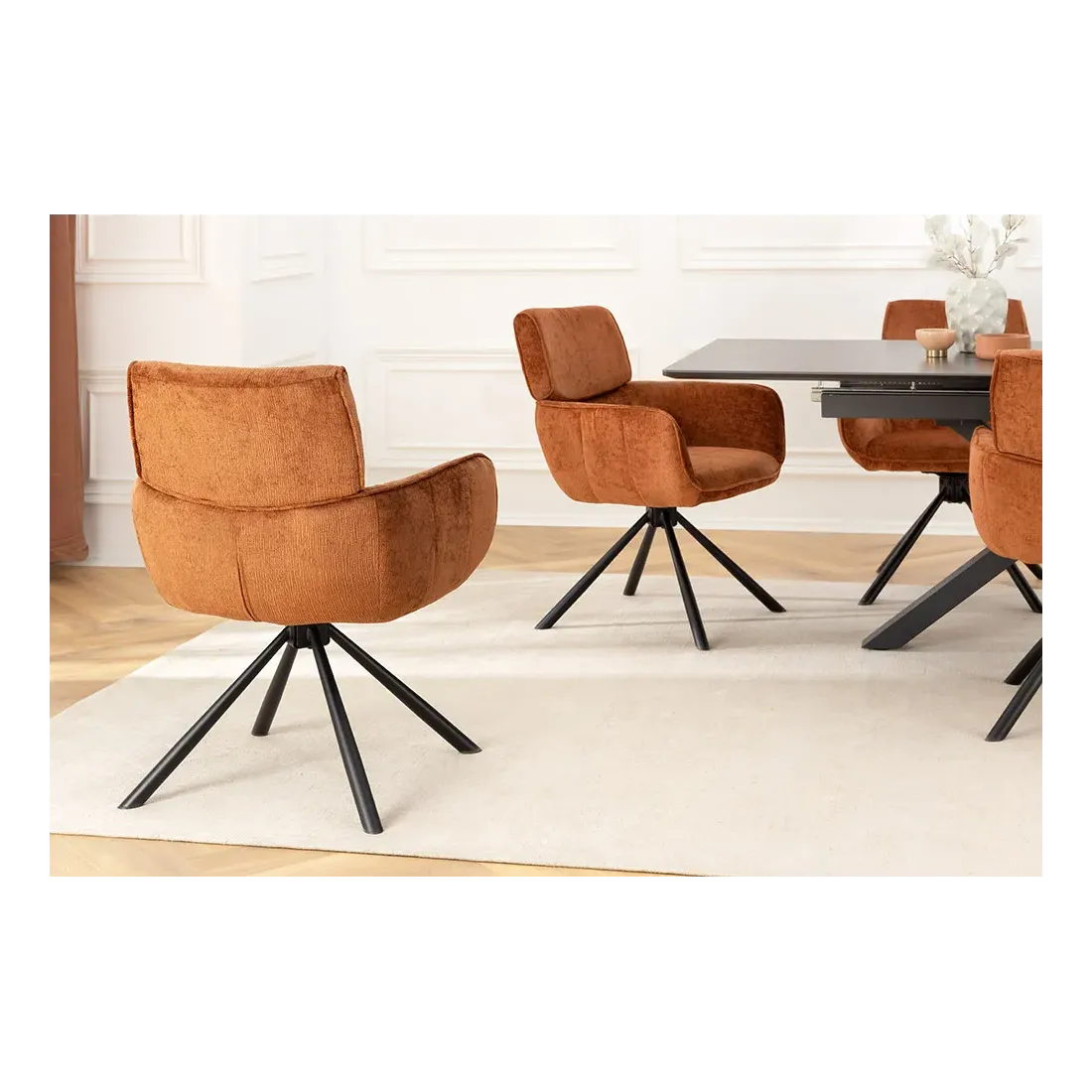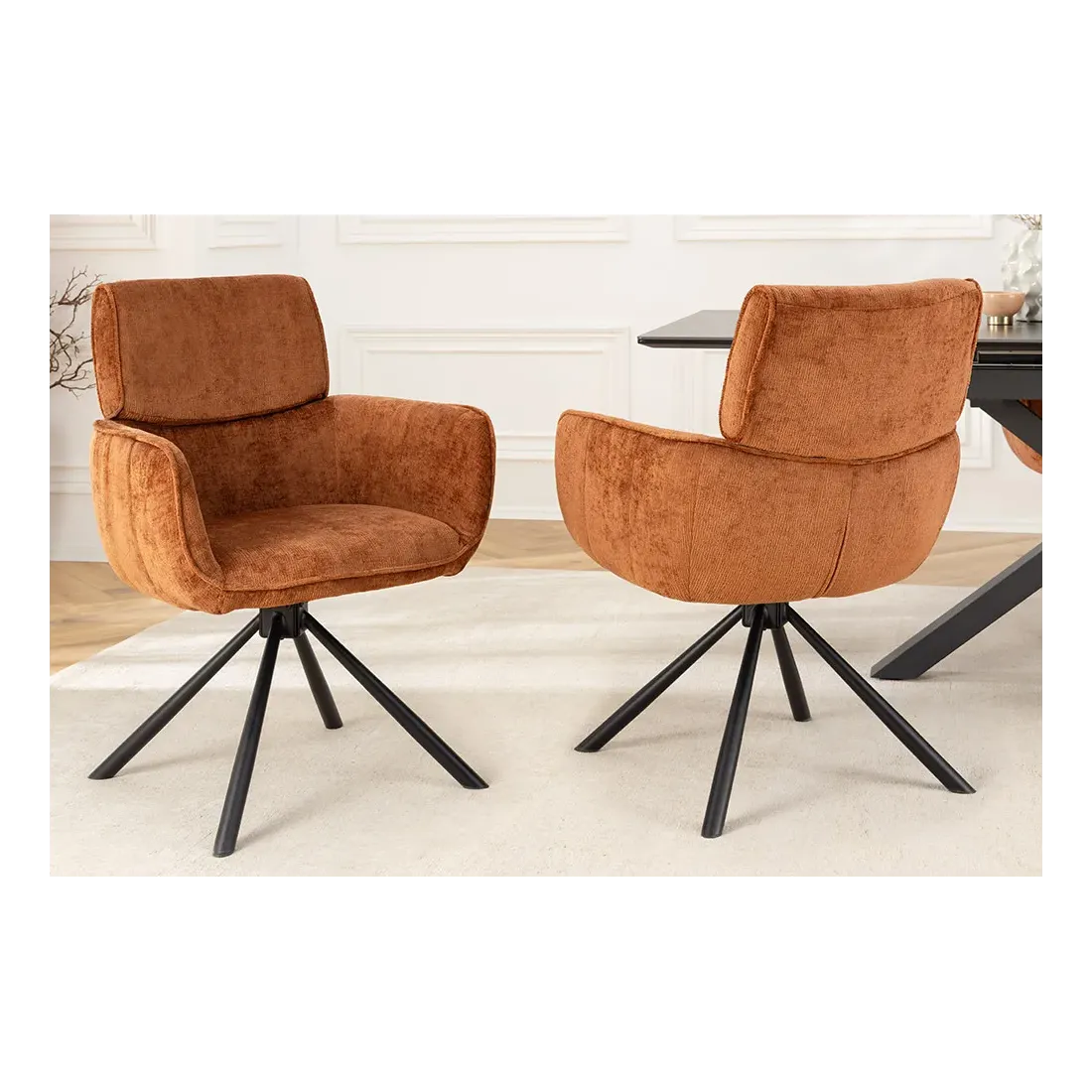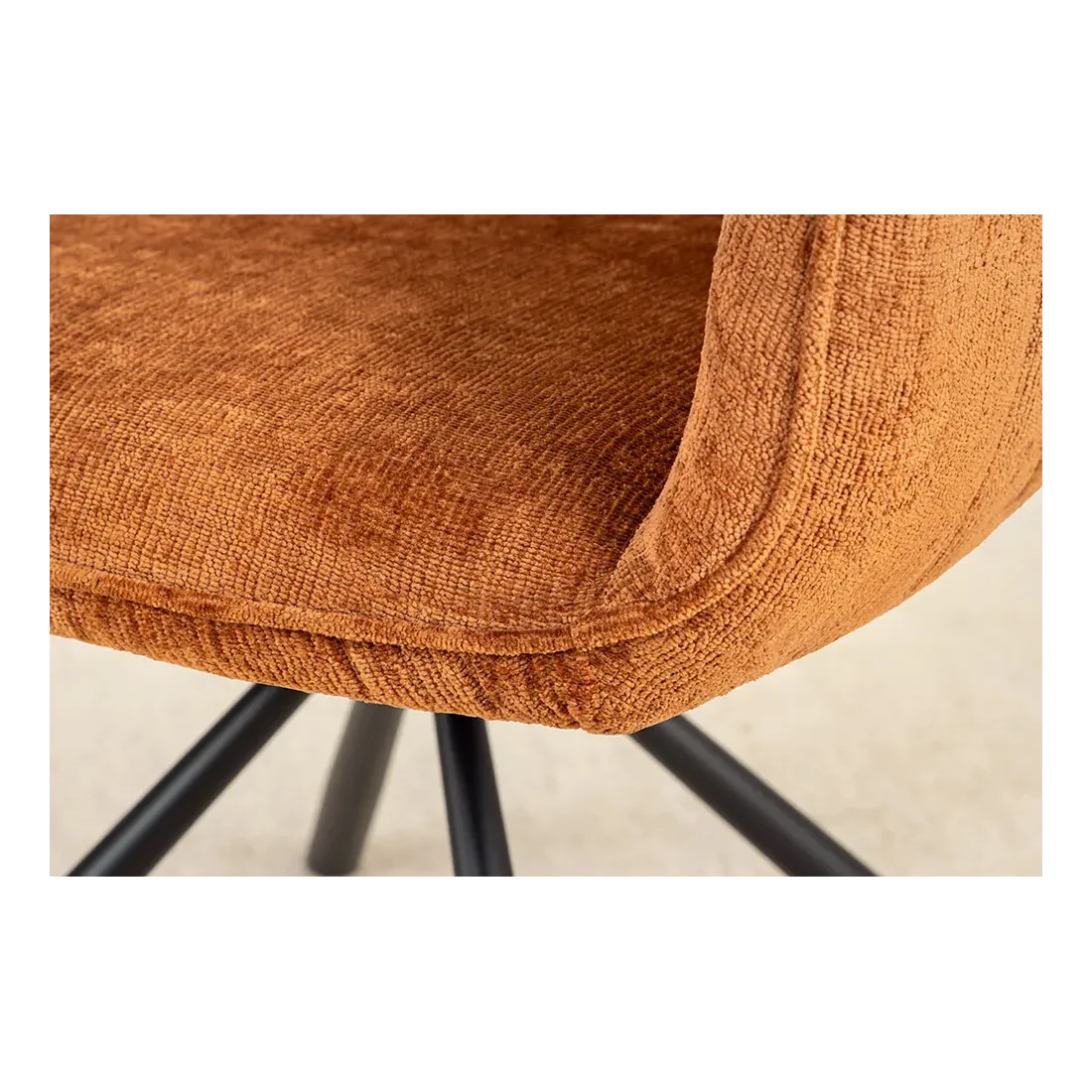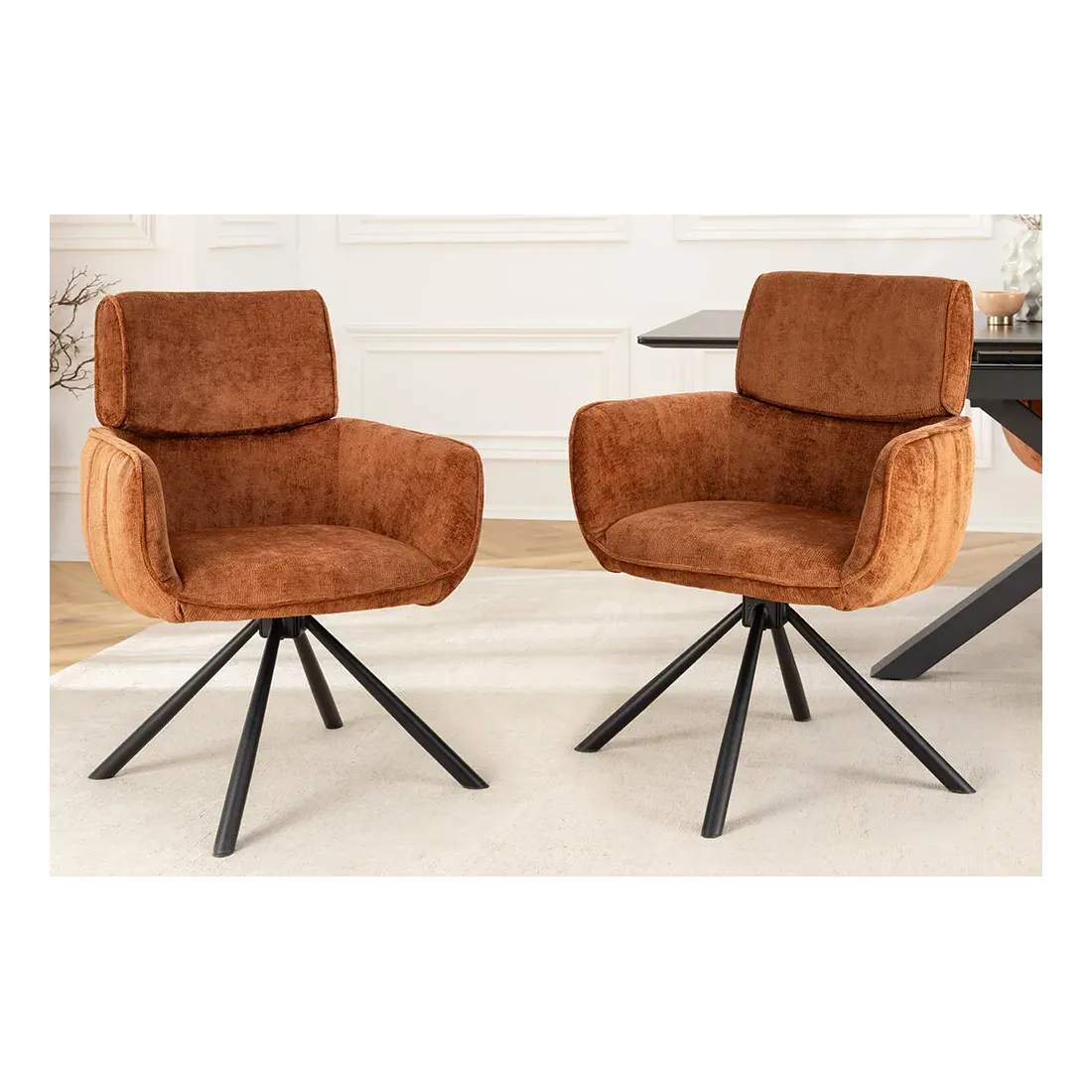 La chaise UNIQUE séduit par son style rétro chic et son revêtement en chenille douce couleur rouille/brun. Dotée d’un piètement en métal noir robuste et d’accoudoirs intégrés, elle offre confort et stabilité. Sa fonction pivotante à 180° avec retour automatique en fait une assise pratique et raffinée, idéale pour la salle à manger comme pour un bureau.