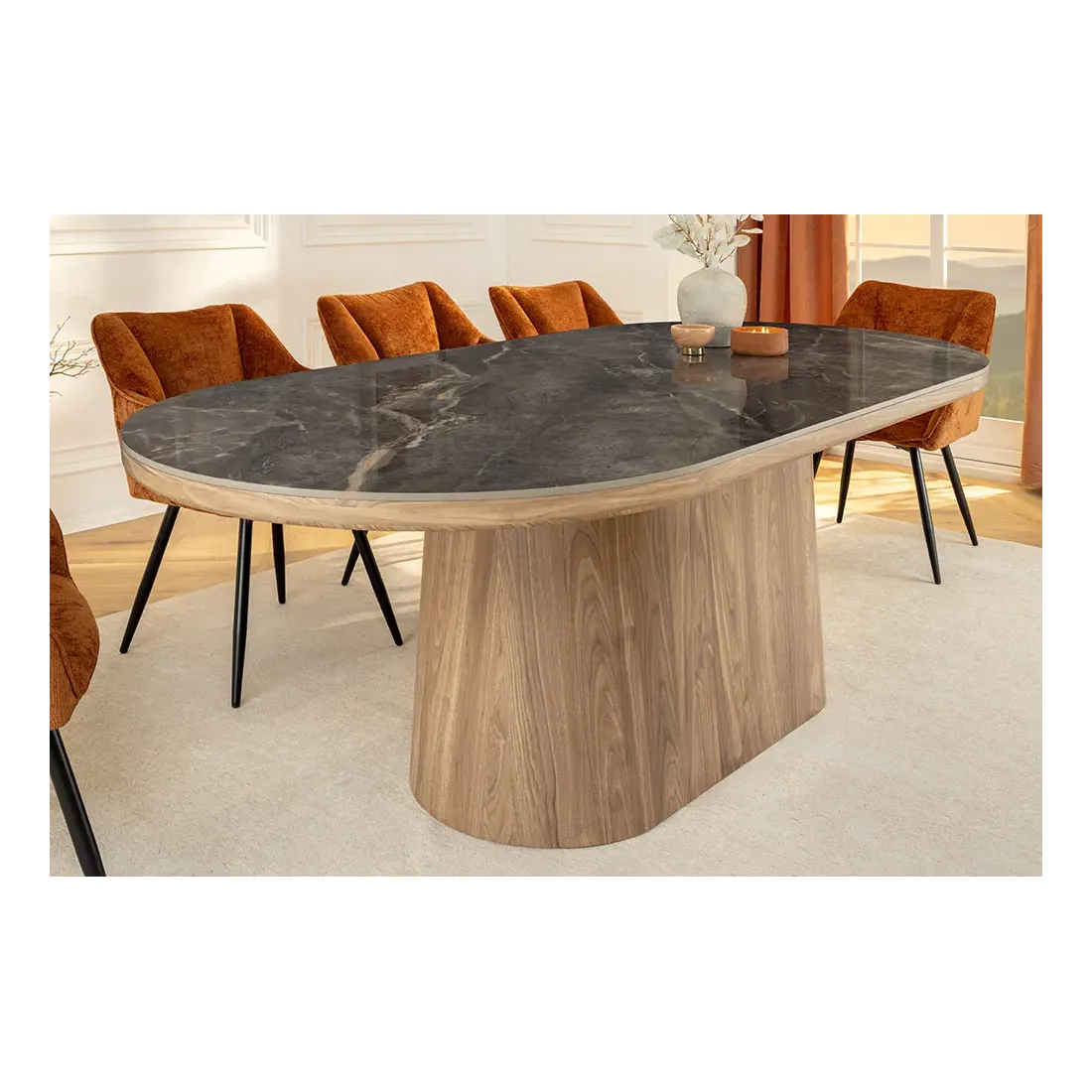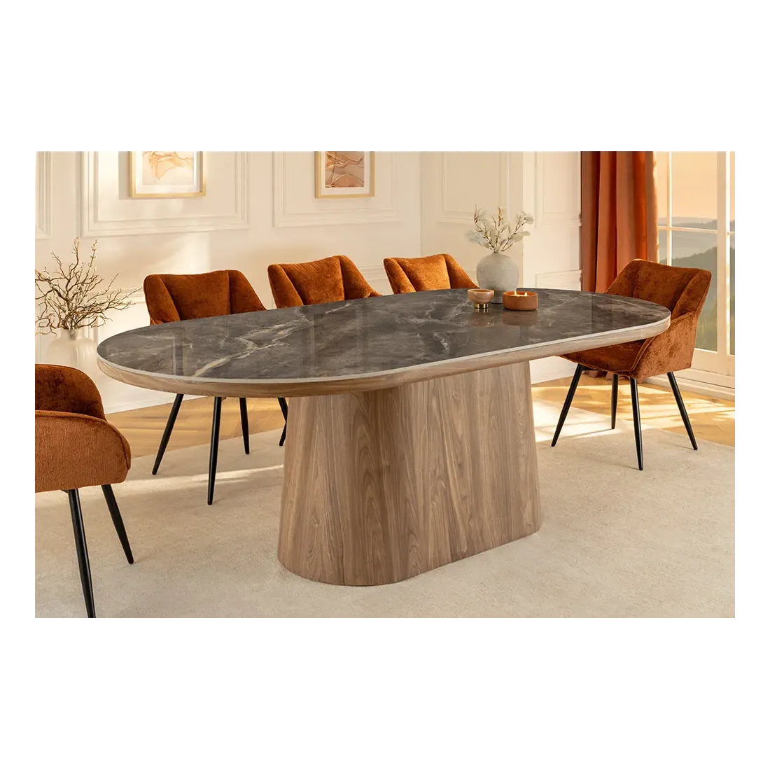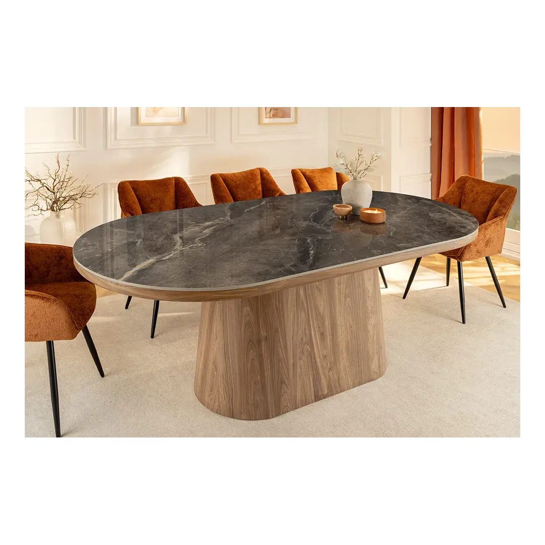 Table ovale en céramique grise 200 cm – Design marbre & pied colonne en noyer