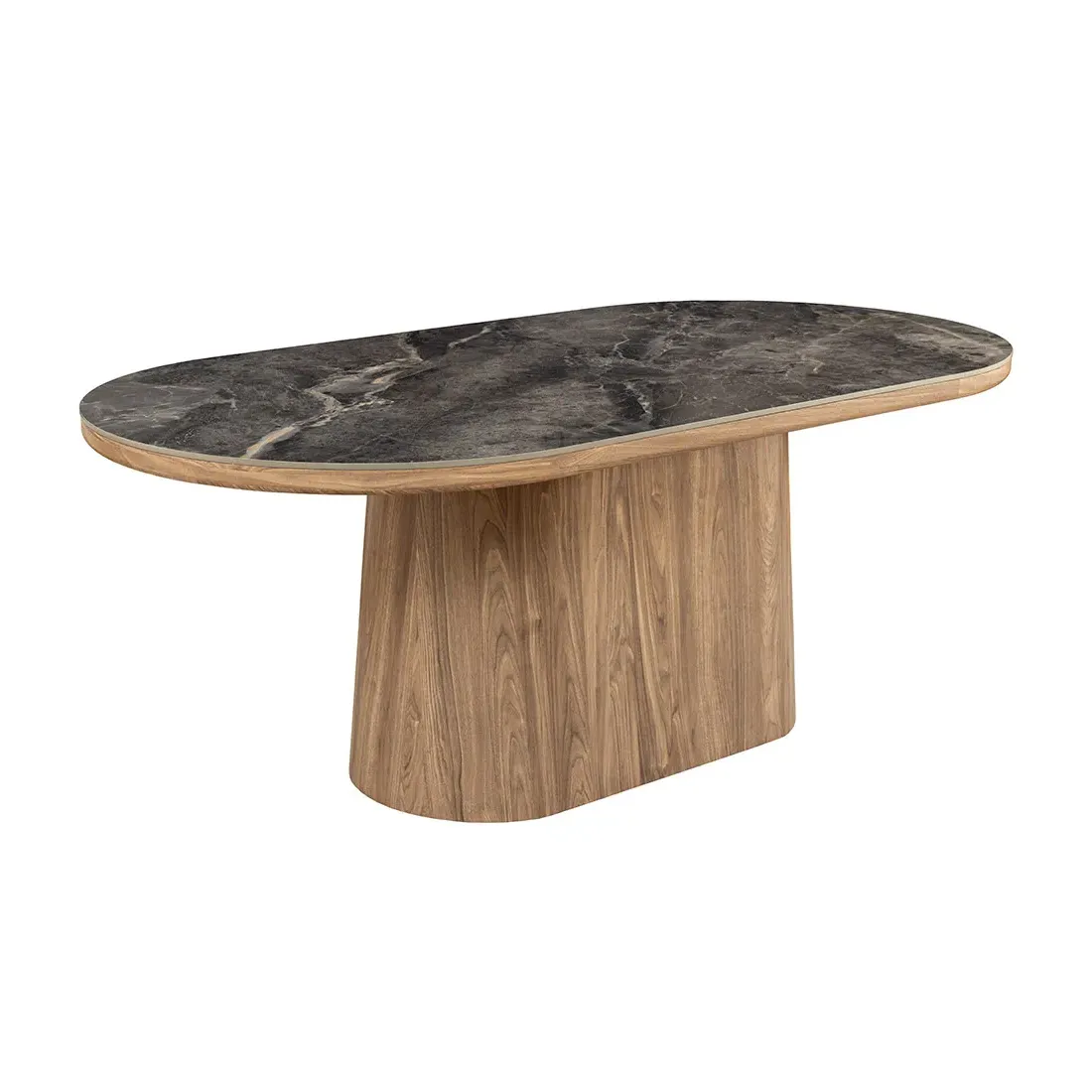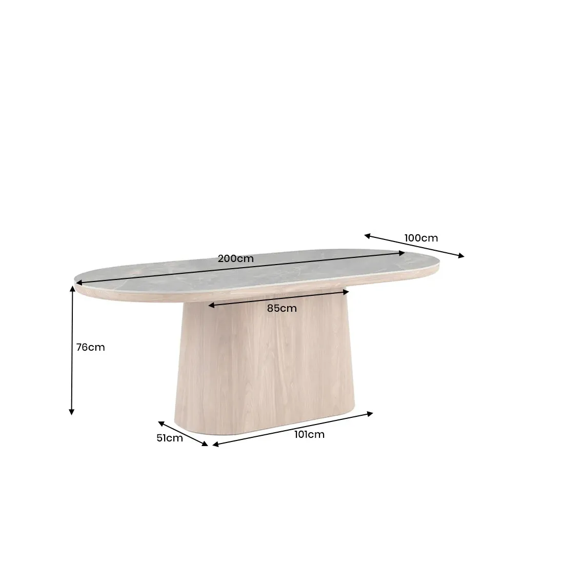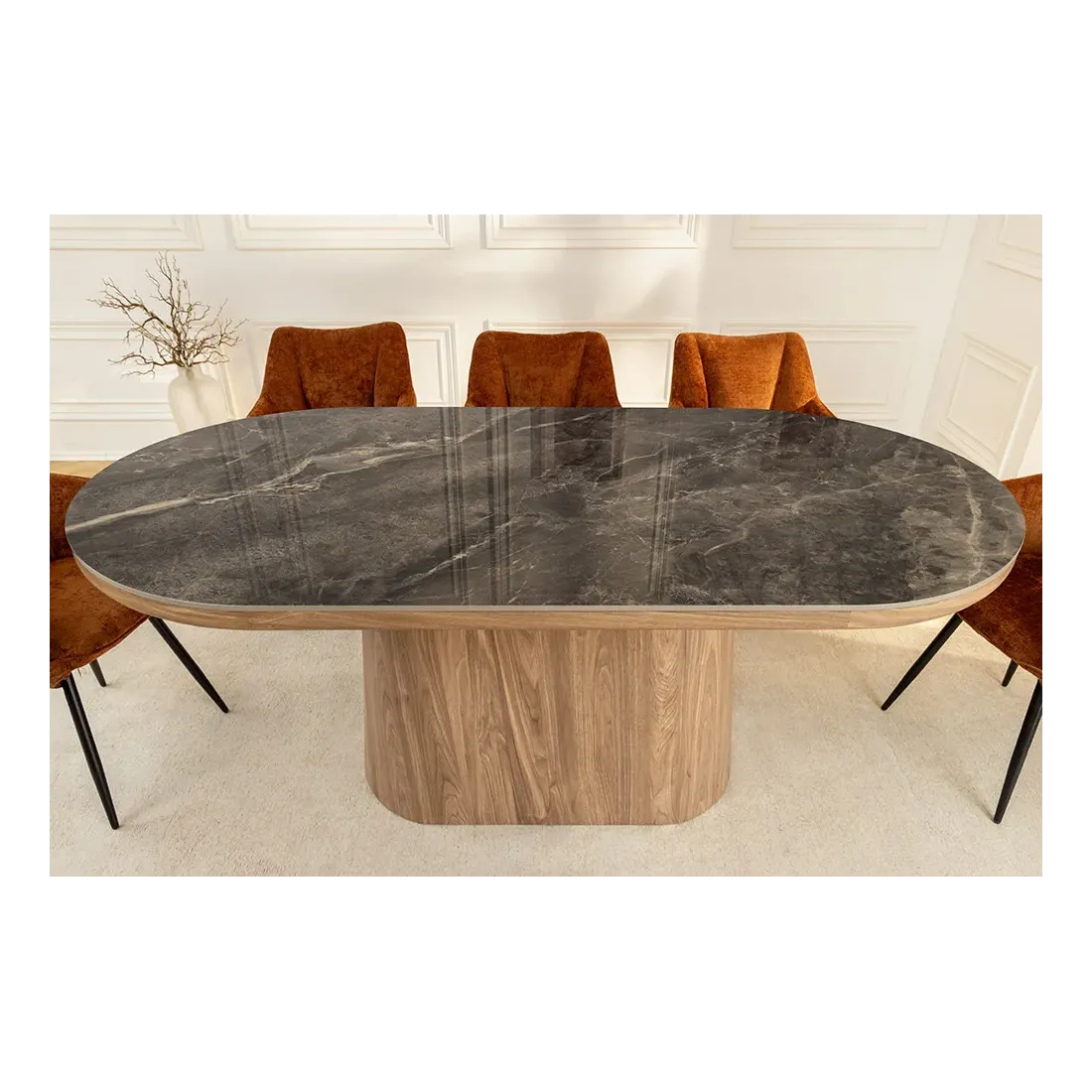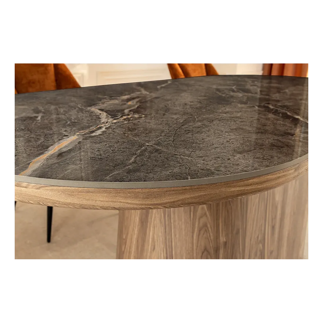 Table ovale en céramique grise 200 cm – Design marbre & pied colonne en noyer