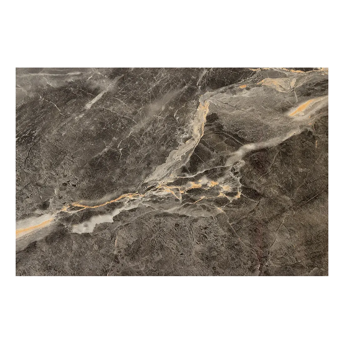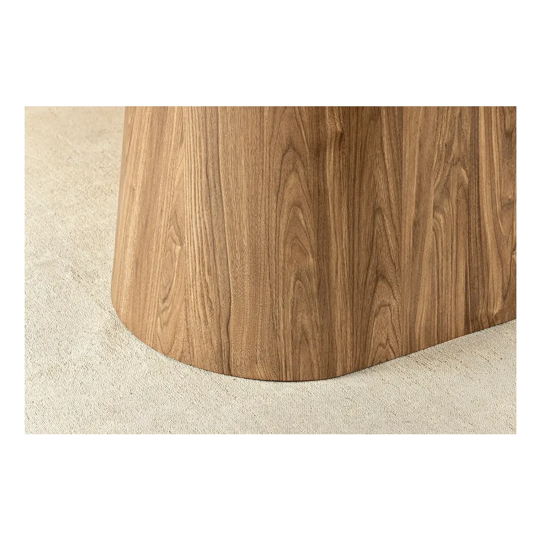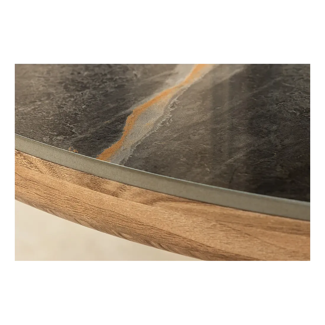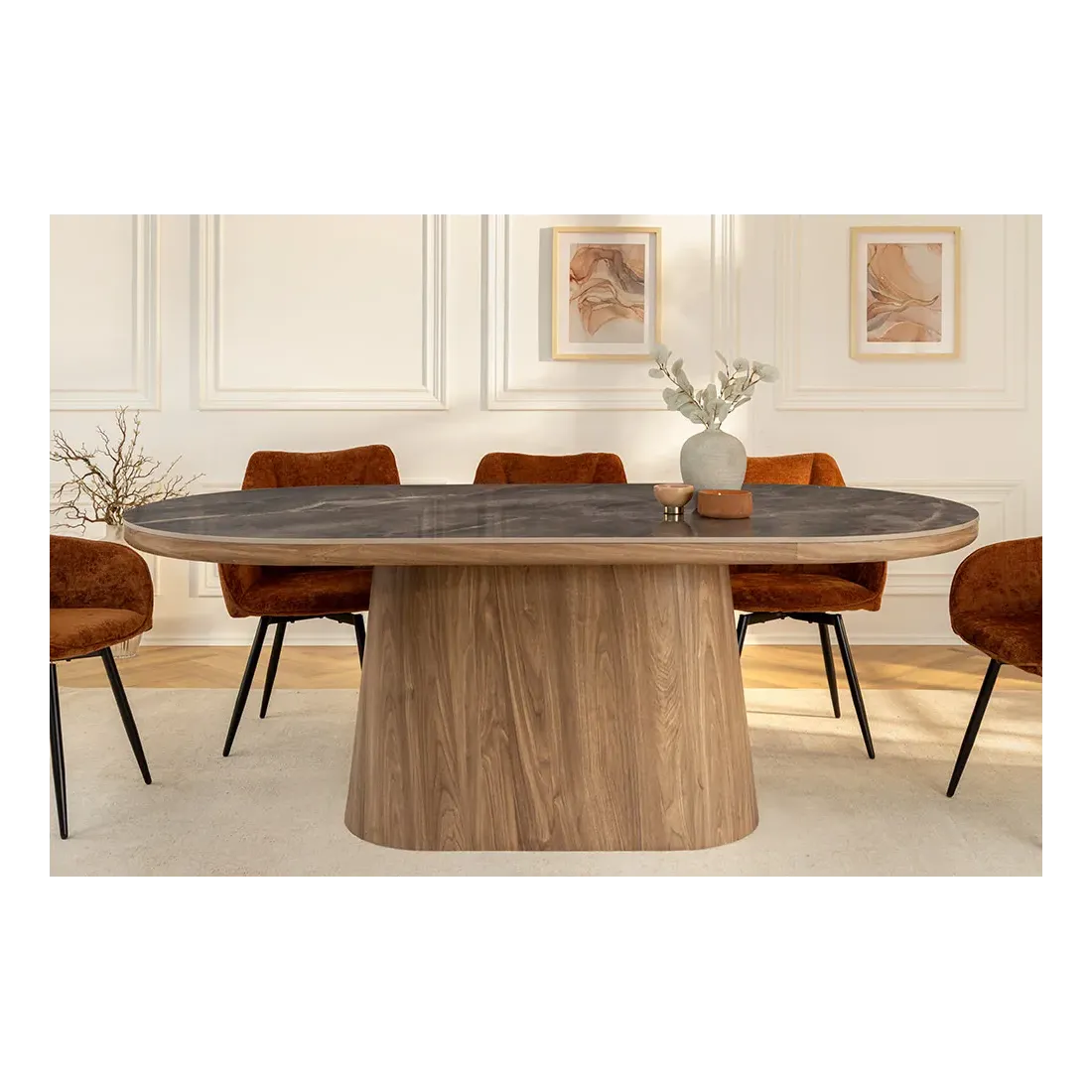 Le pied colonne en MDF plaqué noyer véritable se distingue par sa masse robuste et sa veinure intense, créant un contraste chaleureux avec le plateau minéral. Cette association de matériaux nobles confère à la table un caractère unique, entre élégance contemporaine et charme naturel.
