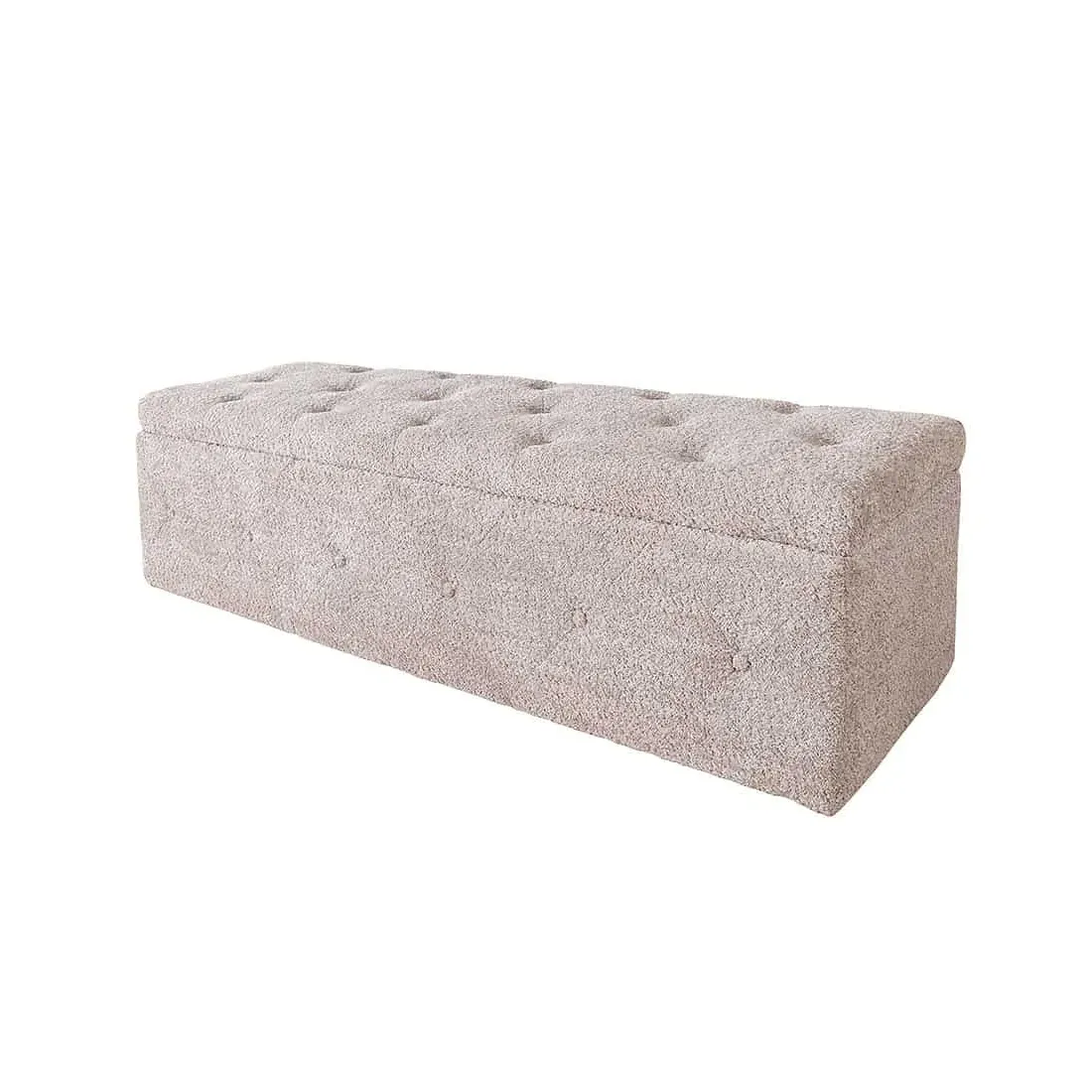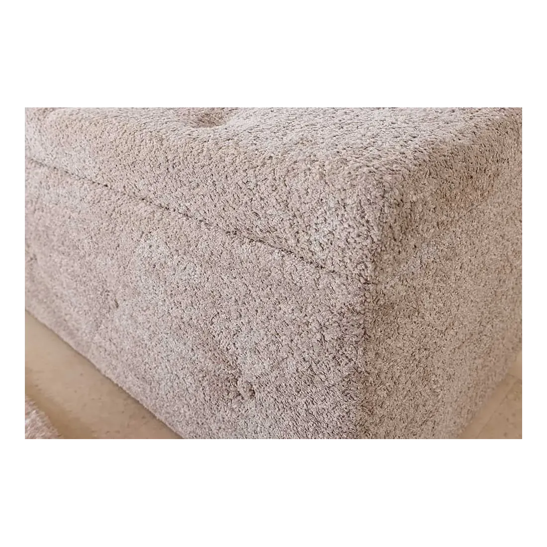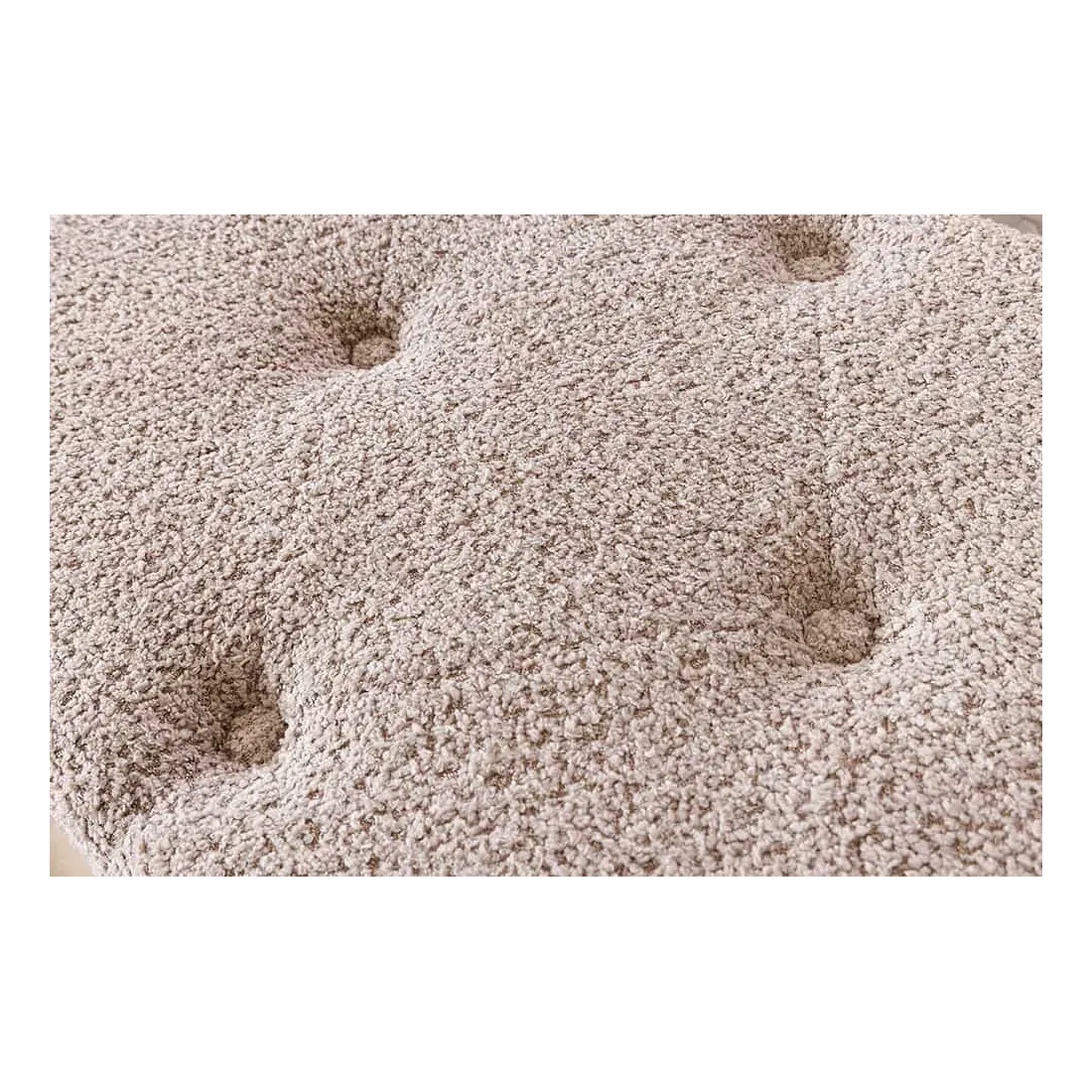 Son revêtement en tissu bouclé (100 % polyester), dans une teinte douce champagner greige, offre un toucher agréable et une allure cosy. Les coutures capitonnées façon Chesterfield lui donnent un style classique chic, idéal pour sublimer le pied de lit, un dressing ou même un couloir.
