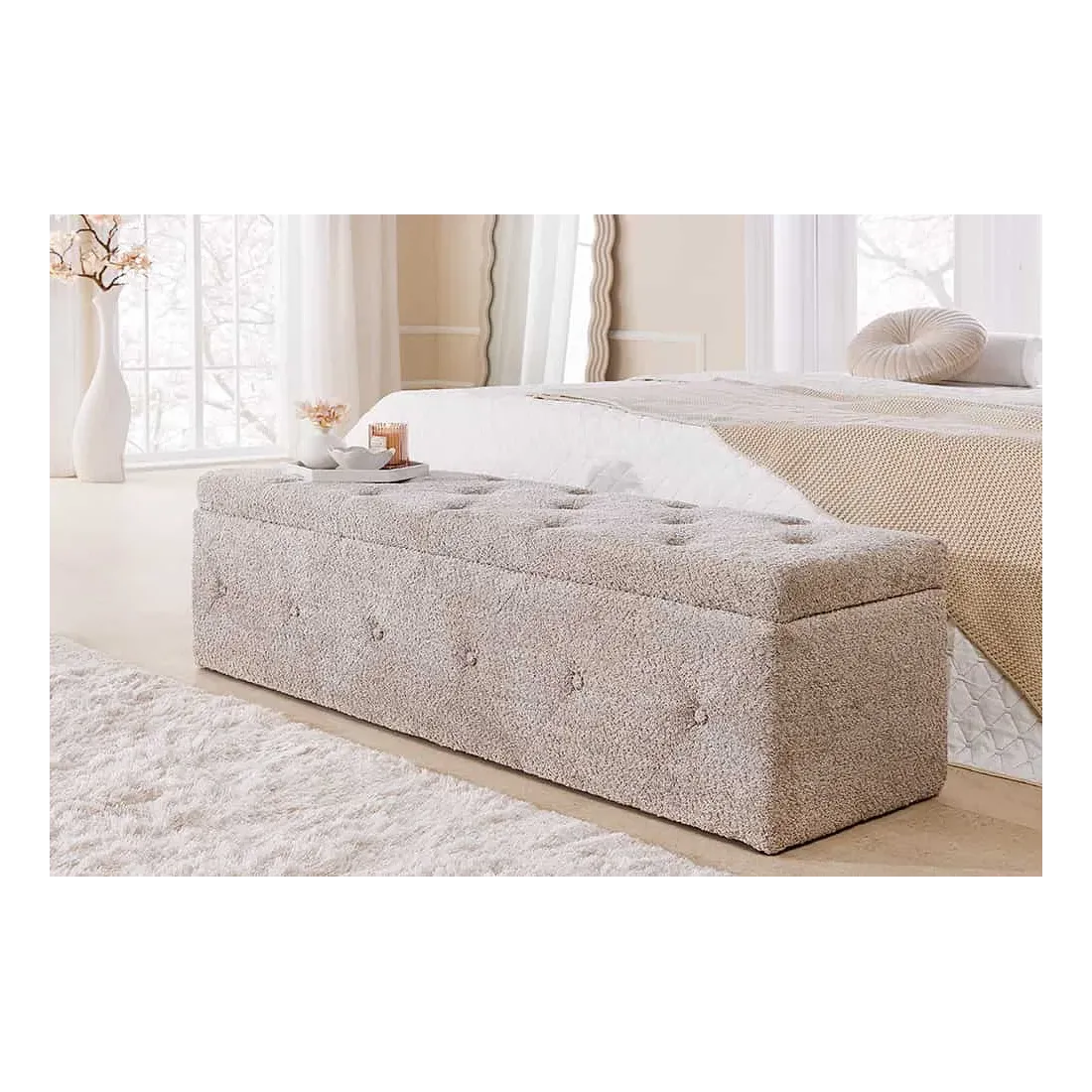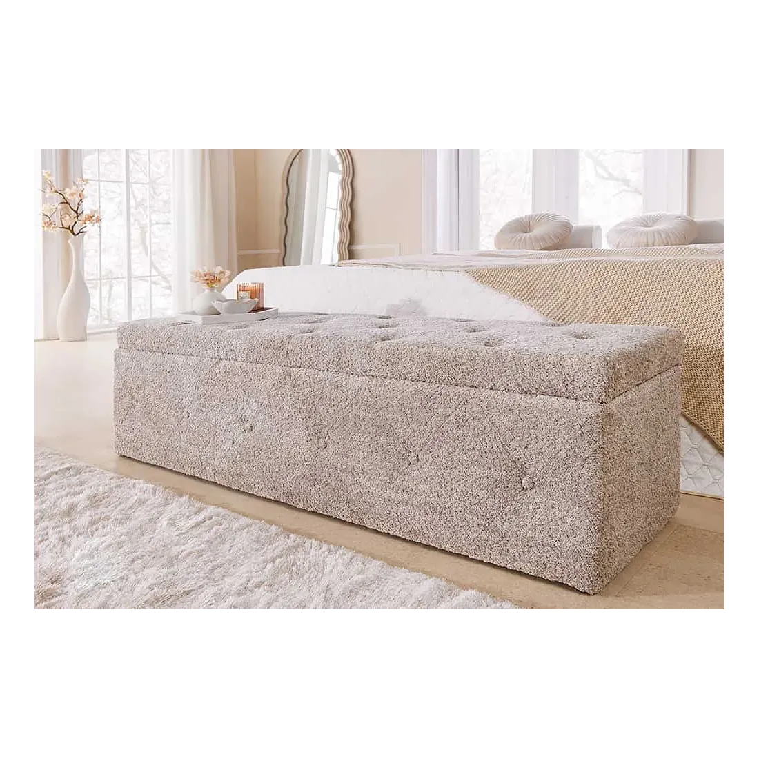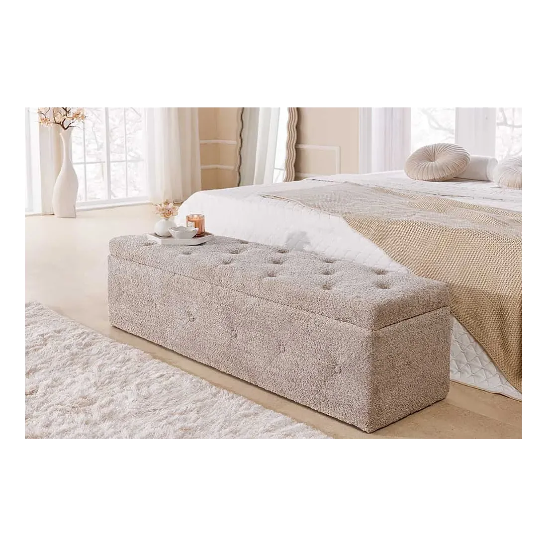 Banquette de lit Chesterfield EXTRAVAGANCIA 140 cm – Tissu bouclé champagner greige avec coffre de rangement intégré