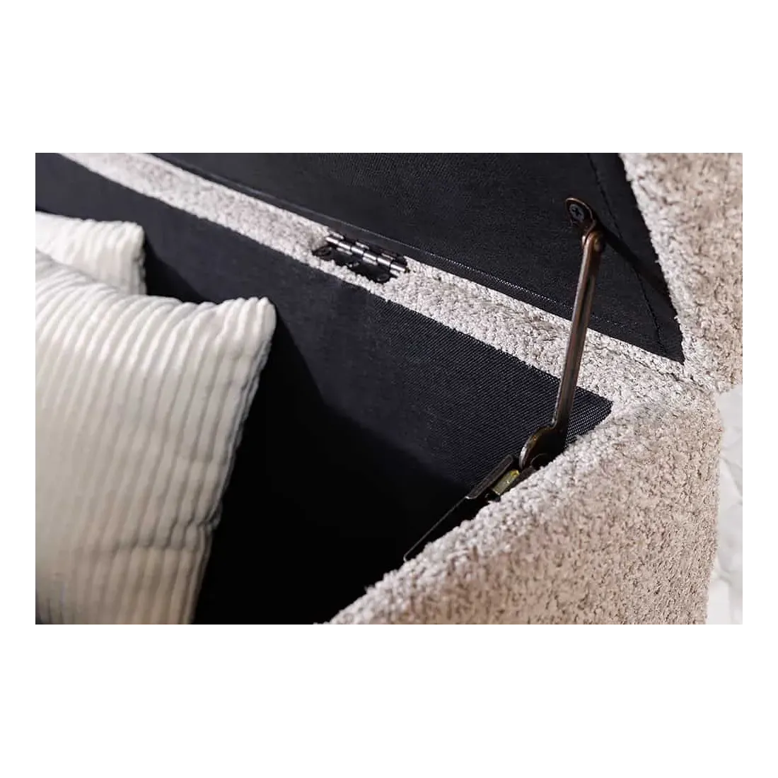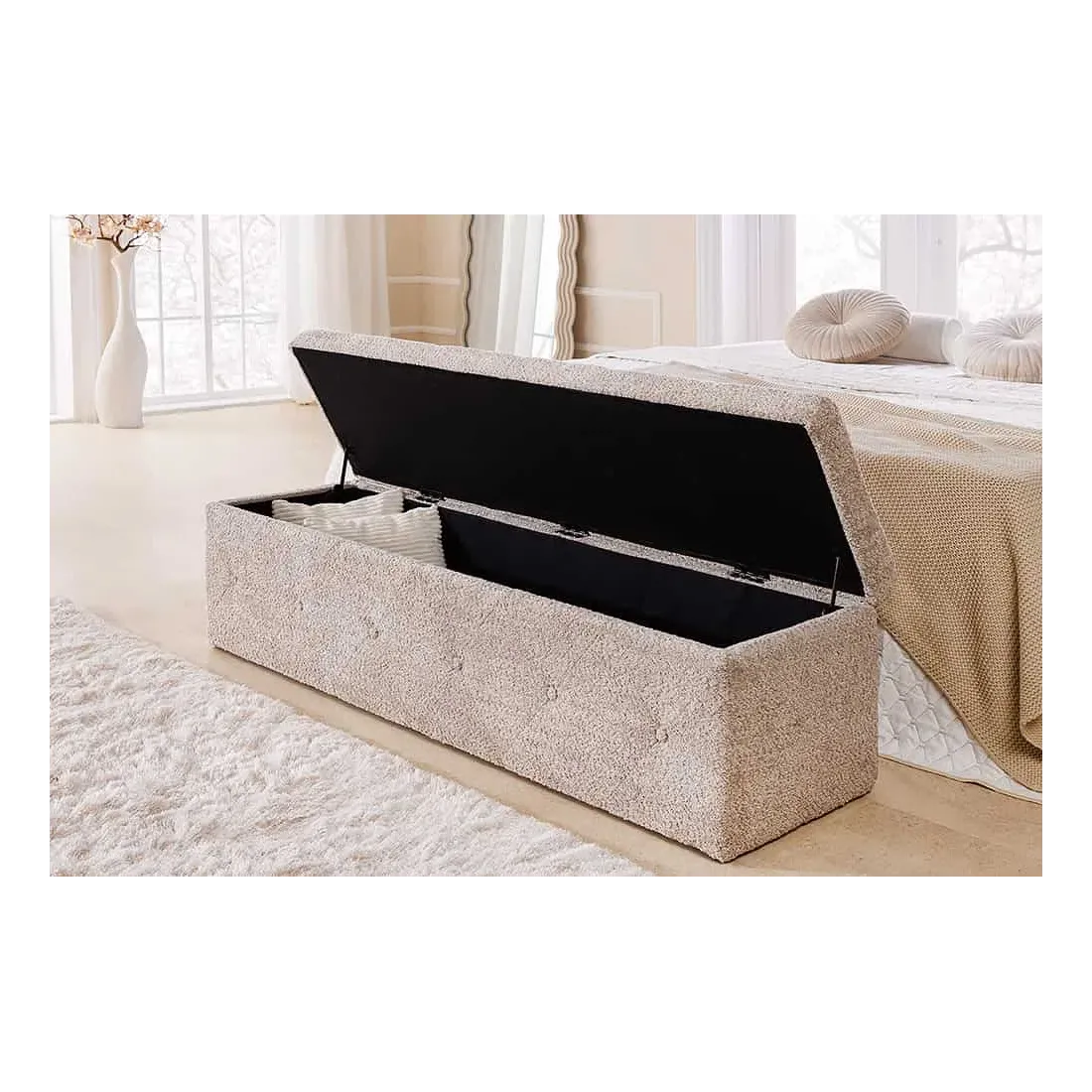 Mais EXTRAVAGANCIA ne se contente pas d’être belle : elle est aussi pratique. Son assise s’ouvre grâce à un couvercle rabattable pour révéler un coffre de rangement spacieux – parfait pour plaids, oreillers ou linge de lit.