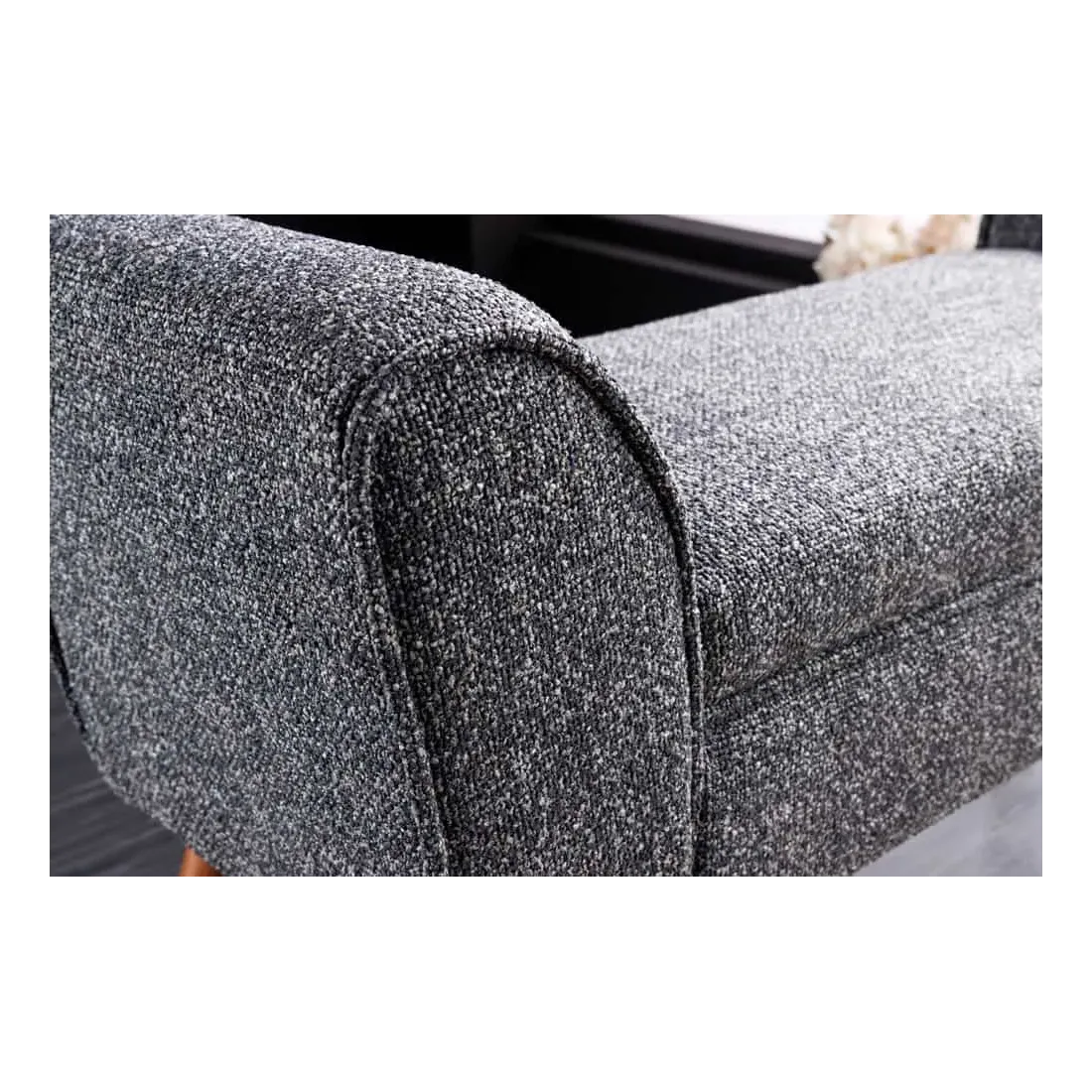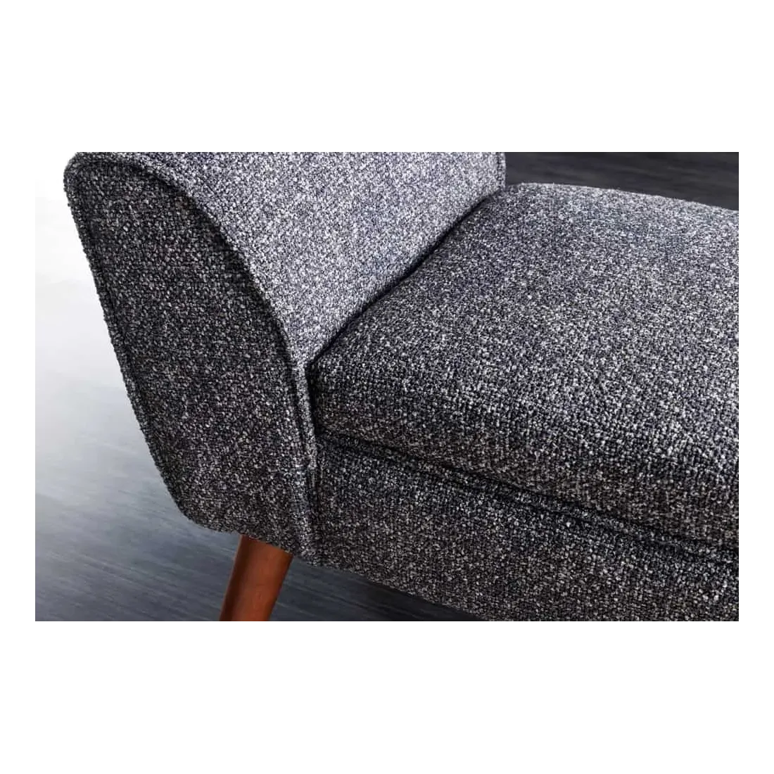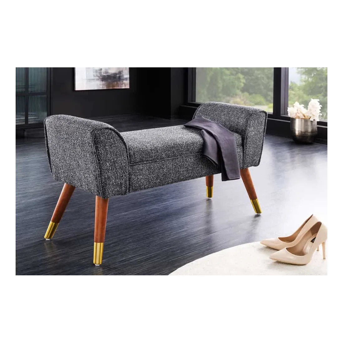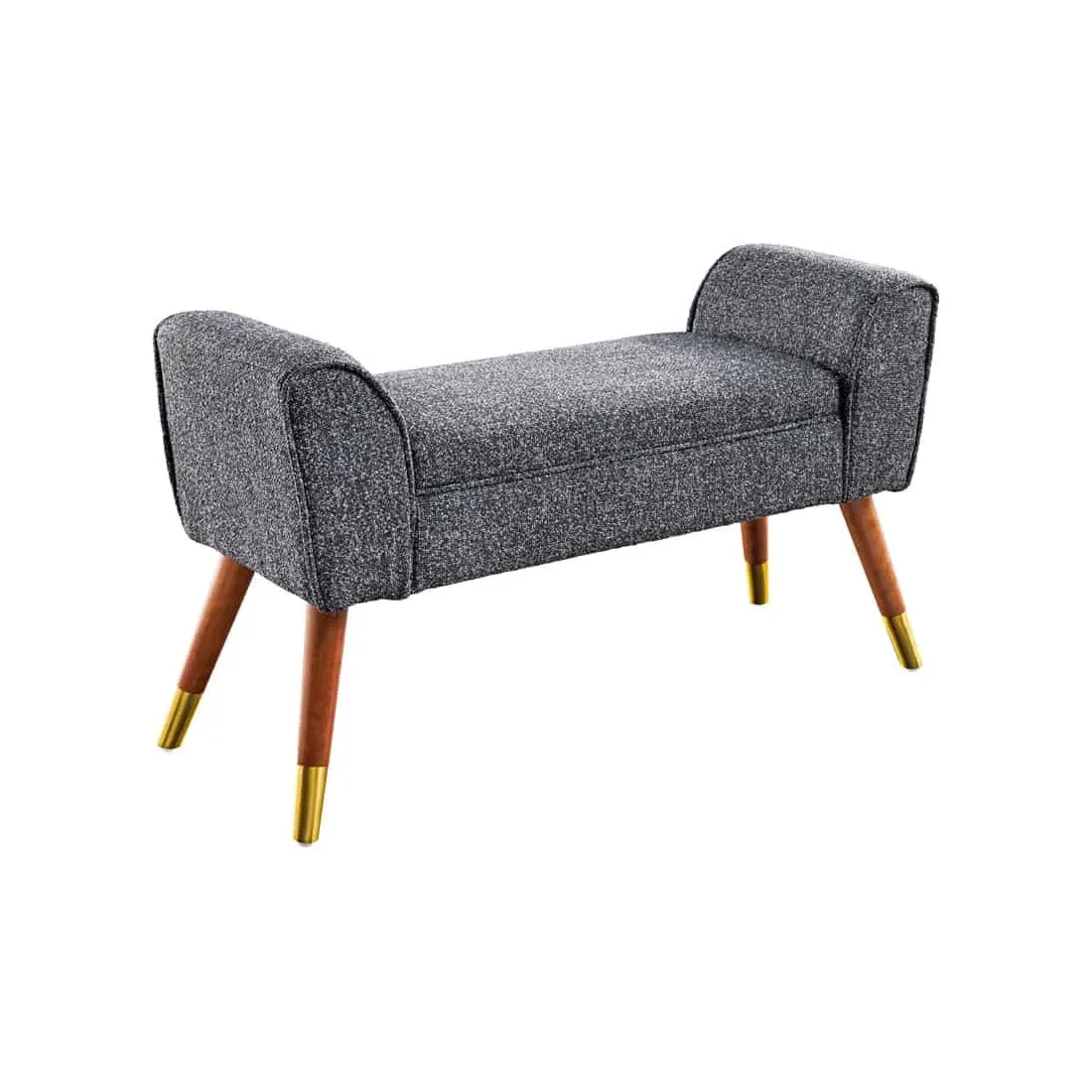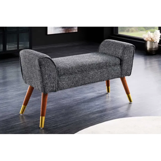 La banquette SCARLETT allie un design rétro raffiné à des finitions modernes. Avec son tissu bouclé anthracite et ses pieds en bois naturel soulignés de détails dorés, elle est idéale dans une entrée, une chambre ou en bout de lit. Son assise confortable et ses accoudoirs décoratifs en font un véritable atout déco.
