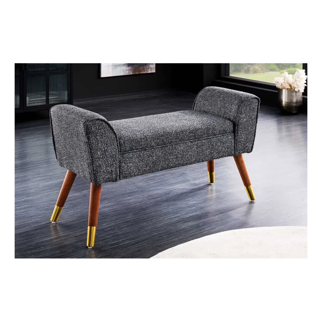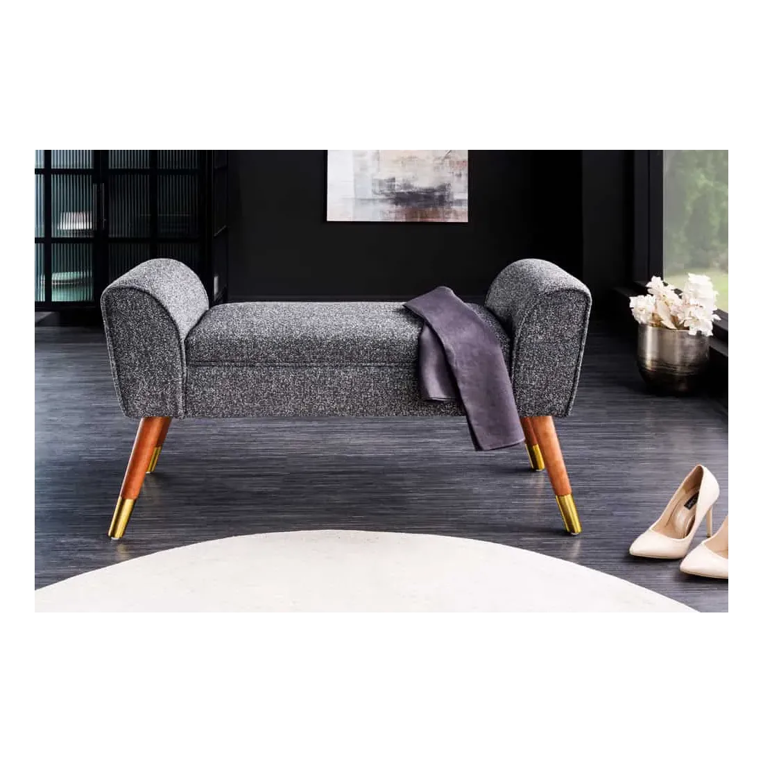 Banquette rétro SCARLETT – 90 cm – Tissu bouclé anthracite avec accoudoirs | Pieds bois & métal doré