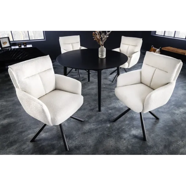 Inspiré des lignes rétro des années 60 et remis au goût du jour, le fauteuil pivotant BIG GEORGE est un véritable bijou de design et de confort. Son revêtement en tissu bouclé blanc, doux et texturé façon "teddy", apporte une touche cosy et élégante à tout type d’intérieur, que ce soit dans un salon contemporain, un bureau stylé ou une chambre tendance.