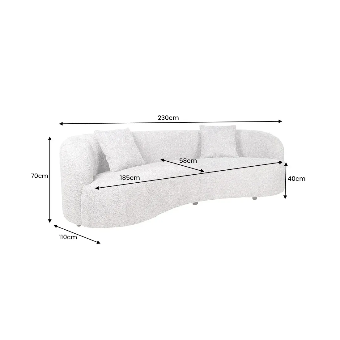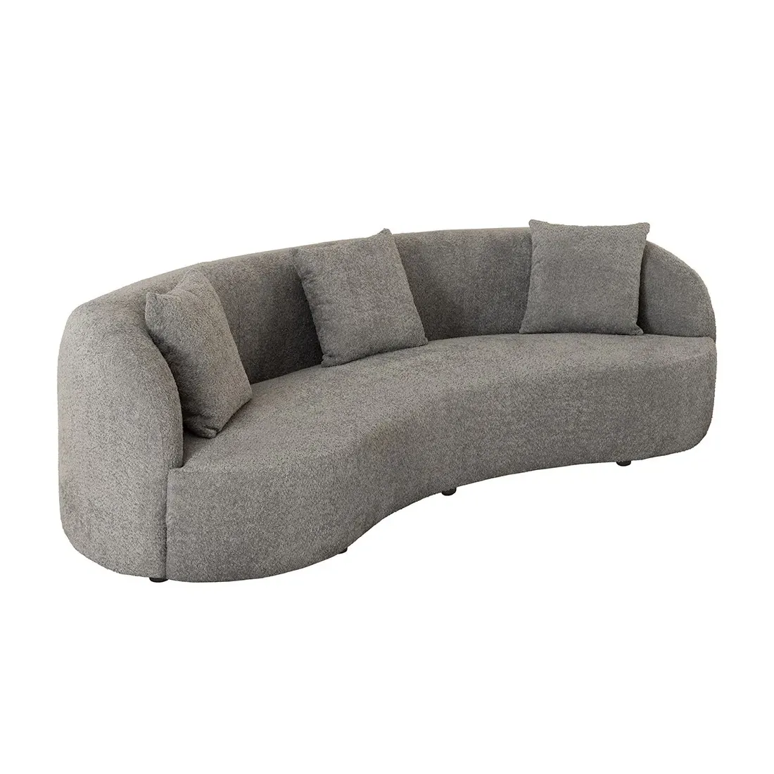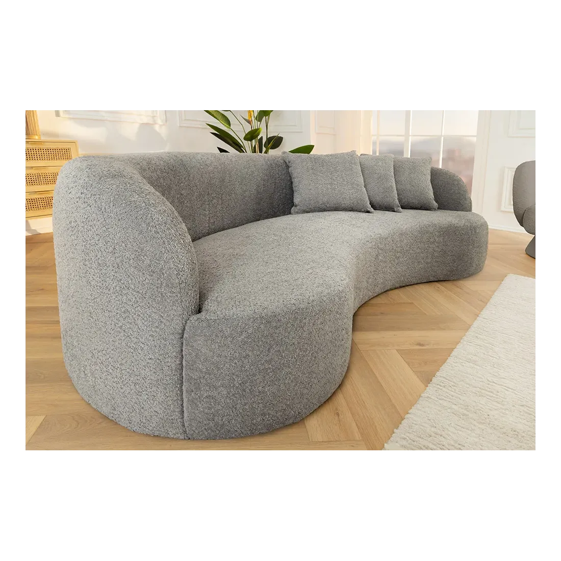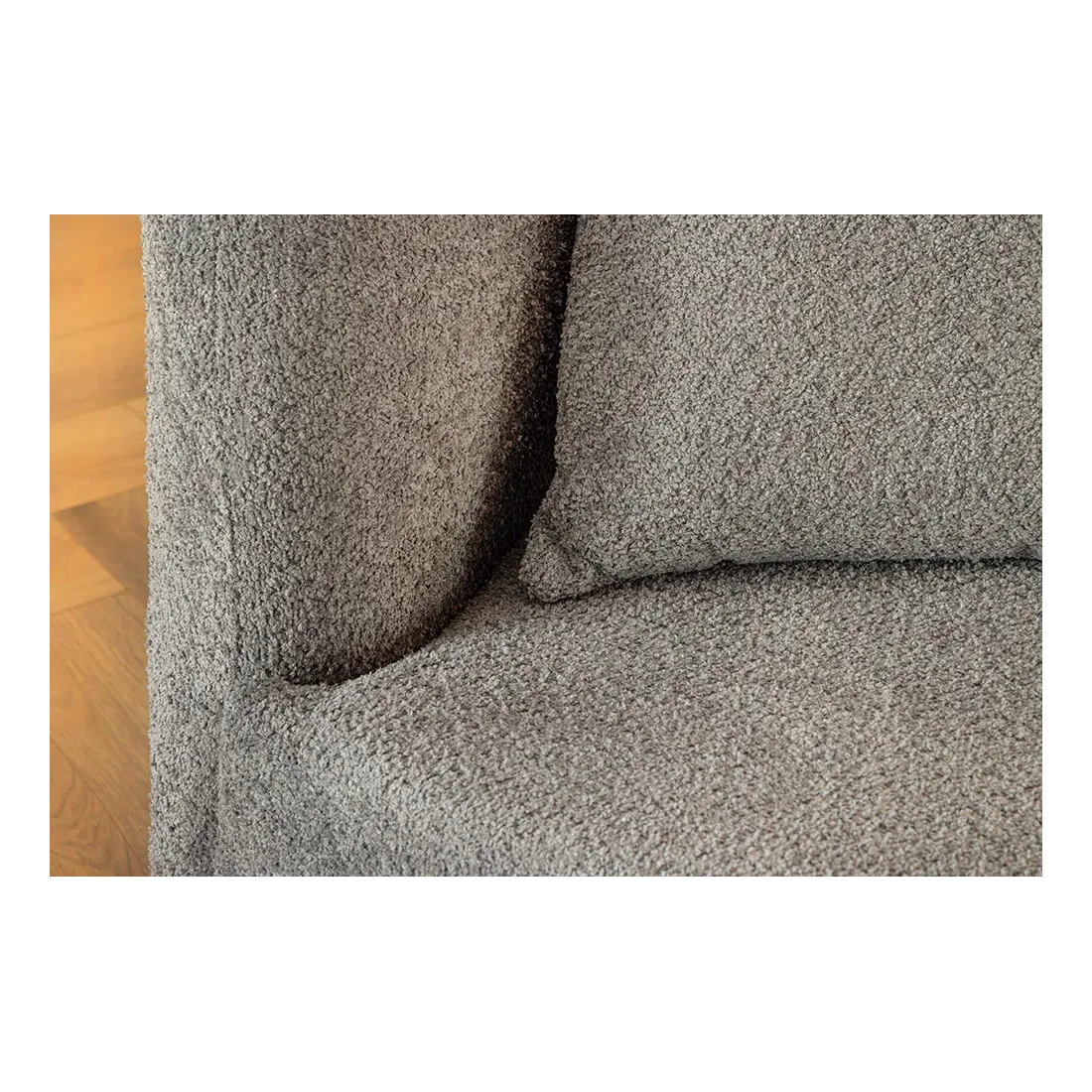 Son revêtement en tissu bouclé gris est à la fois doux au toucher et résolument tendance, tandis que ses lignes arrondies ajoutent une touche organique et contemporaine à votre décoration. Avec ses pieds noirs discrets (hauteur 4 cm), il semble flotter au sol, renforçant la légèreté de son design.