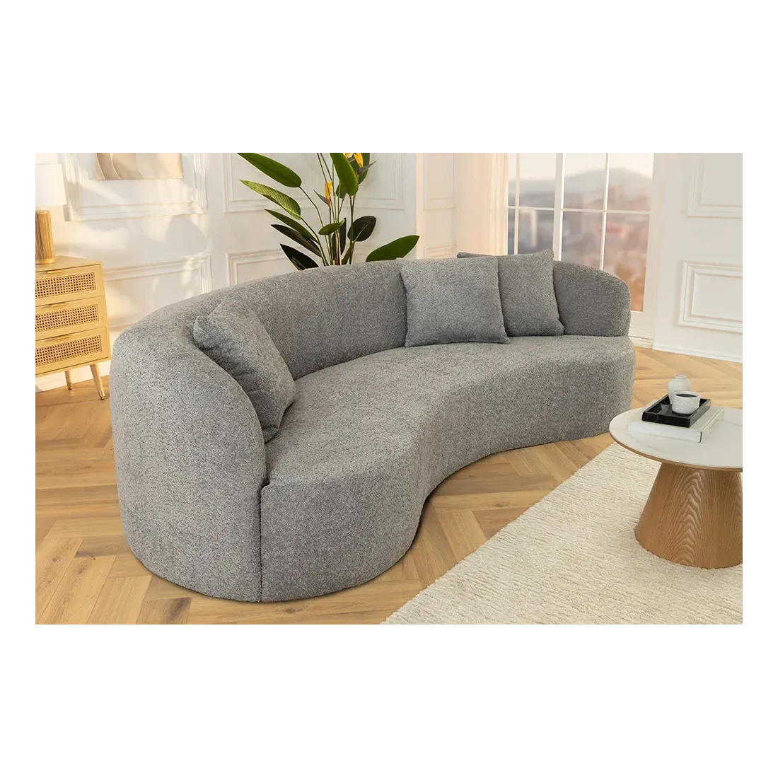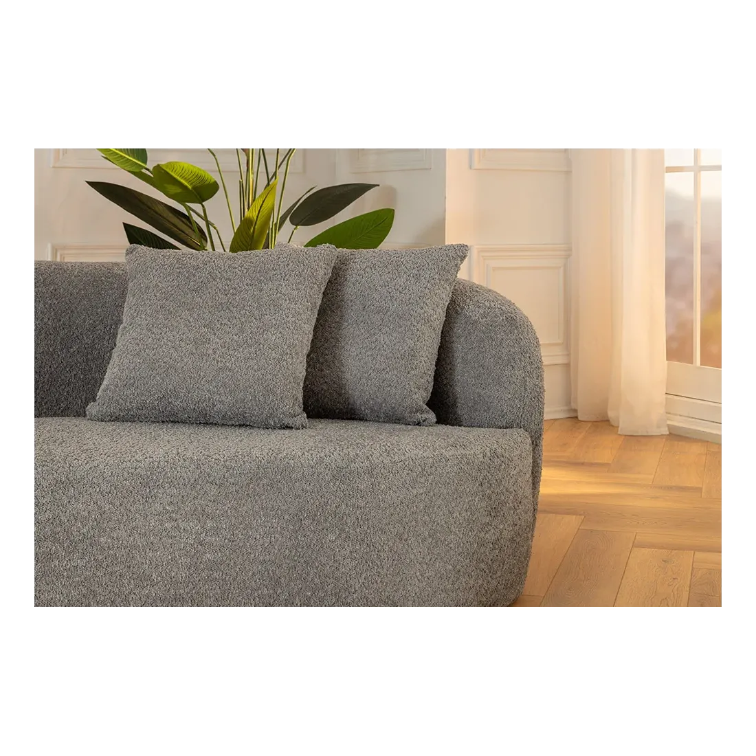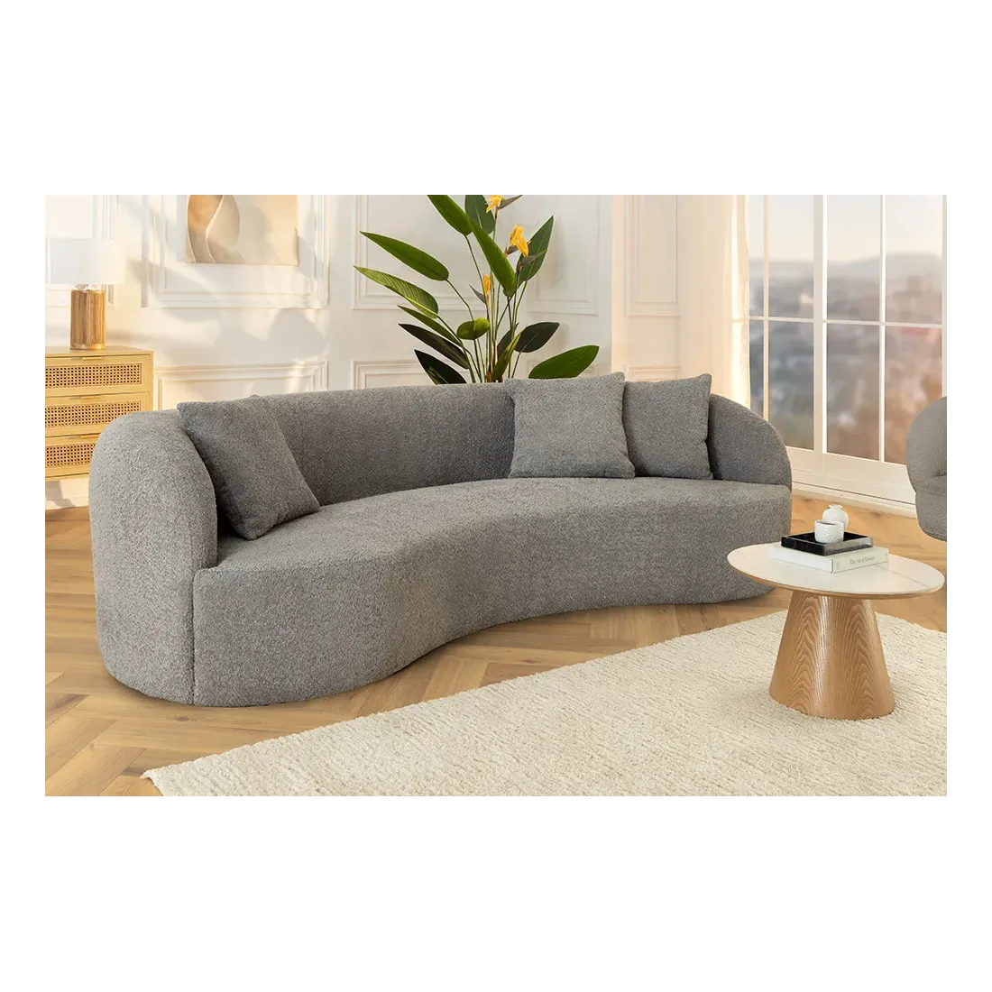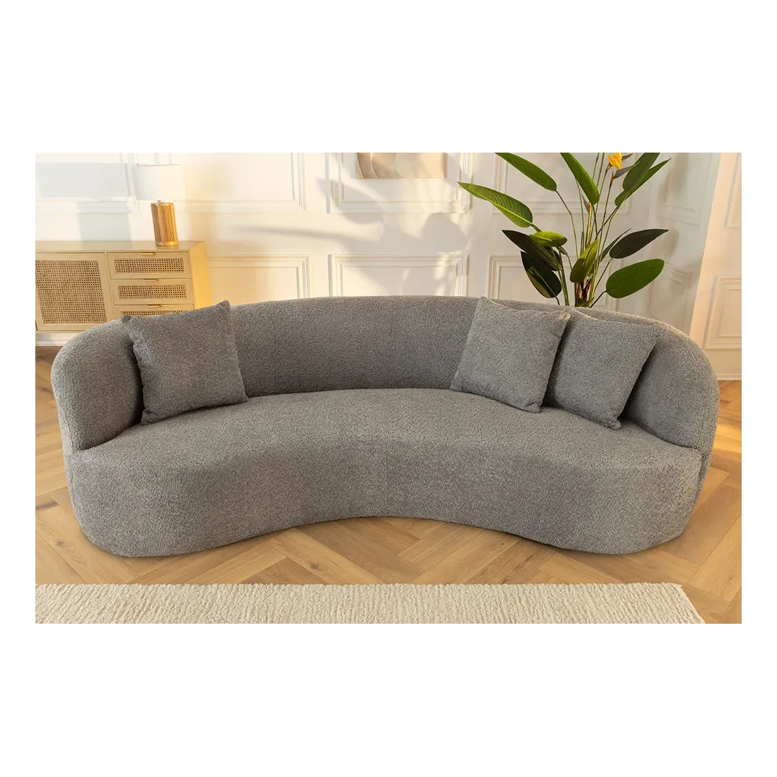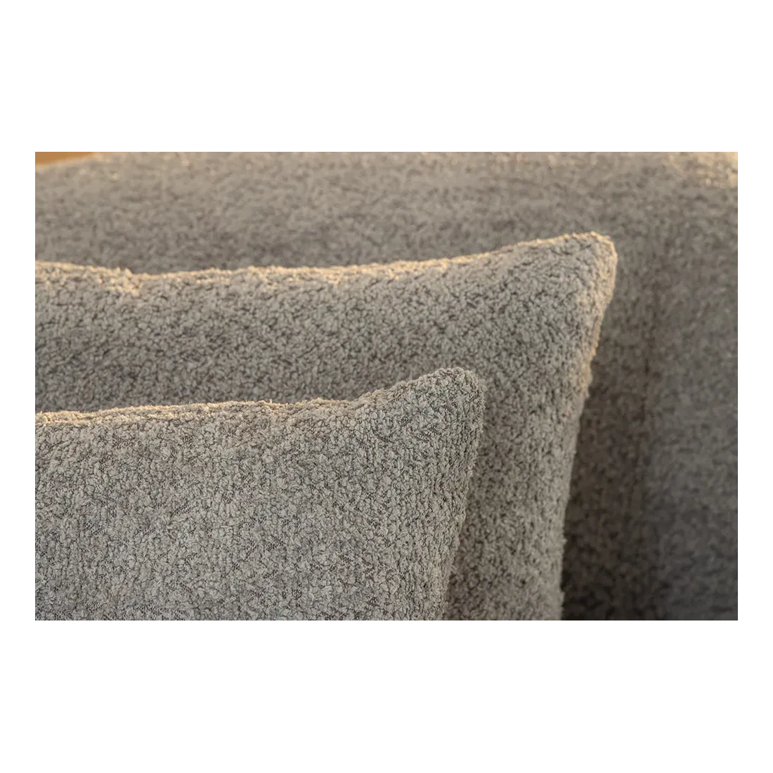 Canapé 3 places ATELIER – 230 cm – Tissu bouclé gris avec coussins inclus, design contemporain