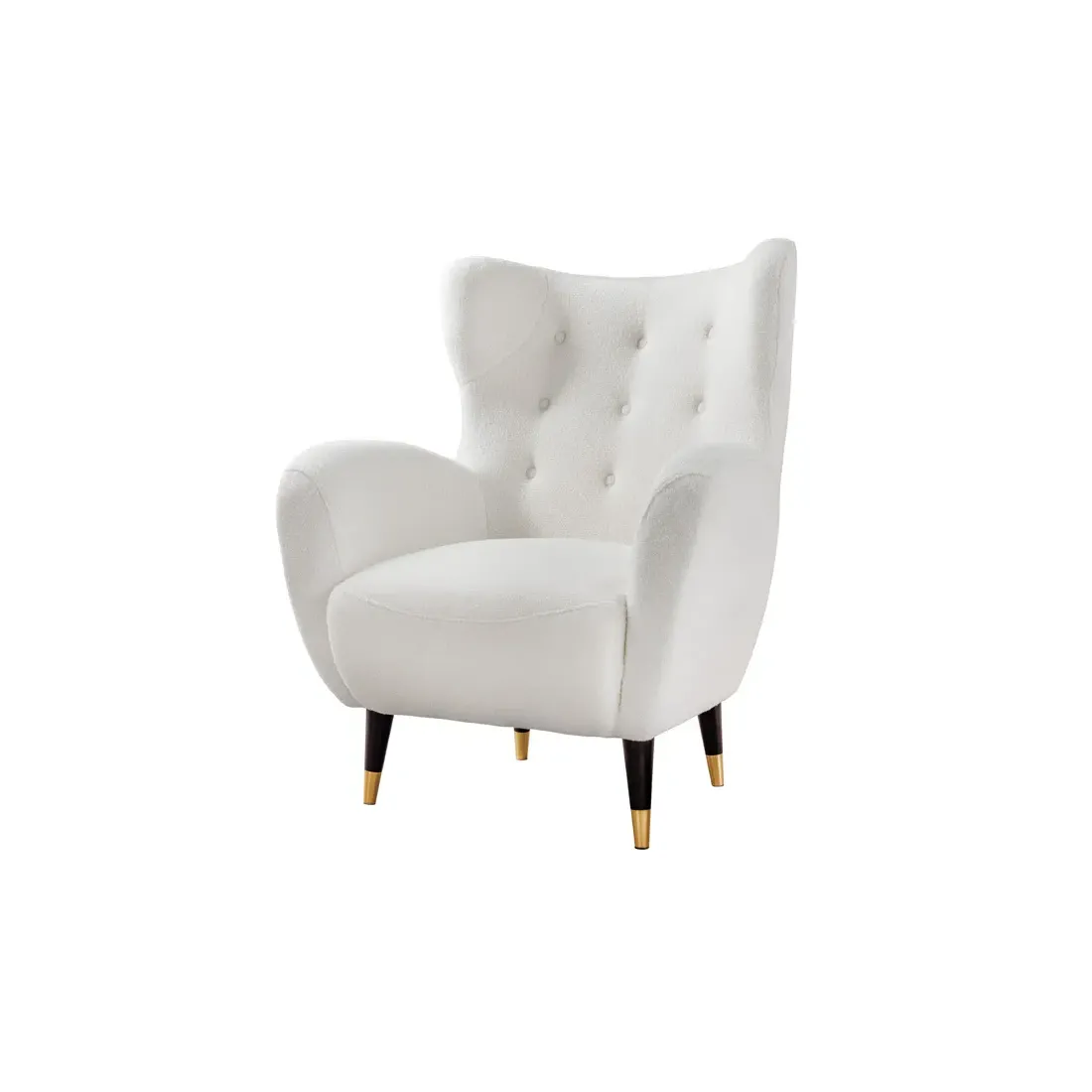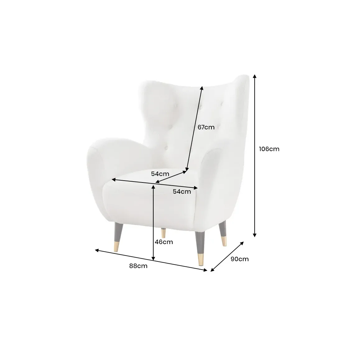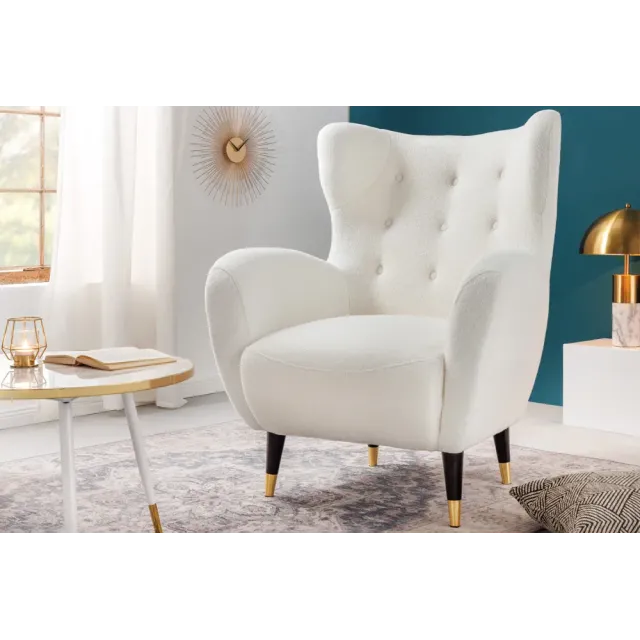 Le fauteuil DON allie charme vintage et confort moderne. Avec son revêtement en tissu bouclé blanc ultra doux, ses finitions dorées raffinées et son assise à ressorts ensachés, il s’impose comme la pièce maîtresse de votre salon ou coin lecture. Idéal pour les amateurs de design rétro, sans compromis sur le confort.