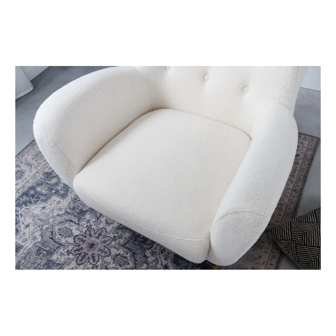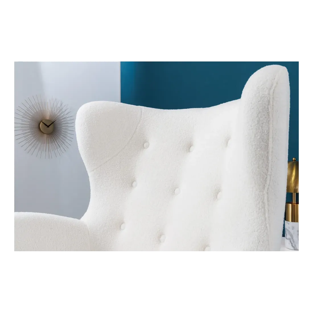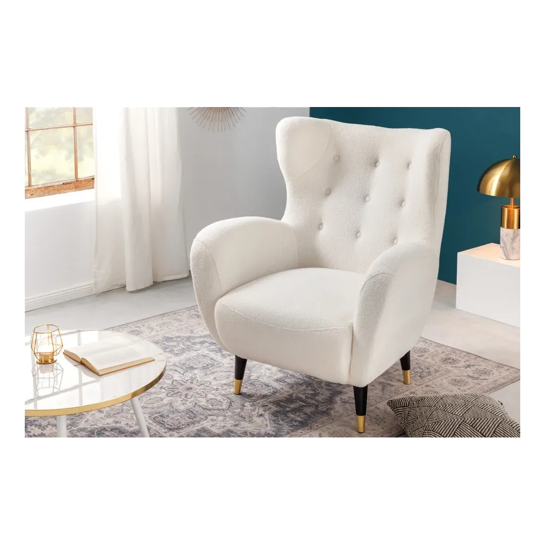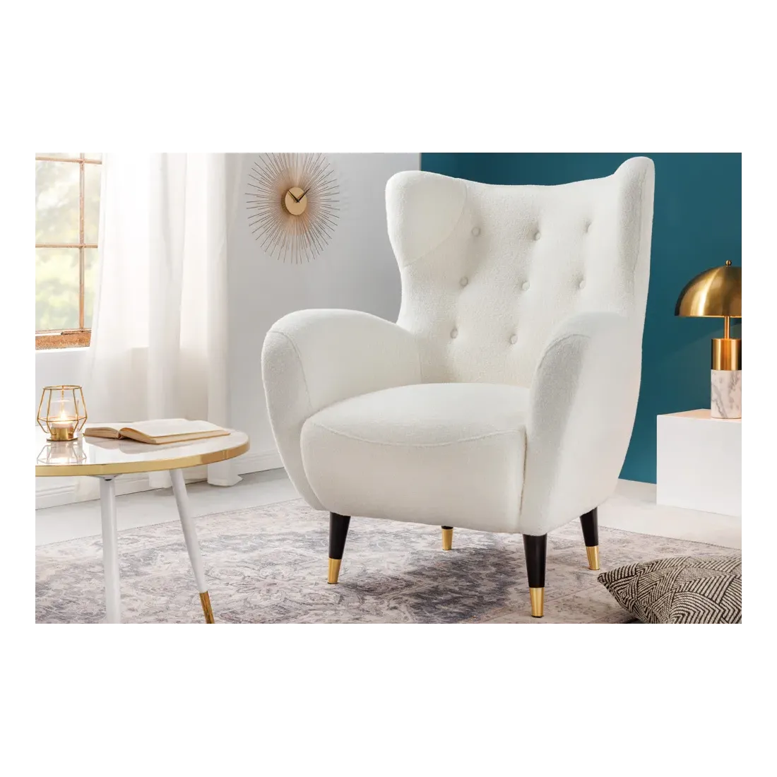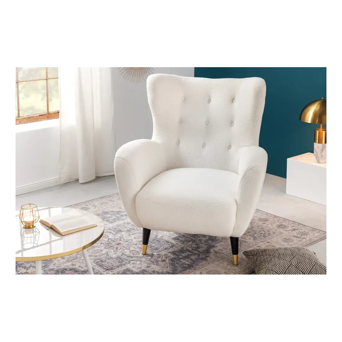 Fauteuil rétro DON en tissu bouclé blanc – Design élégant avec assise à ressorts et pieds noirs dorés