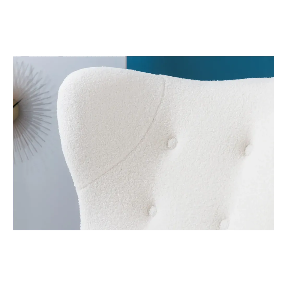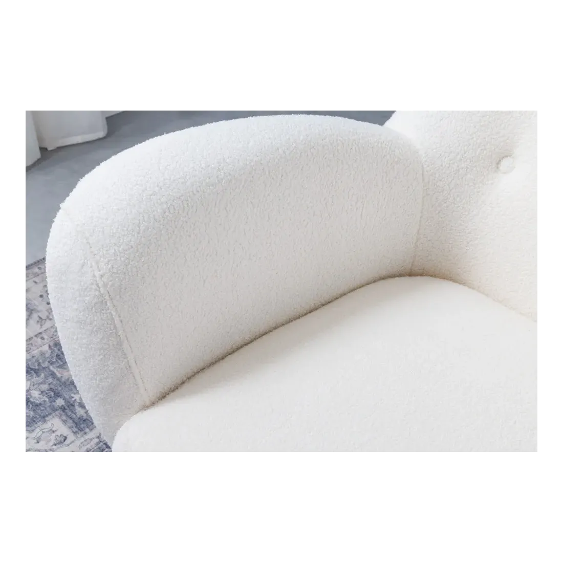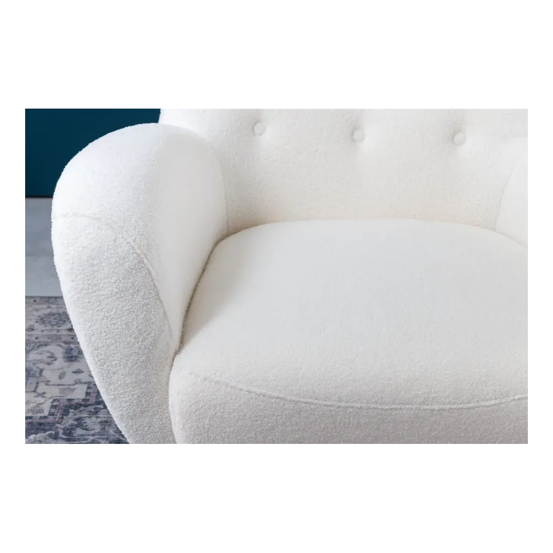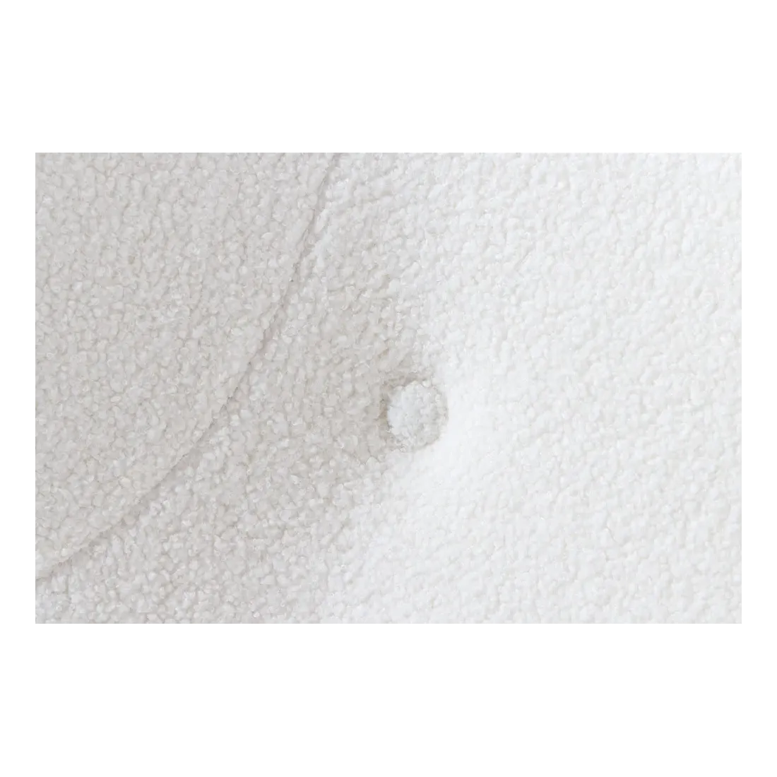 Son revêtement bouclé blanc, à la texture douce et chaleureuse, apporte une touche de cocooning irrésistible. Le dossier haut, les accoudoirs arrondis et l’assise profonde vous invitent à de véritables moments de détente.