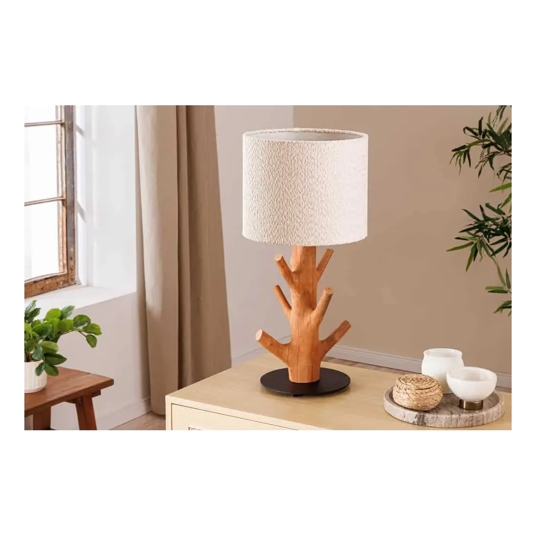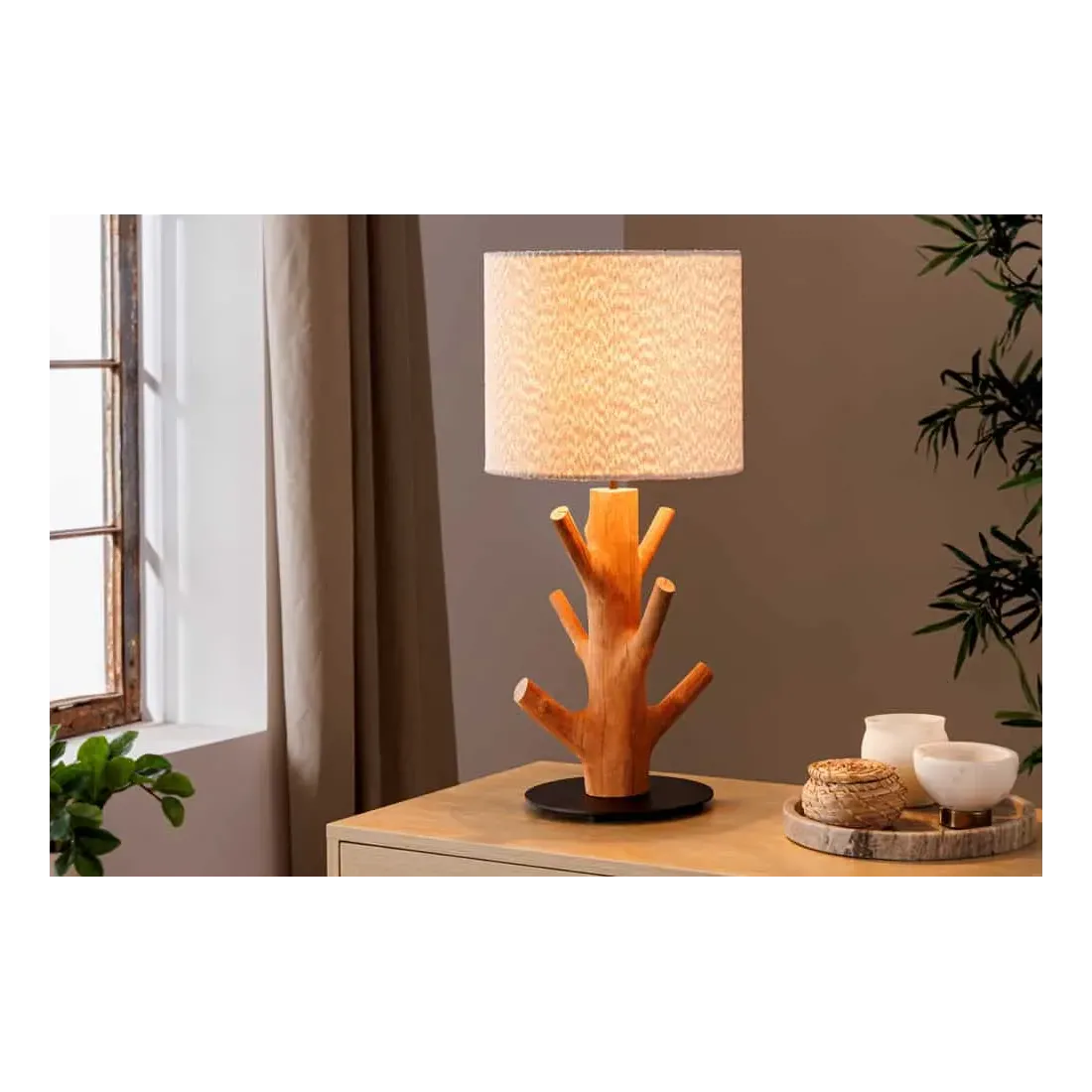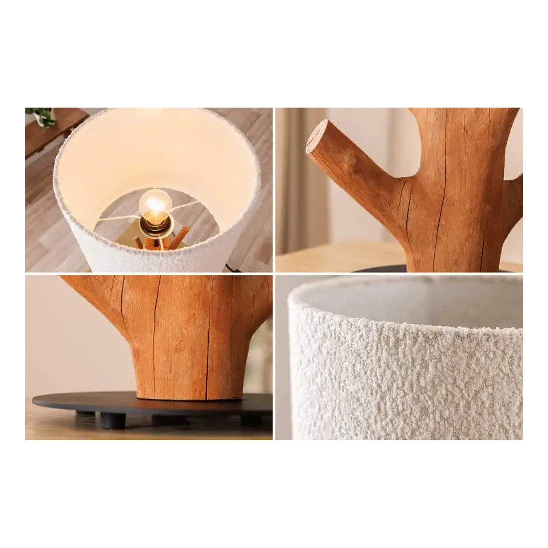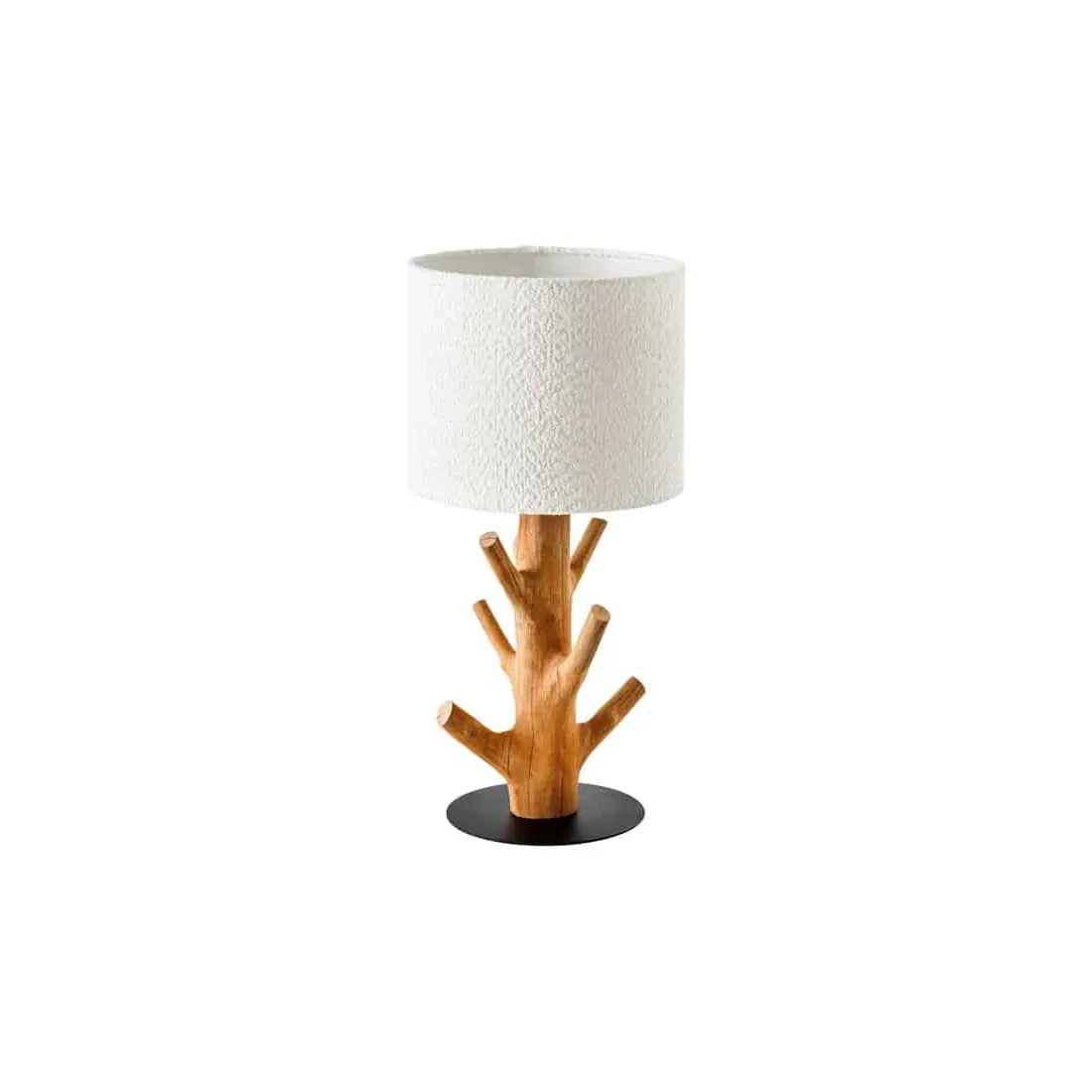 Le contraste entre le socle en métal noir laqué et le bois naturel crée un équilibre subtil entre design moderne et inspiration organique. L’abat-jour blanc en tissu polyester diffuse une lumière douce, parfaite pour une ambiance cosy dans un salon, une chambre ou un bureau.