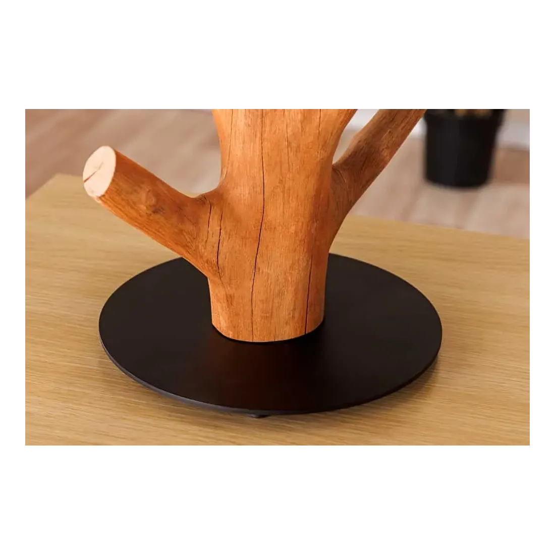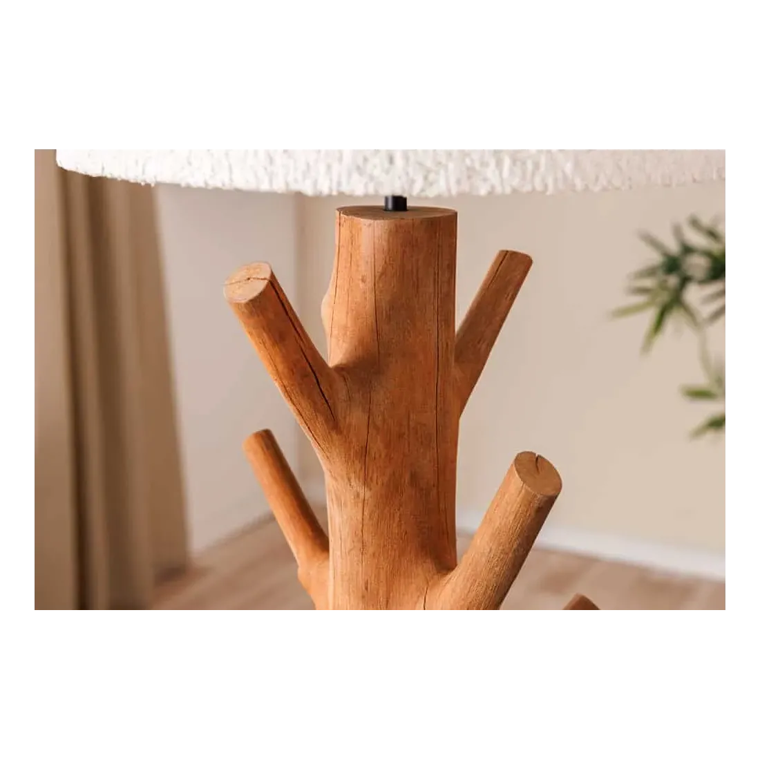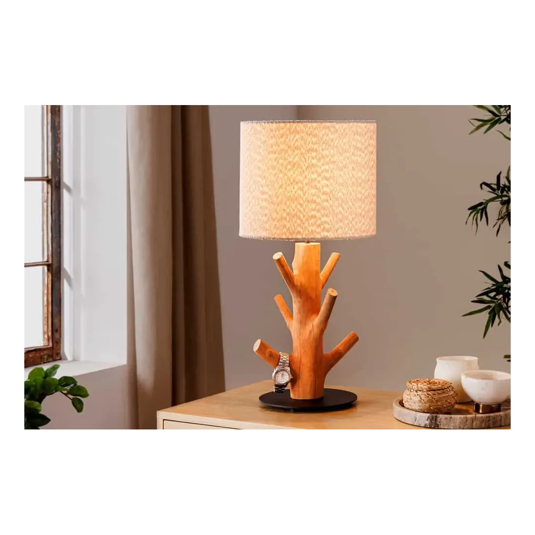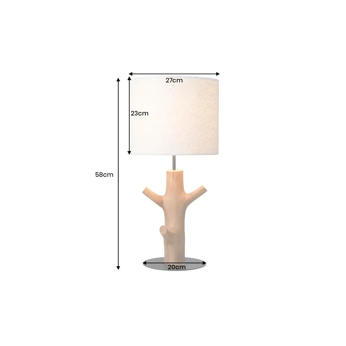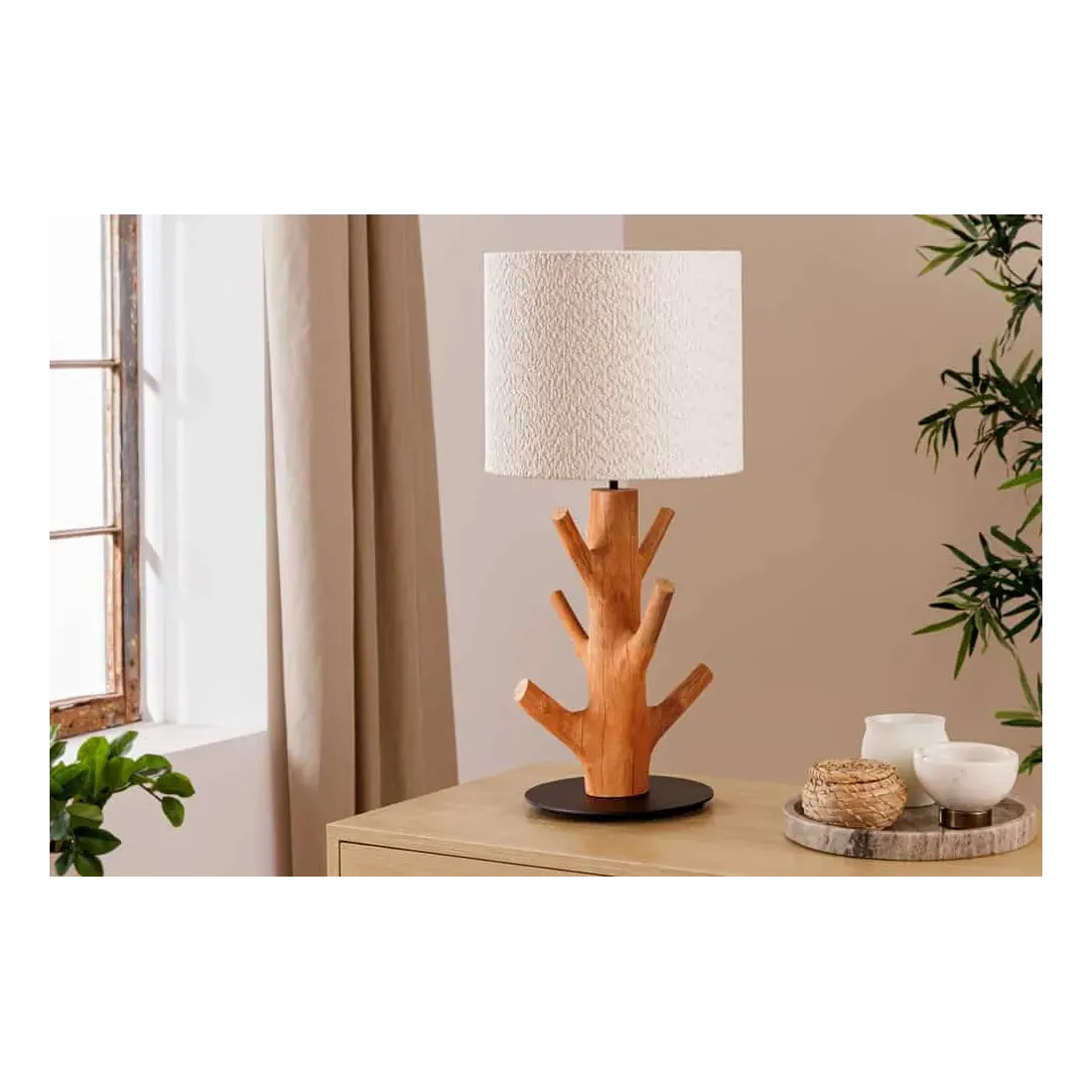 Le contraste entre le socle en métal noir laqué et le bois naturel crée un équilibre subtil entre design moderne et inspiration organique. L’abat-jour blanc en tissu polyester diffuse une lumière douce, parfaite pour une ambiance cosy dans un salon, une chambre ou un bureau.