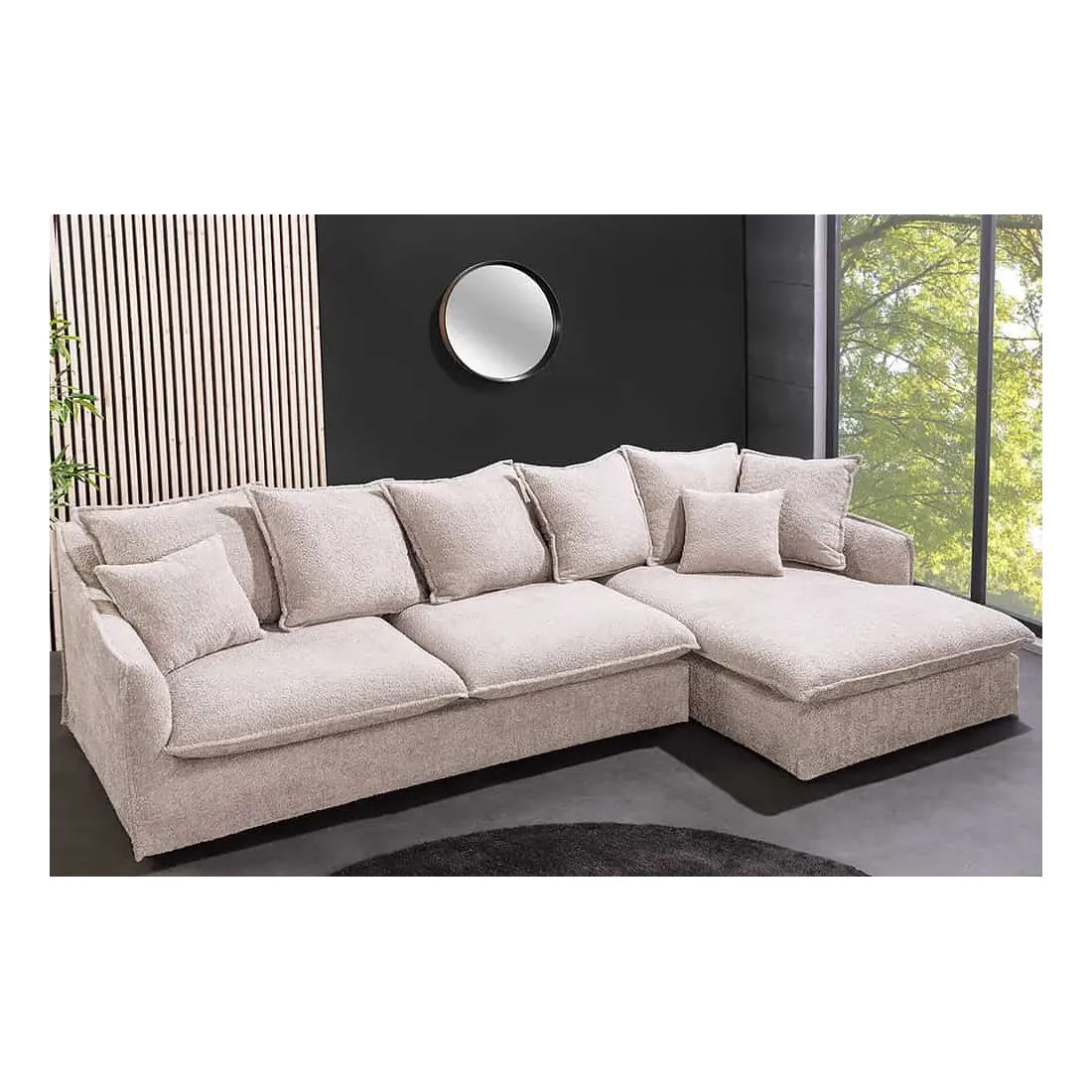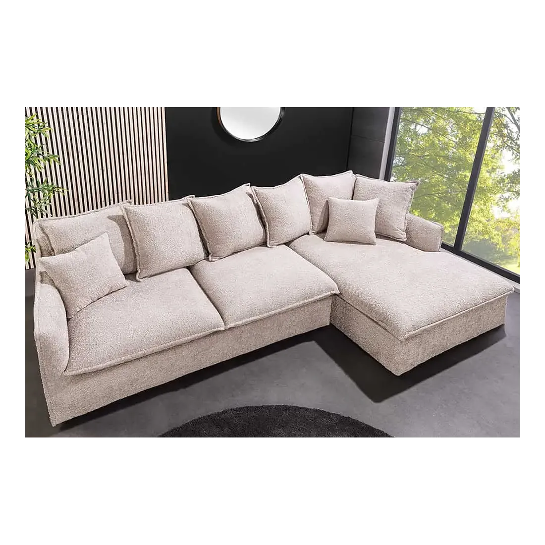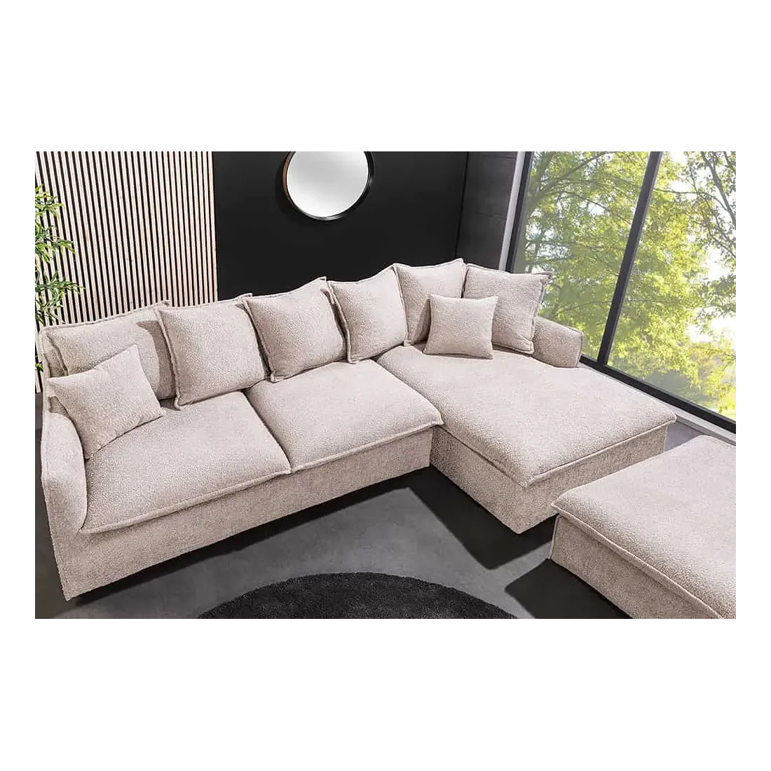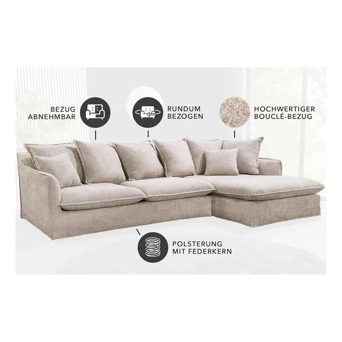 Canapé d’angle HEAVEN 255 cm en bouclé champagne beige – Grand canapé avec ottomane et coussins inclus