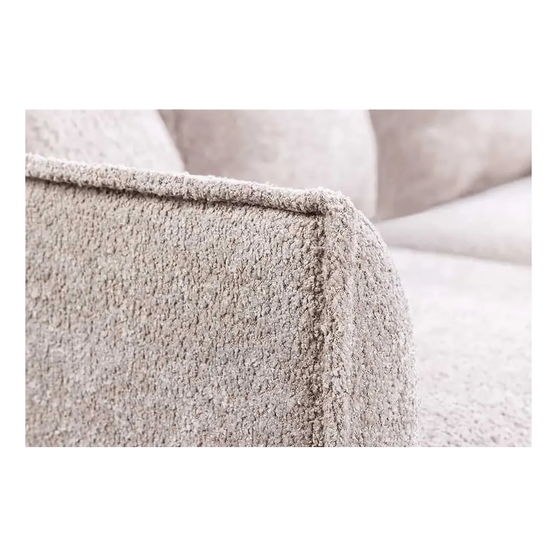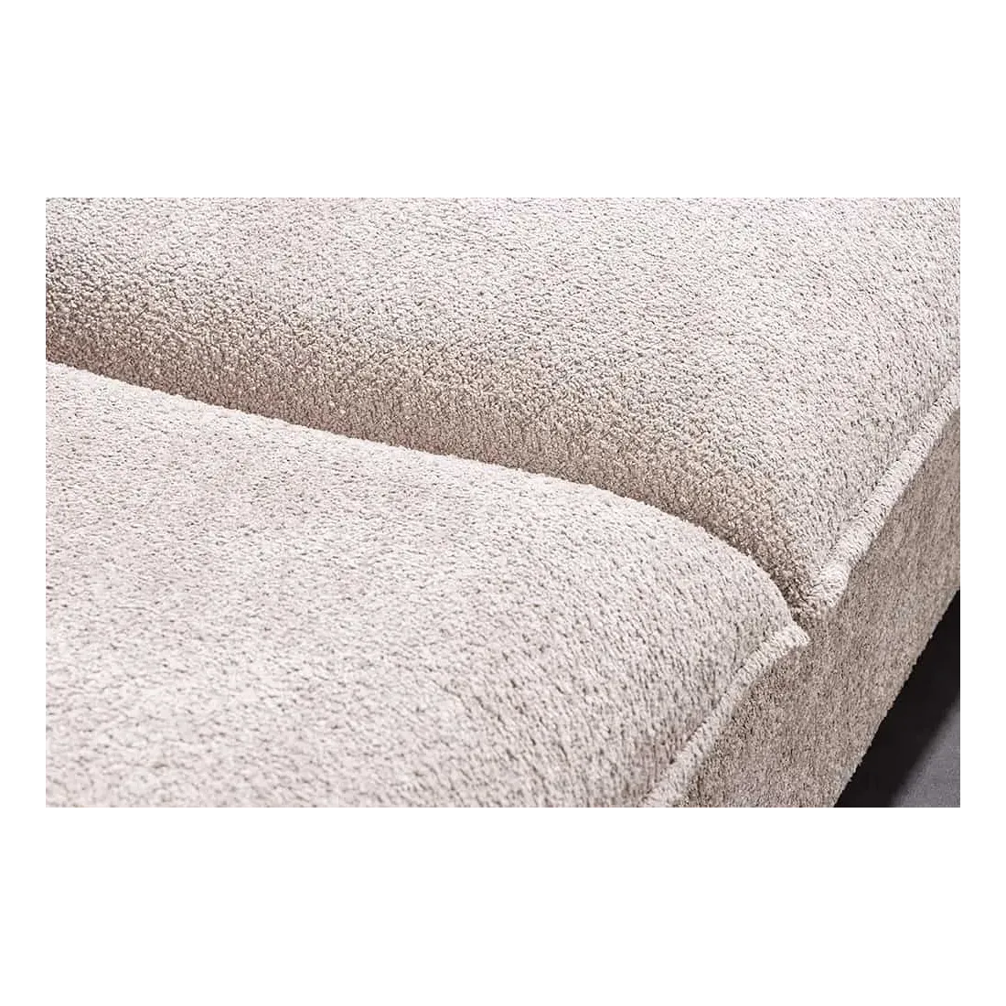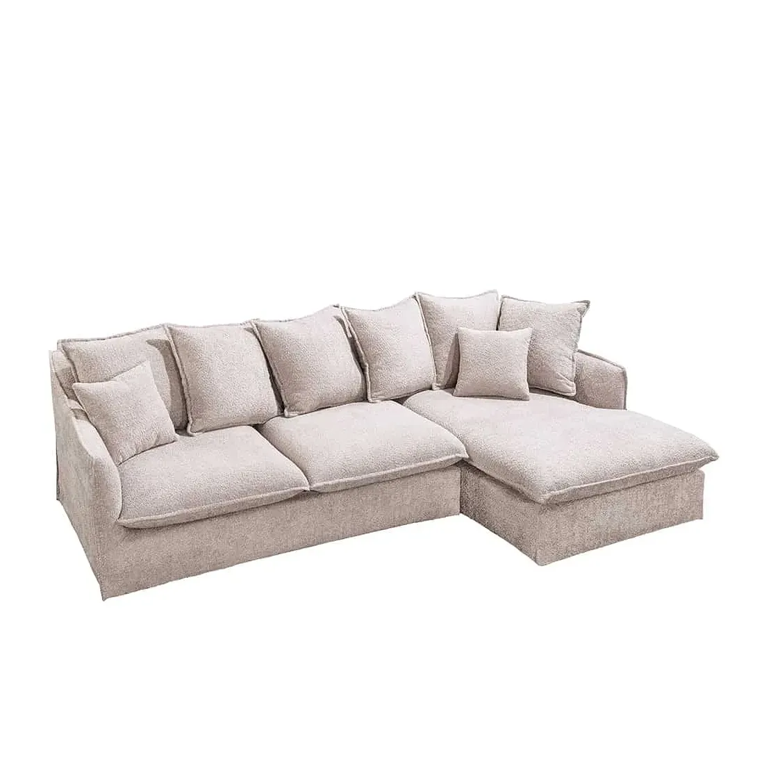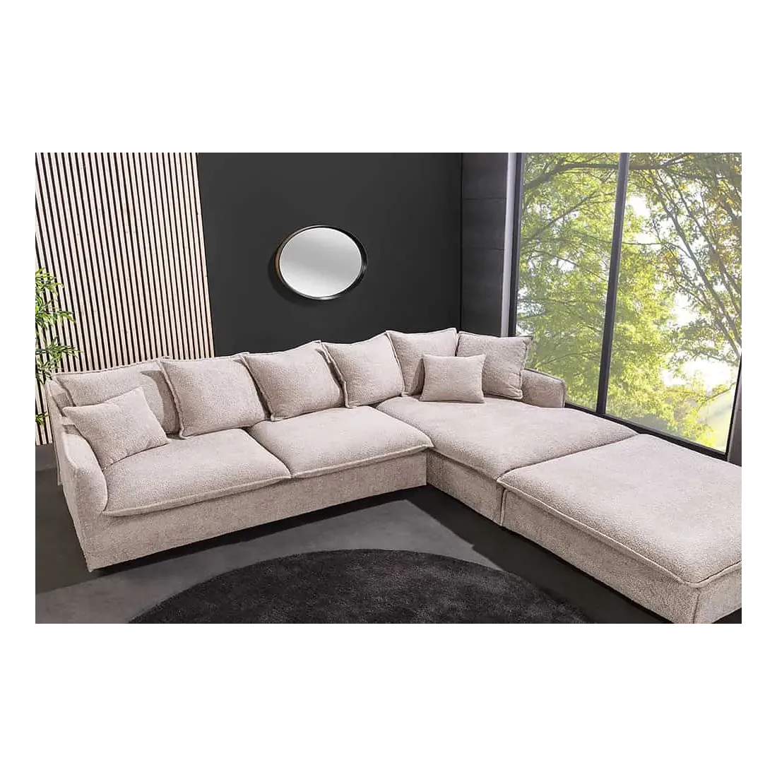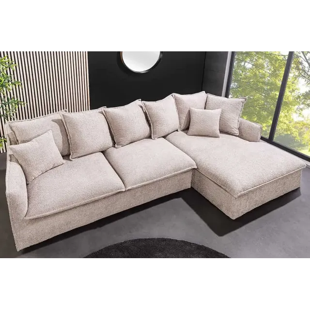 Canapé d’angle HEAVEN 255 cm en bouclé champagne beige – Grand canapé avec ottomane et coussins inclus