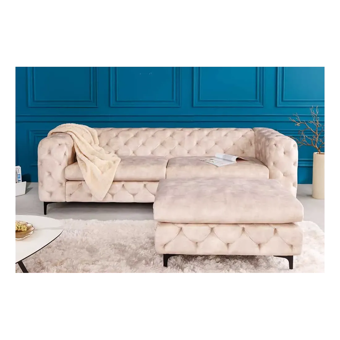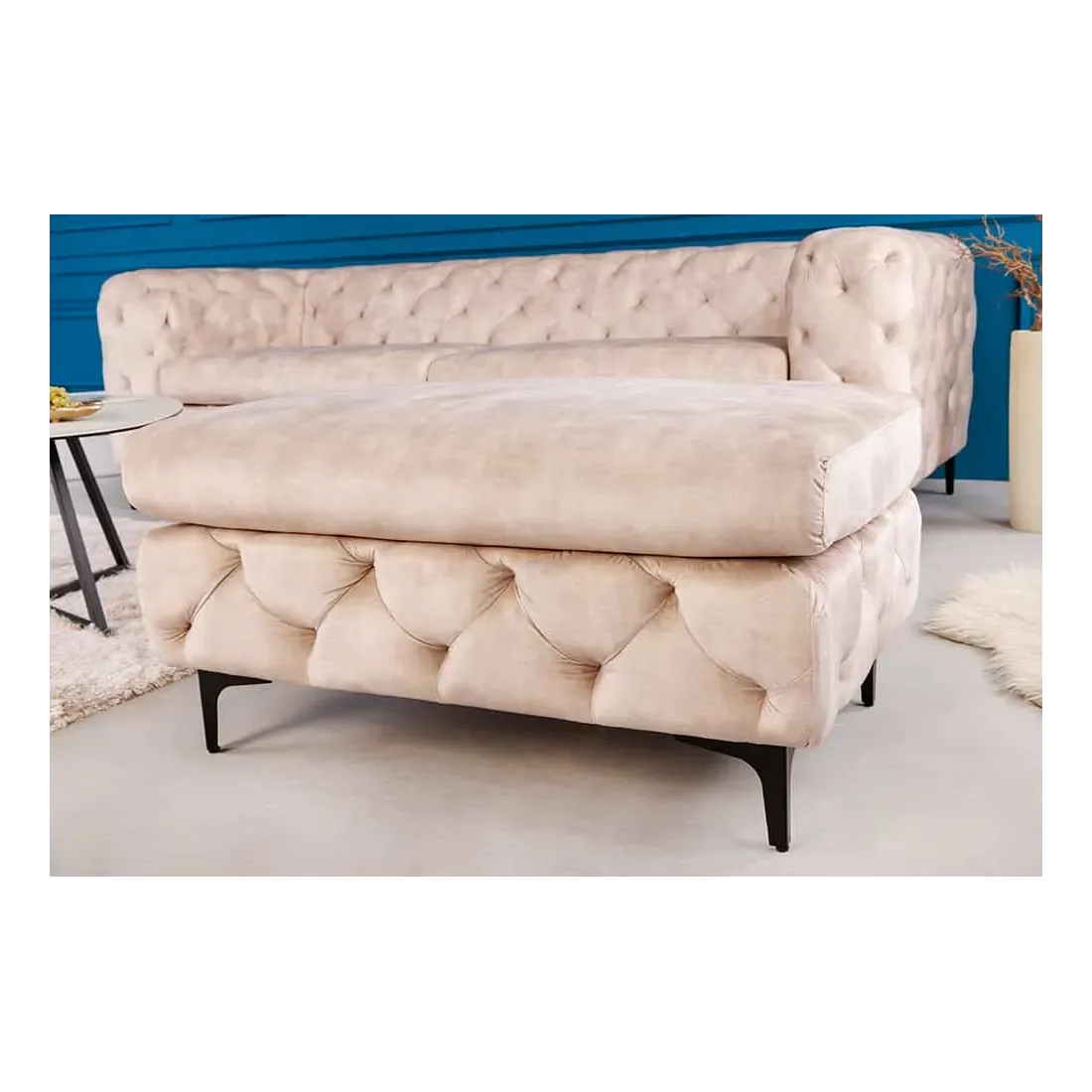 Son revêtement en velours doux champagne (100 % polyester) capte la lumière et donne un aspect brillant sophistiqué. Le capitonnage Chesterfield, emblématique, confère à l’ensemble un look royal.