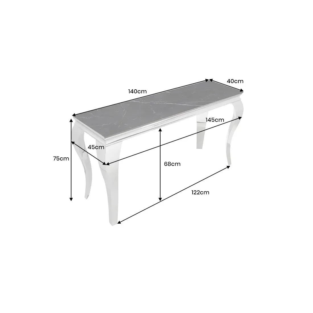 La console baroque moderne de 140 cm séduit par sa vaste surface en céramique noire anthracite au style marbré, montée sur des pieds chromés au design sculpté. Parfaite pour un intérieur luxueux et intemporel, elle allie style et fonctionnalité avec brio.