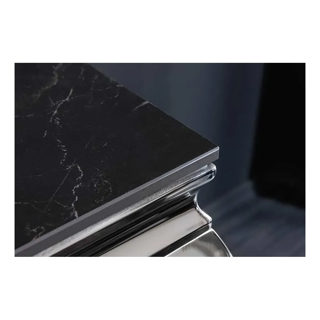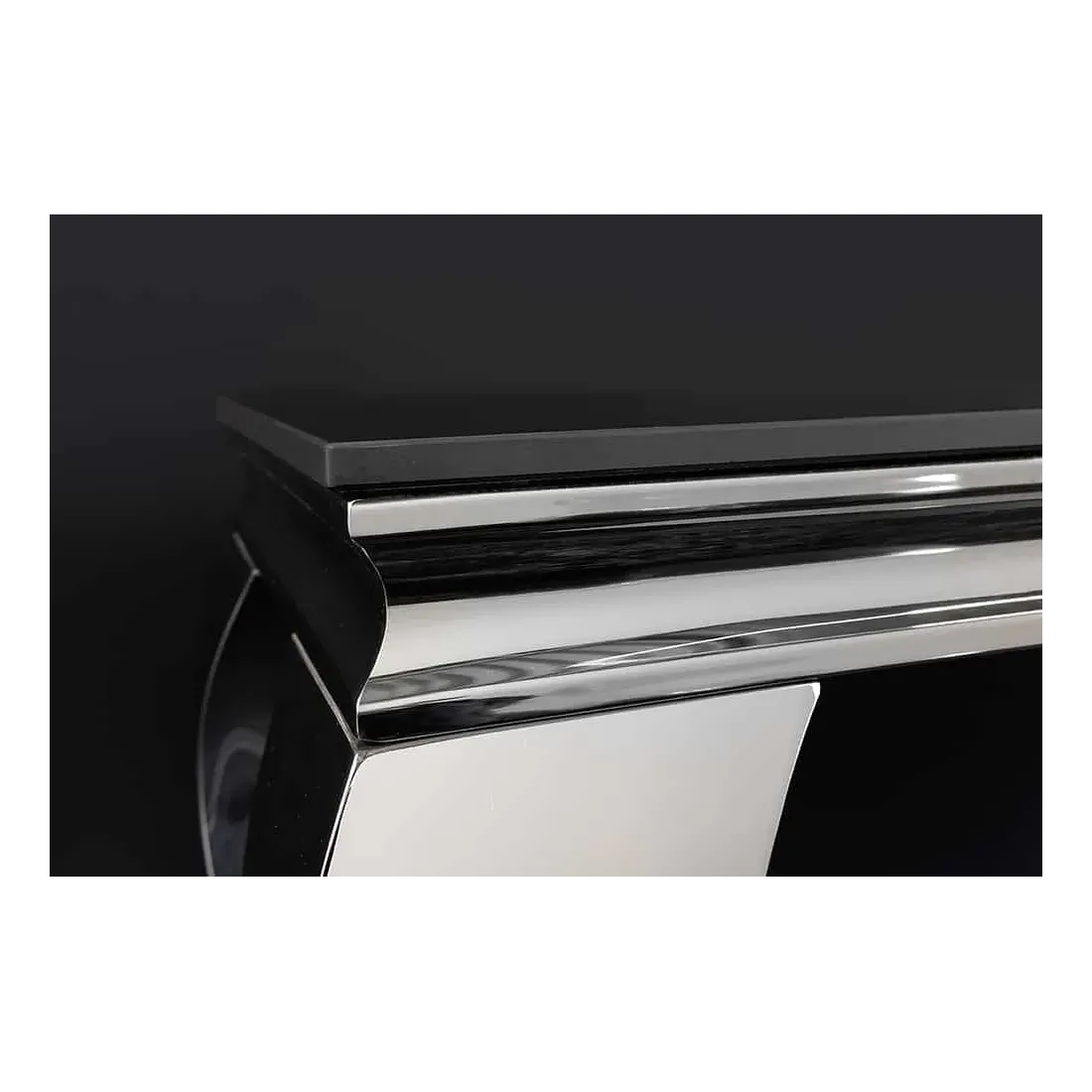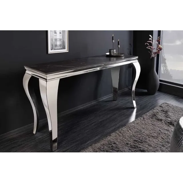 La console design baroque moderne 140 cm incarne le meilleur du style baroque contemporain. Sa silhouette aux pieds galbés en inox chromé fait référence à l’élégance classique, tandis que sa plateau en céramique noir anthracite effet marbre apporte une touche résolument moderne et luxueuse.