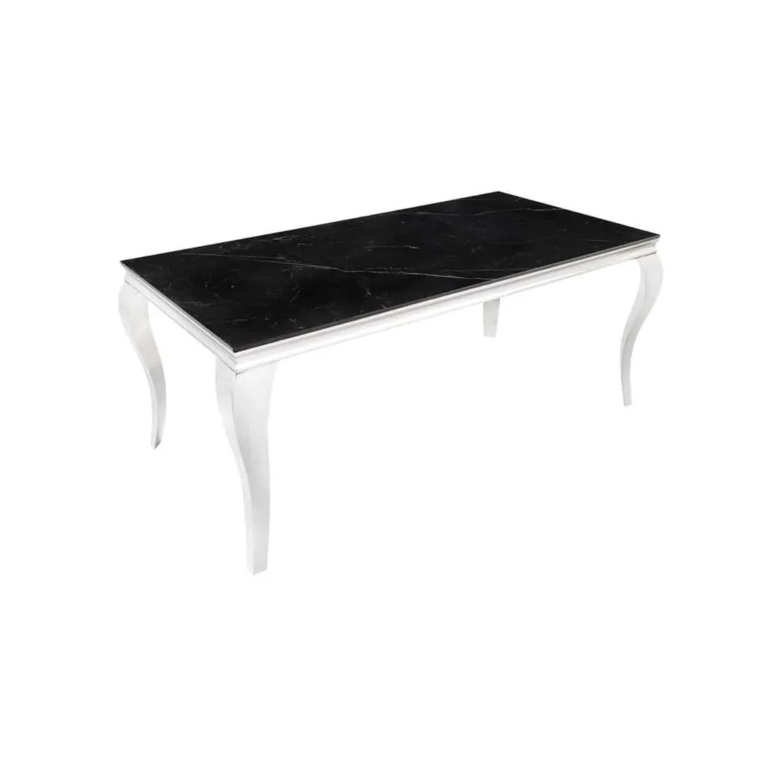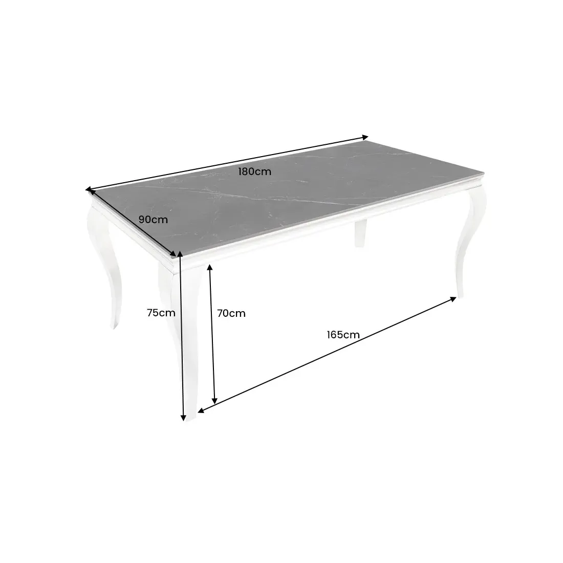 Les pieds en acier inoxydable poli, à la silhouette galbée, évoquent le style baroque tout en l’inscrivant dans une esthétique contemporaine. Avec ses 180 cm de long et une profondeur de 90 cm, cette table offre un espace généreux pour les repas en famille, entre amis ou pour des dîners élégants.