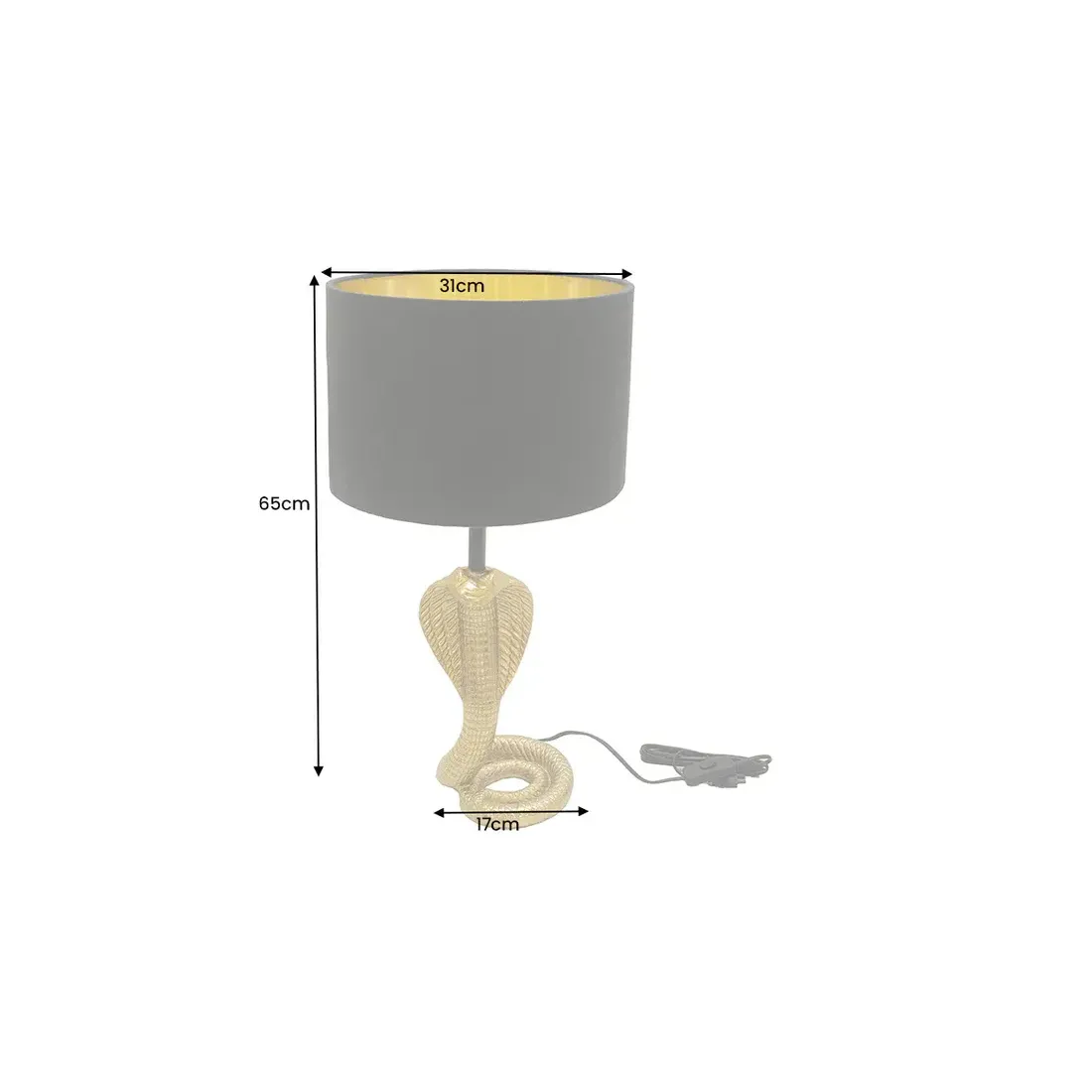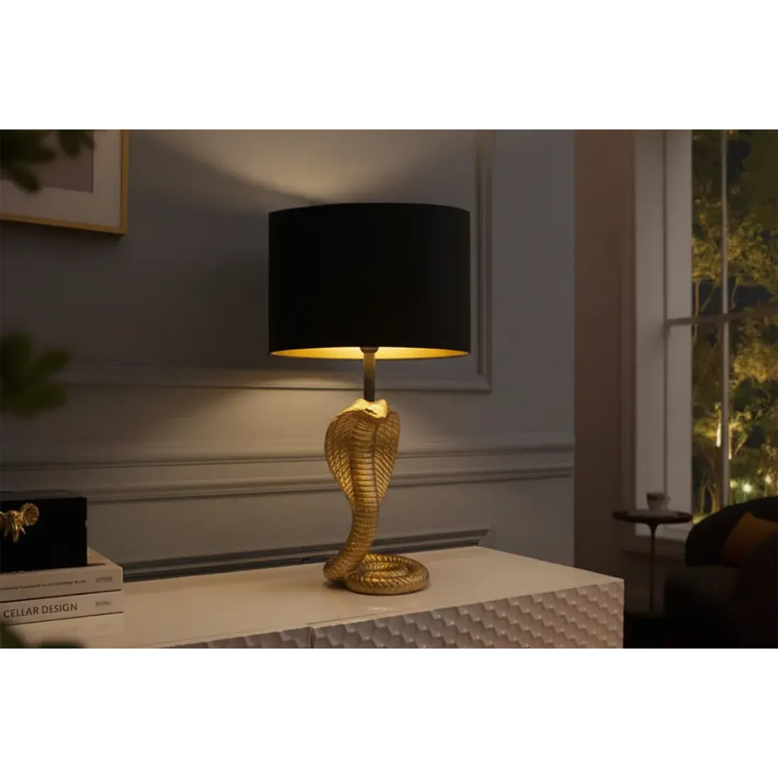 La lampe de table COBRA 65 cm associe un abat-jour noir en tissu à une structure en métal doré , créant une lampe de table élégante au style moderne et raffiné. Idéale pour un bureau, une table de chevet ou un coin salon , elle diffuse une lumière douce et apporte une touche décorative sculpturale à l'intérieur.