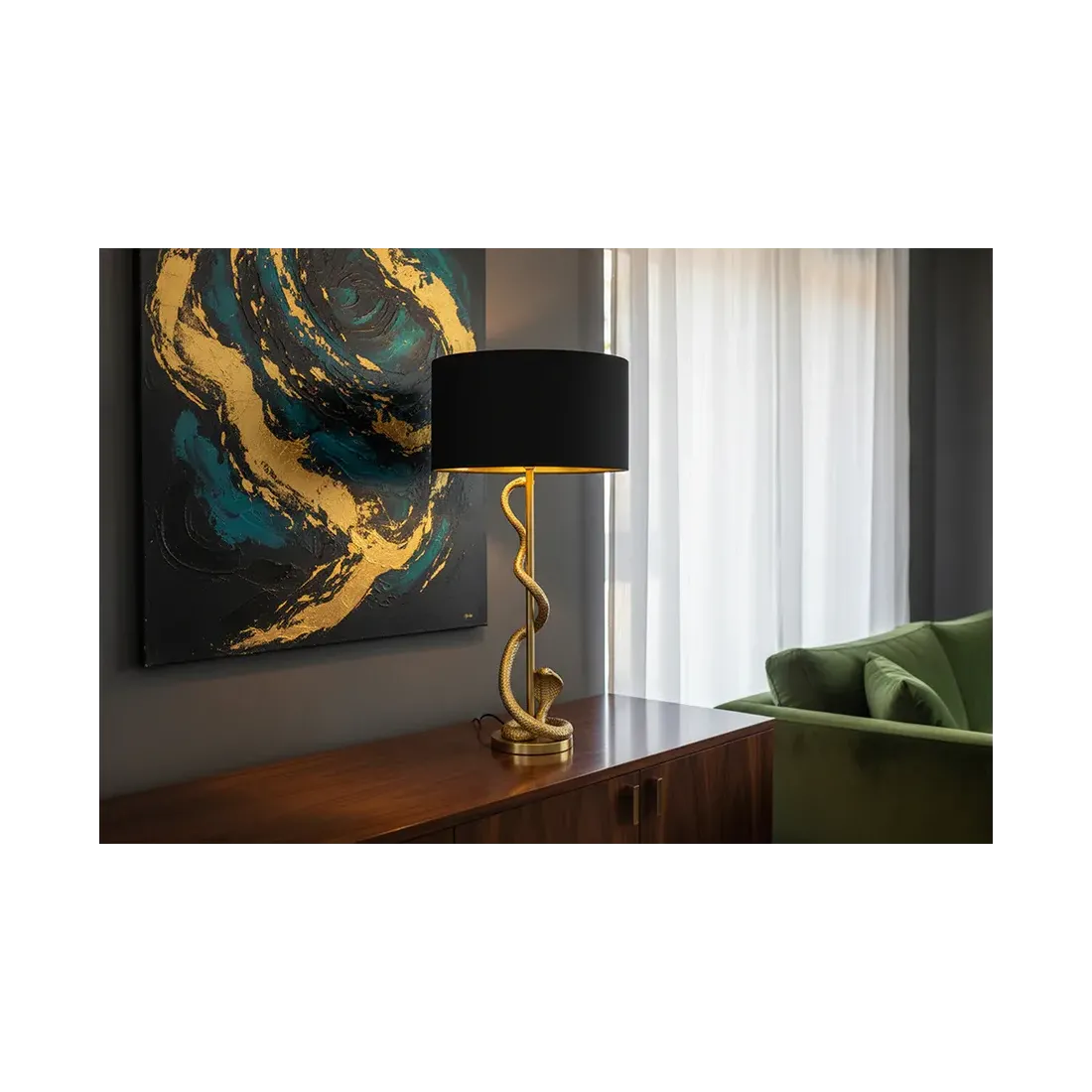 La lampe de table COBRA 110 cm associe un abat-jour noir élégant à une structure en métal doré , créant une lampe de table au style raffiné et affirmé . Pensée pour les bureaux, buffets et espaces de vie , elle diffuse une lumière chaleureuse tout en apportant une présence sculpturale et luxueuse .