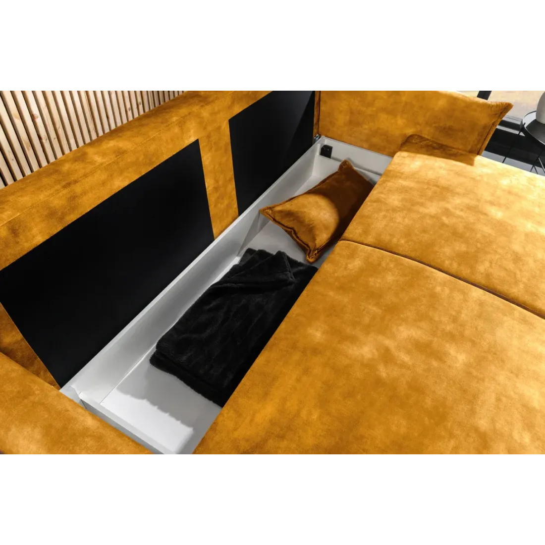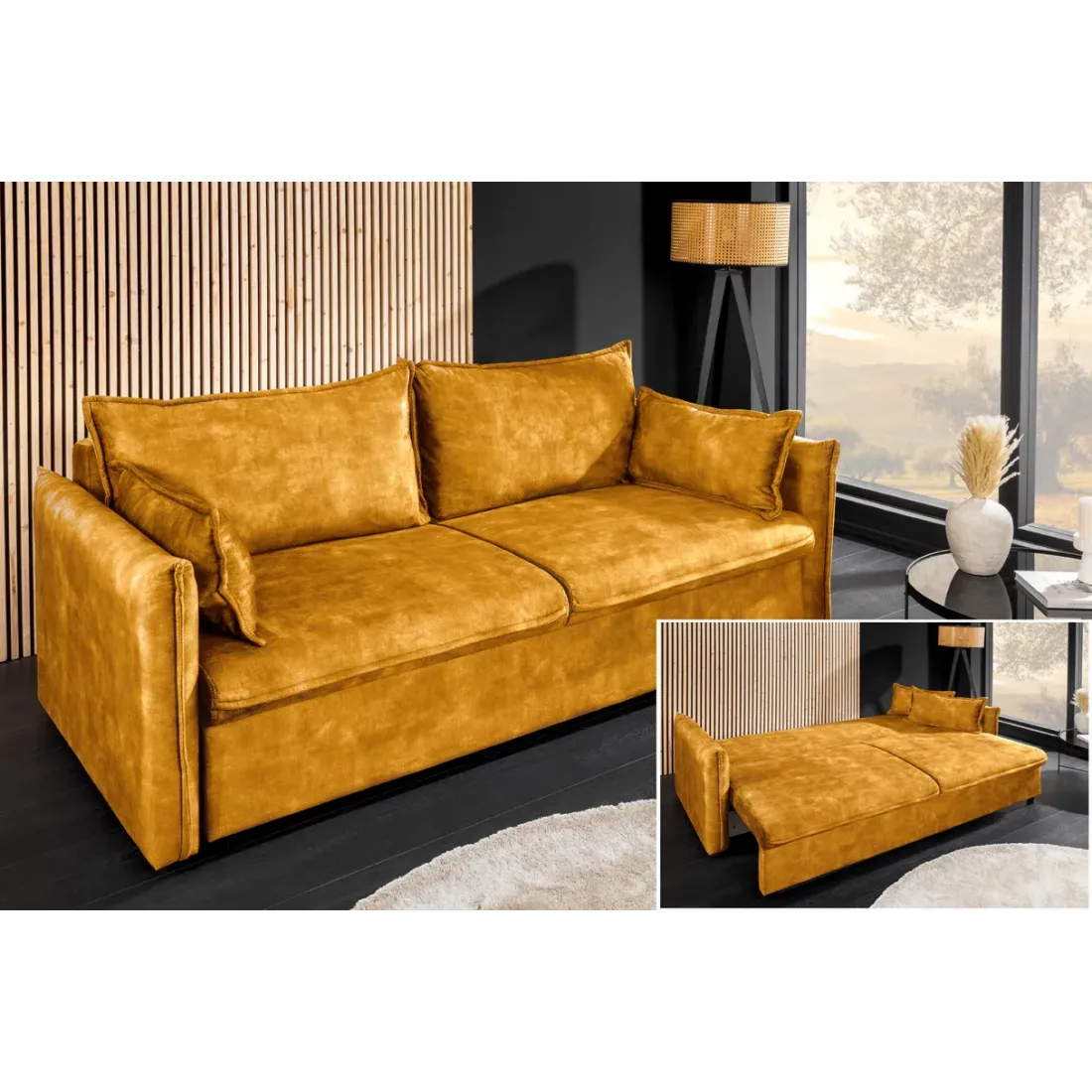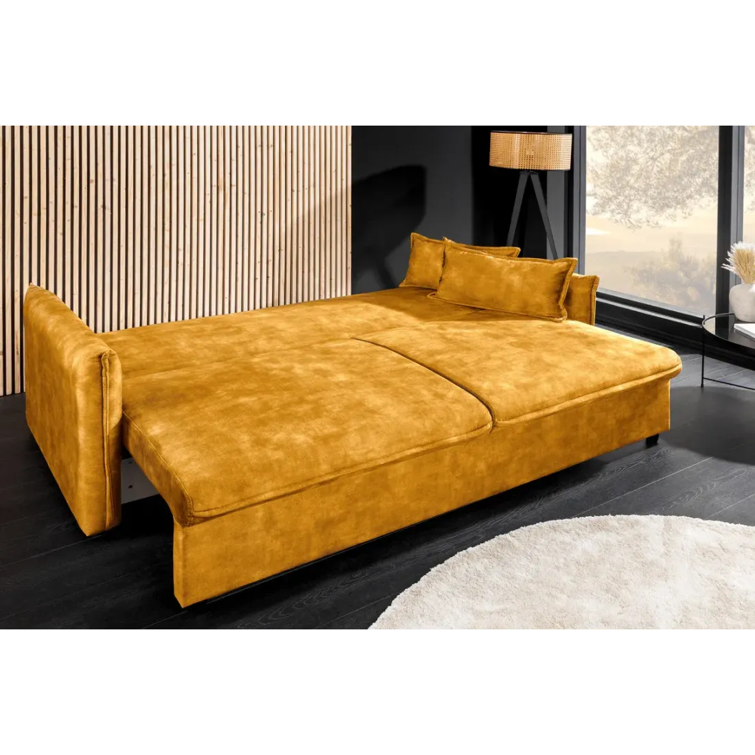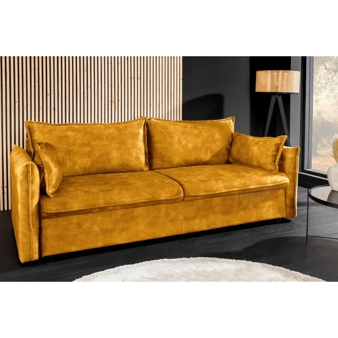 Le canapé-lit APARTMENT 215 cm allie élégance moderne et fonctionnalité. Son revêtement en velours doux, son couchage confortable et ses rangements intégrés en font la solution idéale pour un salon stylé et pratique. Disponible en gris ou jaune moutarde.