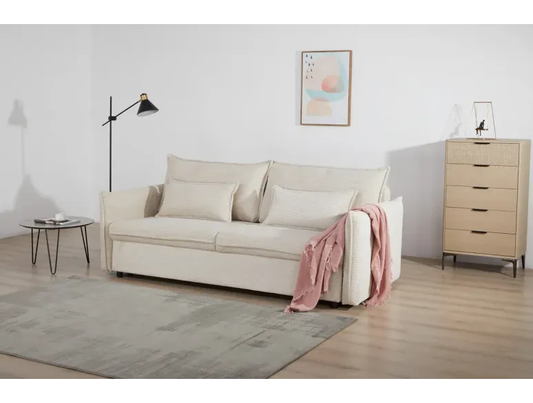 Le canapé-lit APARTMENT 215 cm allie élégance moderne et confort optimal. Son revêtement en velours côtelé moelleux et son garnissage à ressorts offrent une assise agréable et un couchage pratique. Disponible en beige, il apporte style et fonctionnalité à votre salon.