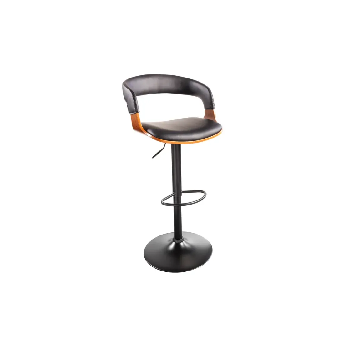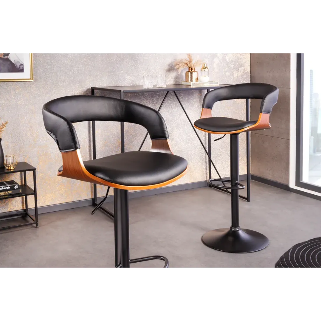 Le tabouret de bar MANHATTAN est pensé pour offrir une assise confortable et un design raffiné au quotidien. Son similicuir noir apporte une touche moderne et facile d’entretien, tandis que l’assise en placage de noyer véritable ajoute une note chaleureuse et naturelle. Grâce à sa conception pivotante et à sa hauteur réglable de 64 à 85 cm, il s’adapte parfaitement aux bars et îlots de cuisine. Sa structure en métal revêtu de poudre assure stabilité et durabilité, et le repose-pieds réglable améliore le confort lors des moments prolongés autour du comptoir.