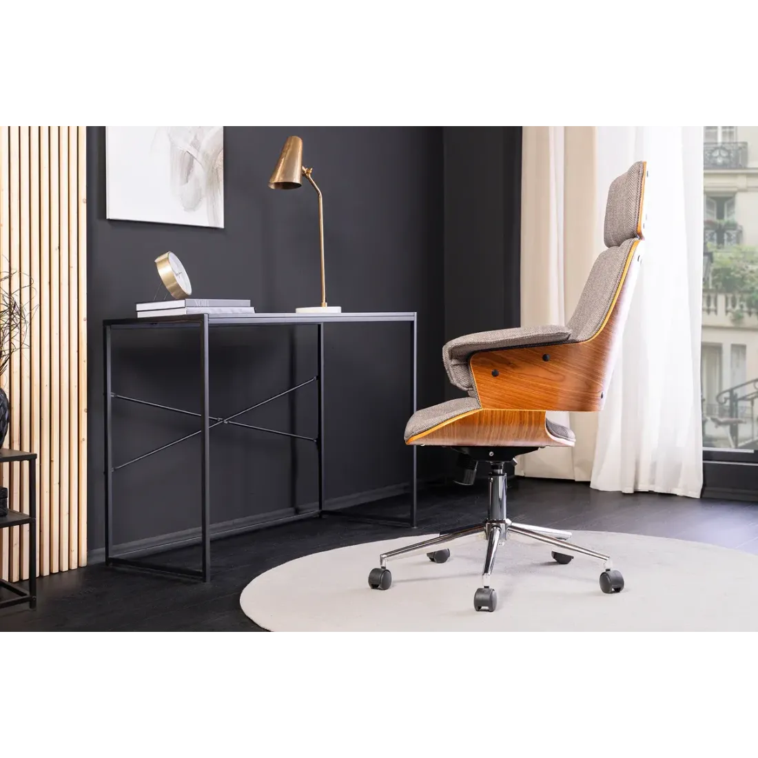 La chaise de bureau MANHATTAN associe un tissu texturé gris élégant à un placage en bois de noyer véritable pour offrir une assise moderne, confortable et parfaitement adaptée aux espaces de travail contemporains. Son design pivotant et ses finitions soignées en font un choix idéal pour un bureau à la fois fonctionnel et esthétique.