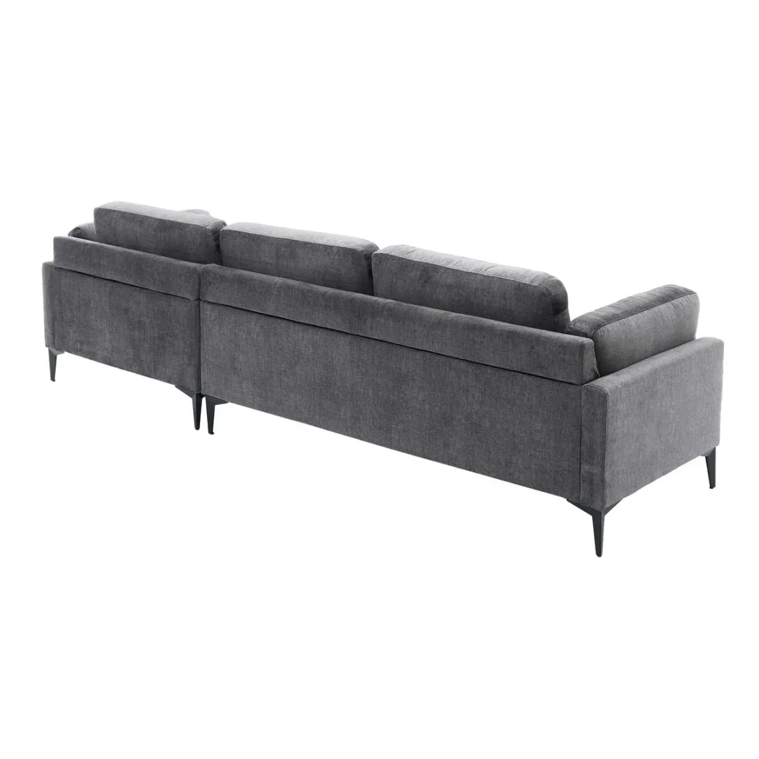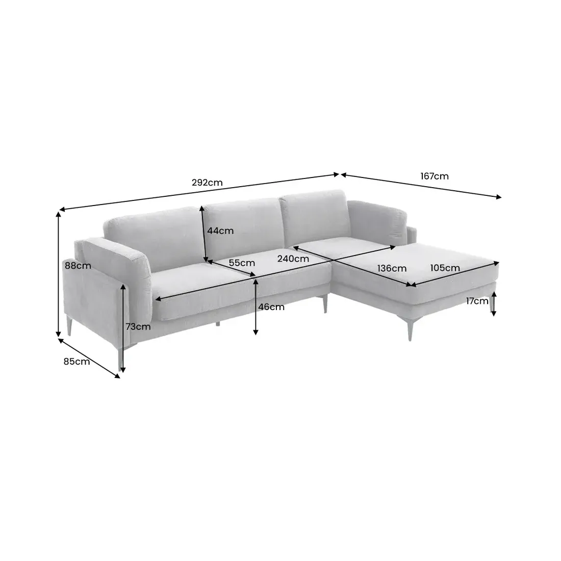 Grâce à sa grande assise et à son pouf droit intégré, il permet de s'étendre progressivement tout en structurant l'espace du salon. Les pieds en métal noir, surélevés de 17 cm, apportent une touche moderne et assurent une excellente stabilité.