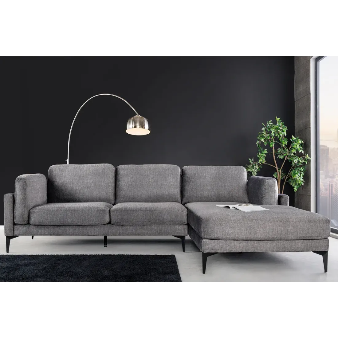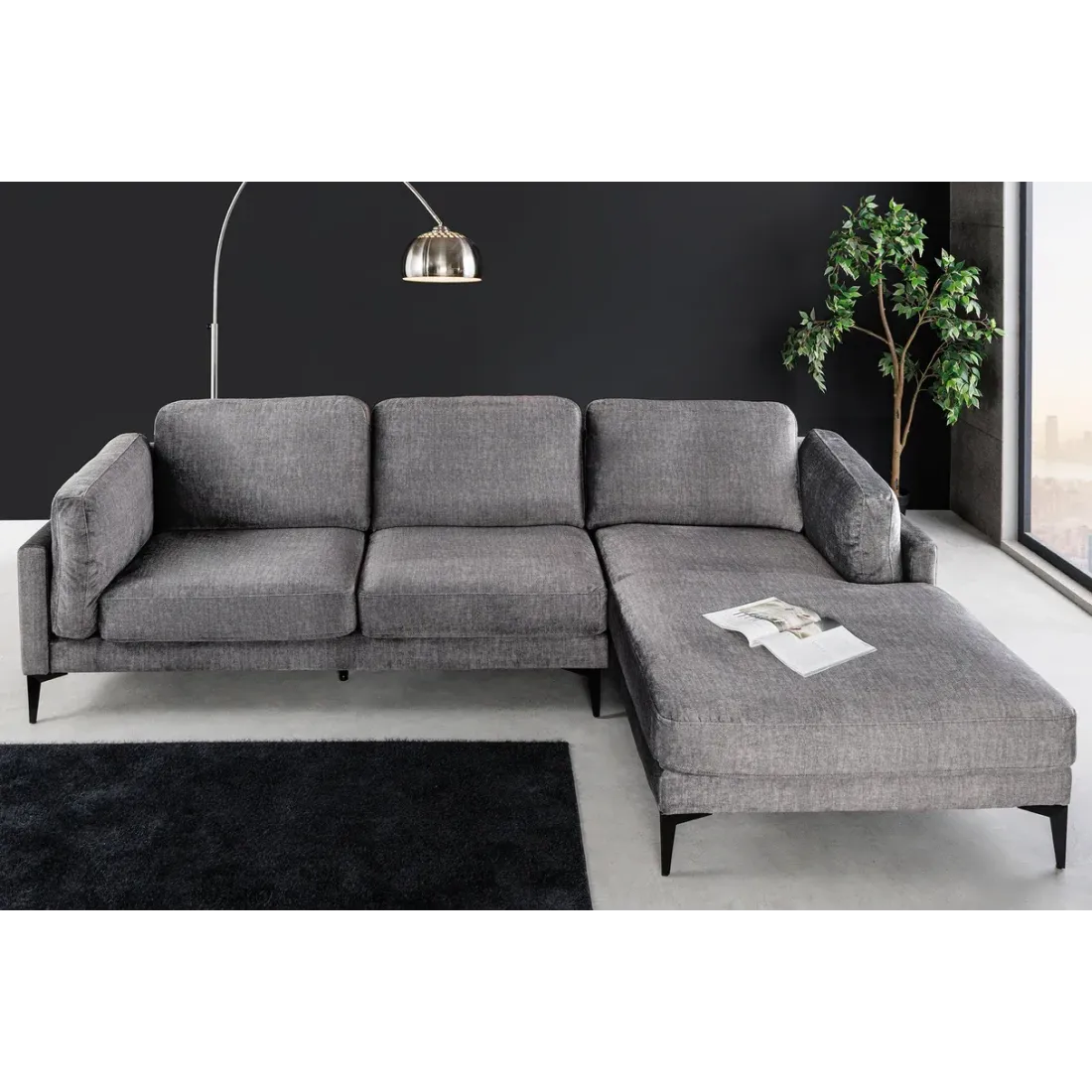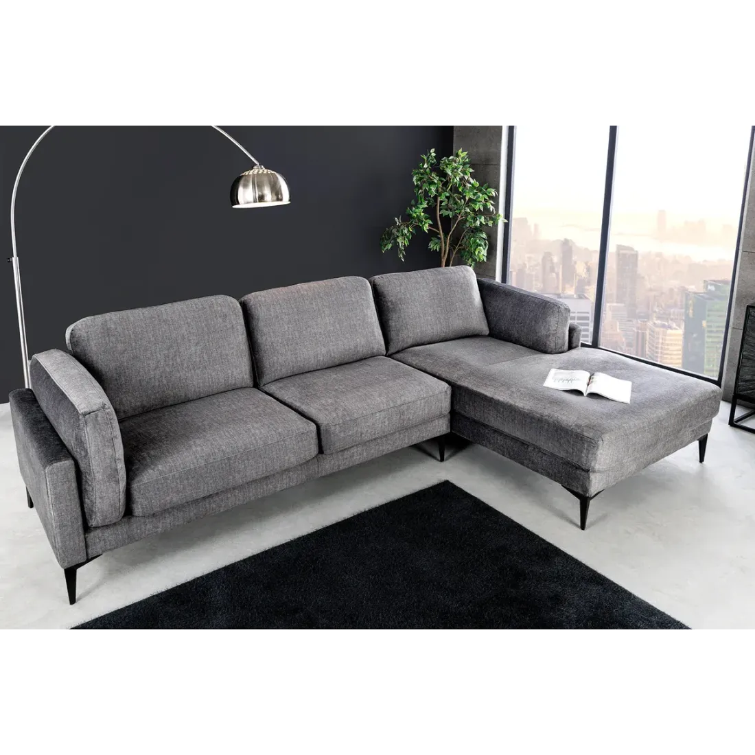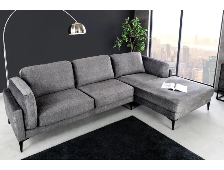 Le canapé d'angle MANHATTAN en velours gris foncé séduit par son design moderne et ses lignes généreuses. Doté d'un pouf droit spacieux et de pieds en métal noir, il offre un confort optimal et devient naturellement la pièce centrale de votre salon.