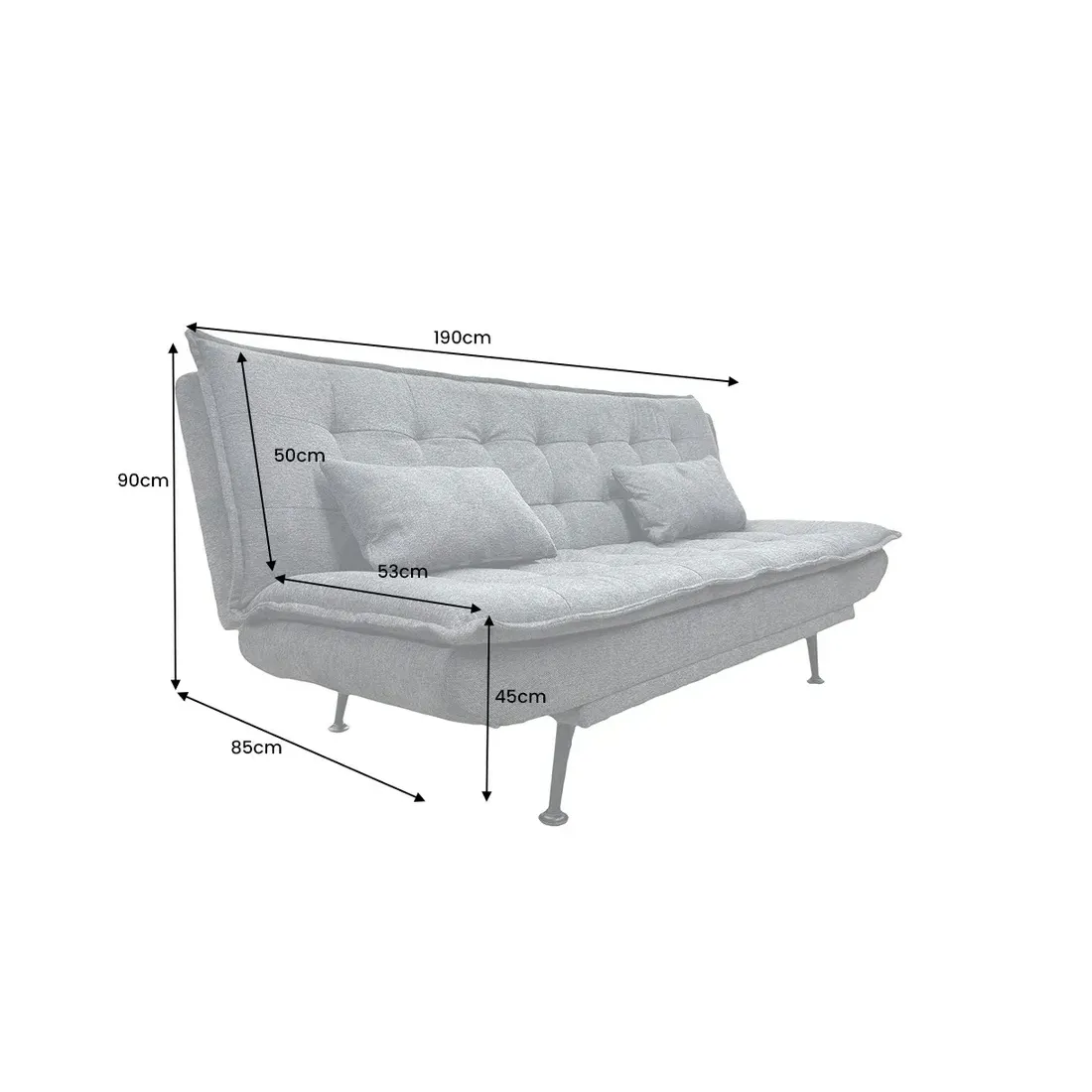 La structure en bois de pin et les pieds en métal noir assurent stabilité et robustesse, tandis que le format compact et la surface de couchage de 190 × 110 cm permettent de transformer rapidement votre salon en espace modulable pour dormir ou se détendre.