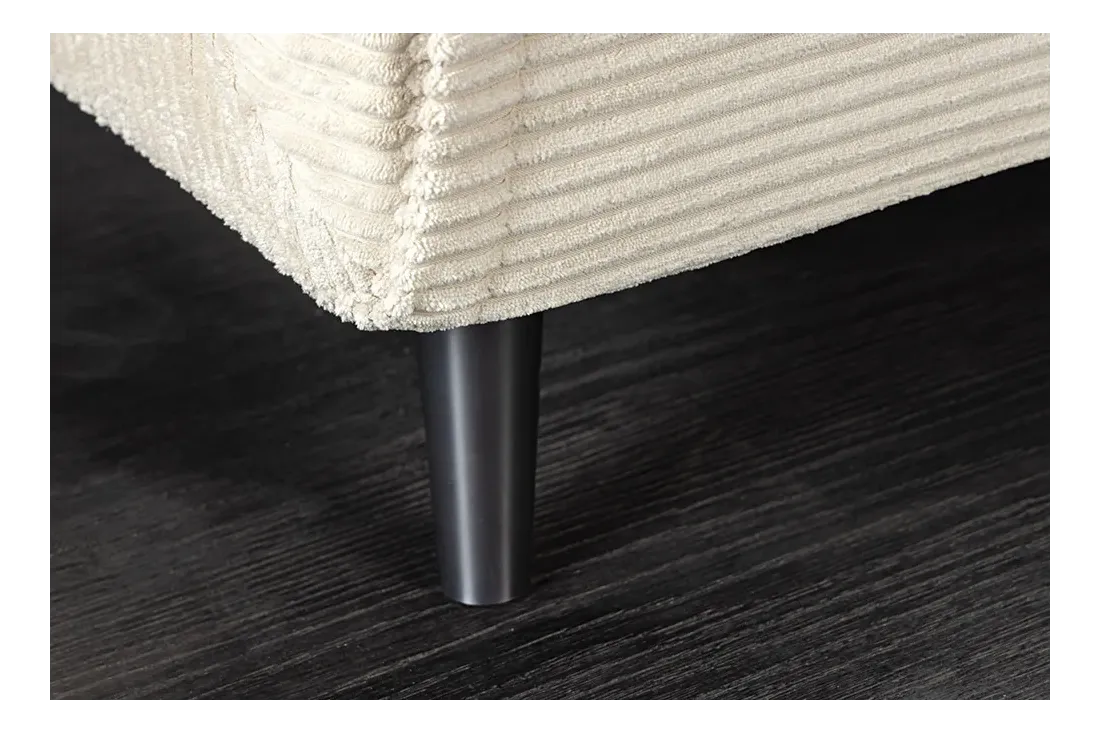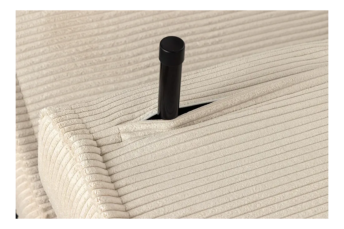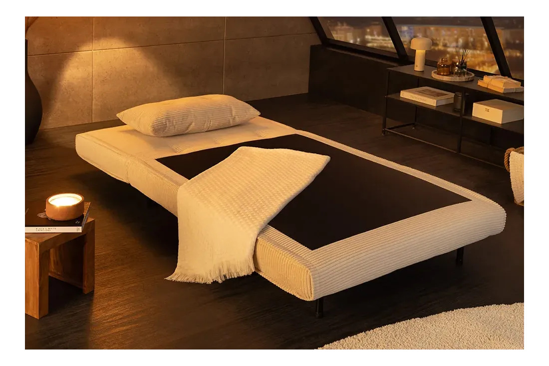 En position fauteuil, il offre un siège confortable pour travailler, lire ou regarder un film. D'une simple manipulation, il s'allonge en surface de couchage de 191 cm, suffisante pour une nuit de qualité. Le velours côtelé — 90 % polyester, 10 % nylon — apporte une texture chaleureuse et résiste à l'usage quotidien.