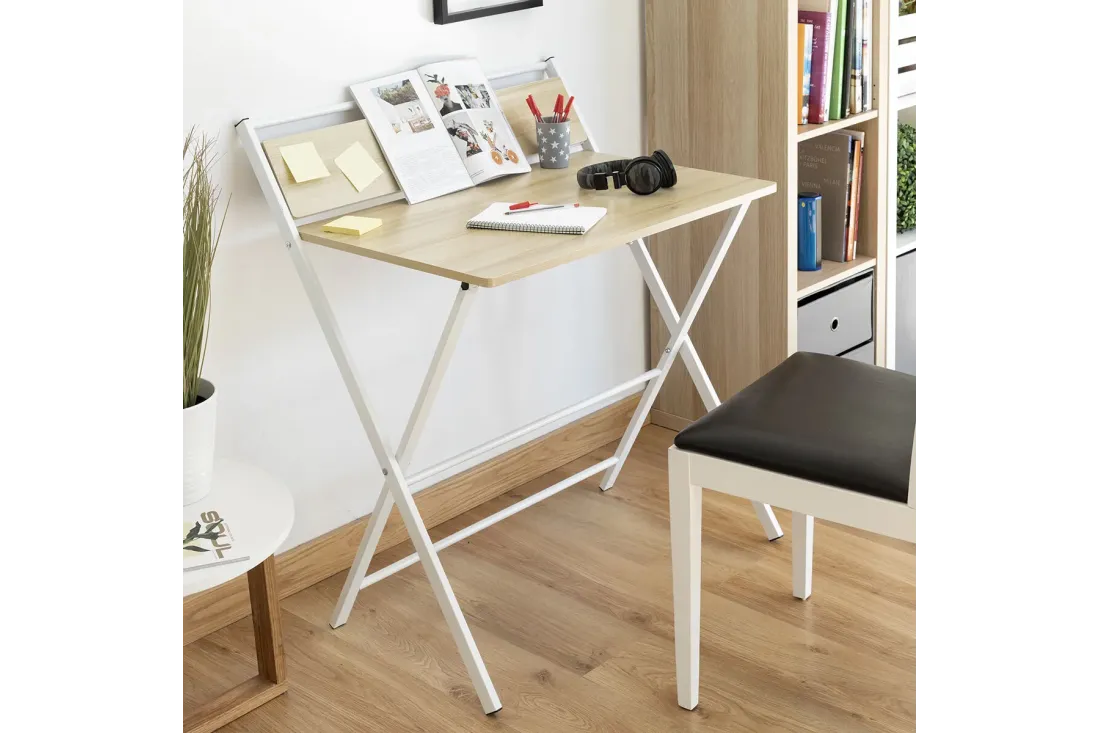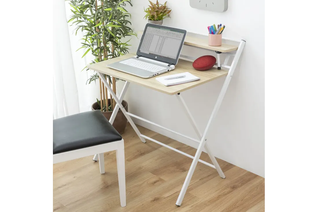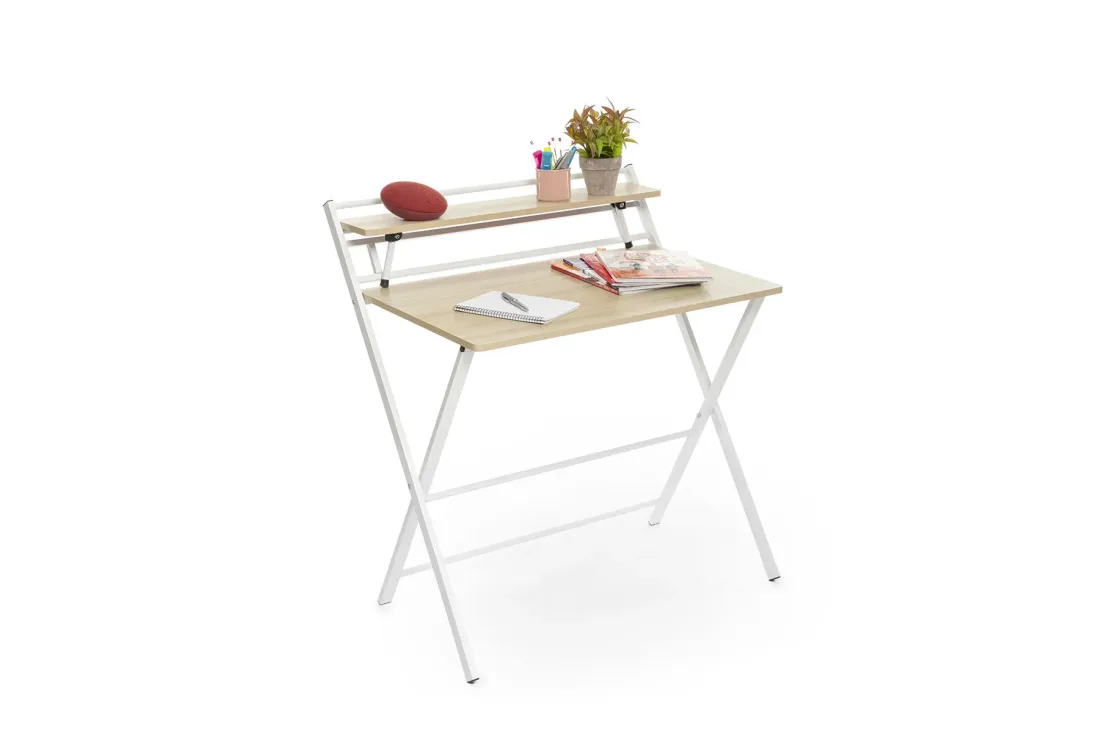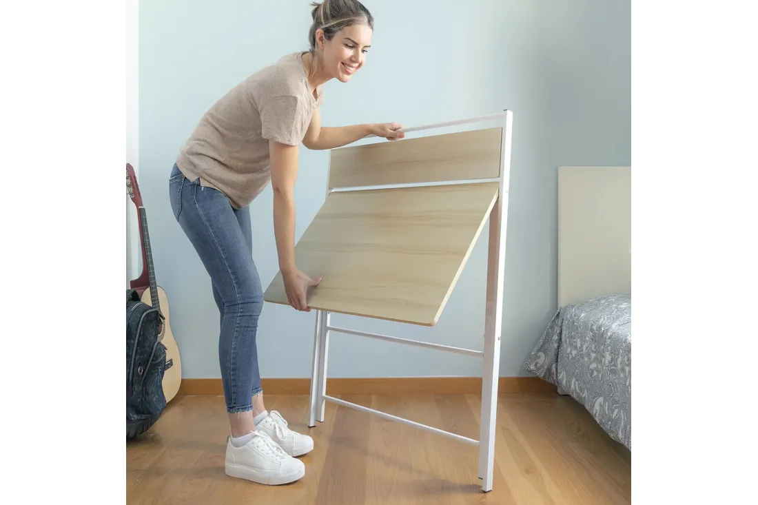 Bureau pliable multifonction avec étagère intégrée rabattable. Zéro montage : il se déplie et se replie en quelques secondes. Plié, il n'occupe que 3 cm d'épaisseur — glisse sous un lit, derrière une porte ou dans une armoire. Supporte jusqu'à 50 kg. Disponible en blanc et beige.