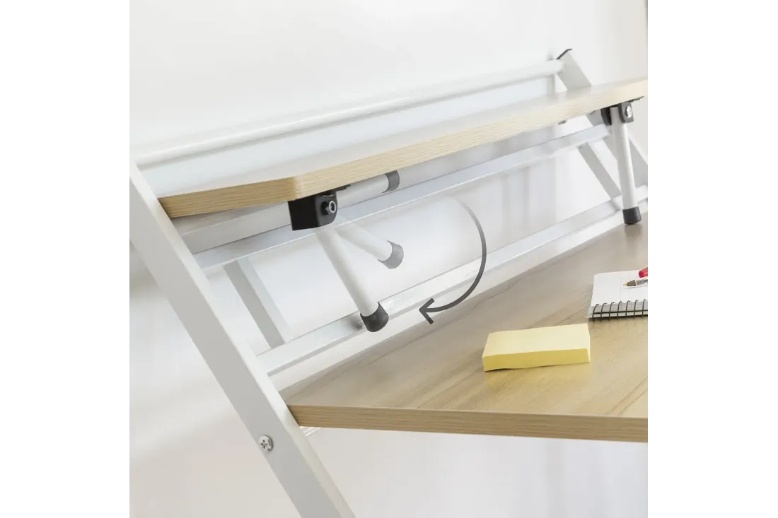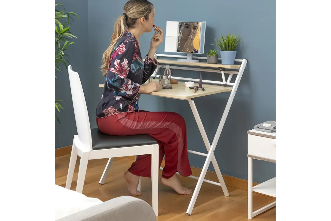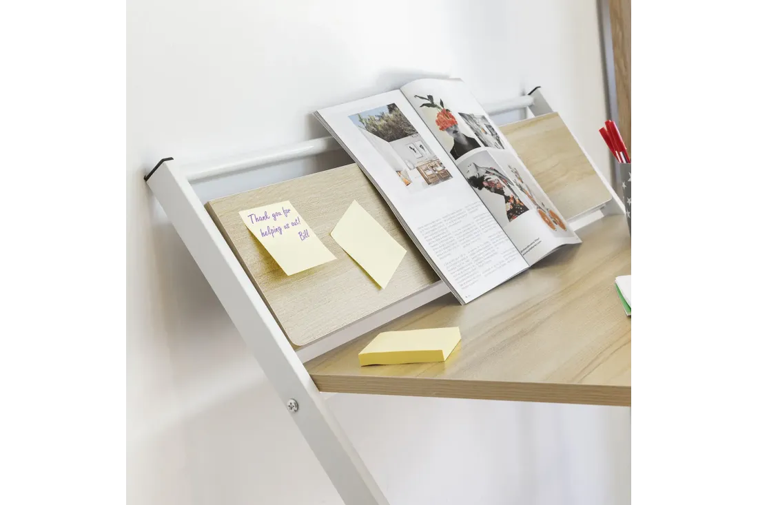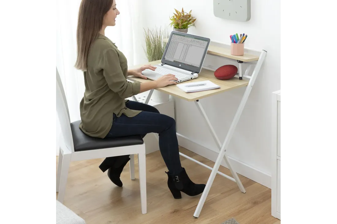 Bureau pliable multifonction avec étagère intégrée rabattable. Zéro montage : il se déplie et se replie en quelques secondes. Plié, il n'occupe que 3 cm d'épaisseur — glisse sous un lit, derrière une porte ou dans une armoire. Supporte jusqu'à 50 kg. Disponible en blanc et beige.