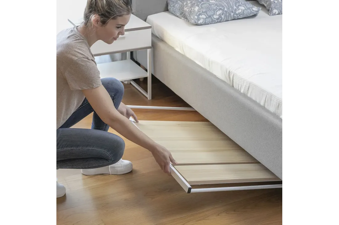 Vous n'avez pas de pièce dédiée au bureau ? Ce n'est plus un problème. Le Bureau Pliable Tablezy se déplie en quelques secondes pour devenir un vrai poste de travail, et se replie à 3 cm d'épaisseur seulement — suffisamment fin pour disparaître sous un lit, derrière une porte ou contre le mur d'une armoire.