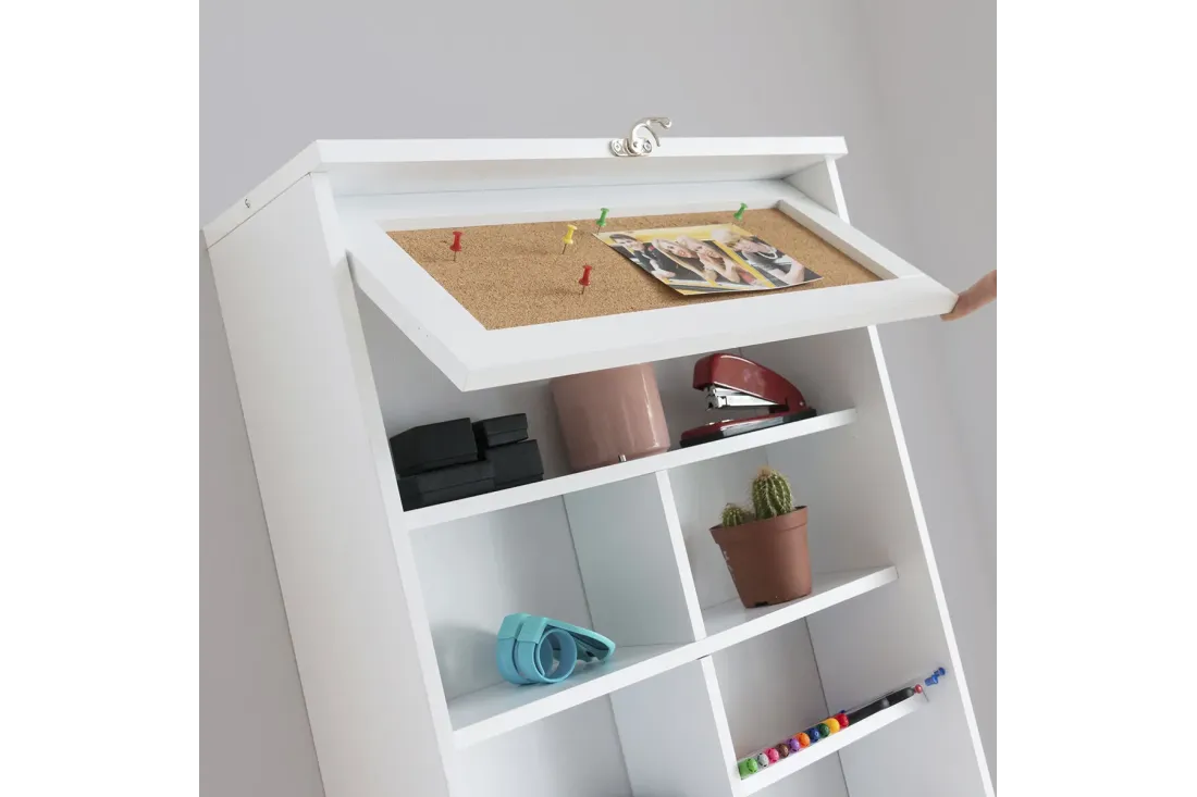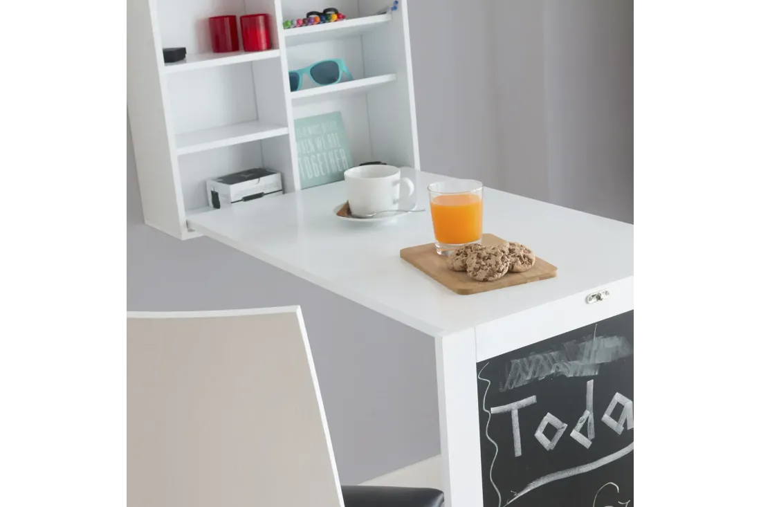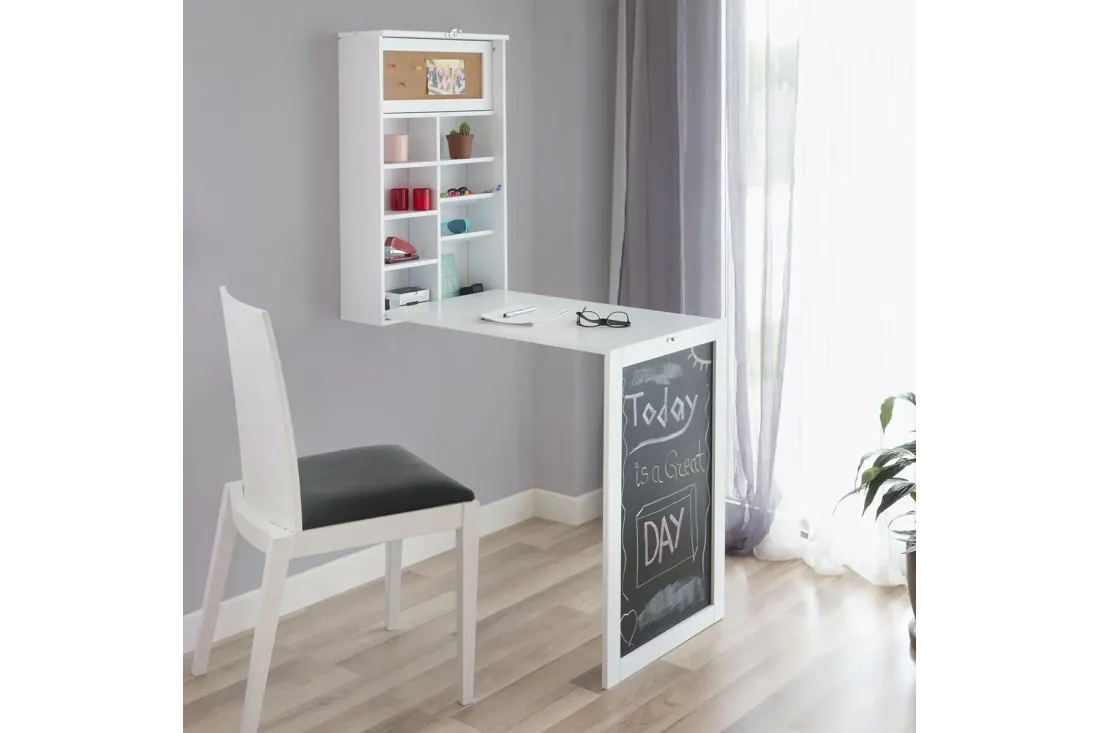 Bureau mural rabattable idéal pour les petits espaces. S'installe au mur en quelques minutes et se replie discrètement quand il ne sert pas. Intègre une ardoise (40×68 cm), un panneau en liège (40×14 cm) et des étagères pour livres et objets décoratifs. Accessoires de fixation inclus. Coloris blanc.